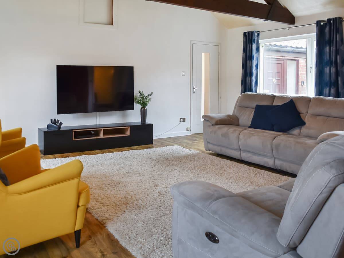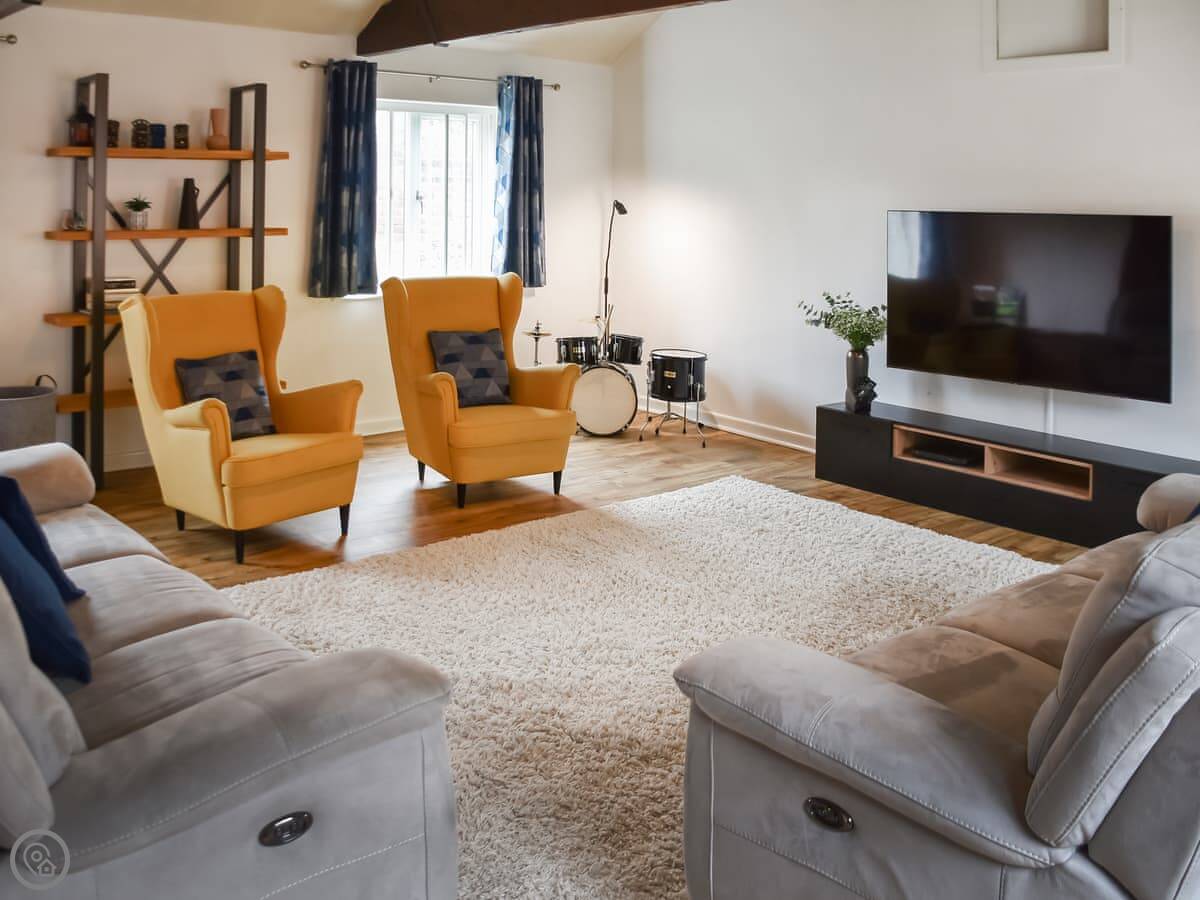 The space is all on one level, which people seem to like. The open plan kitchen and living area is big, so a group can all be in there together. The sofas recline. There's a cinema room with a projector and a pool table.