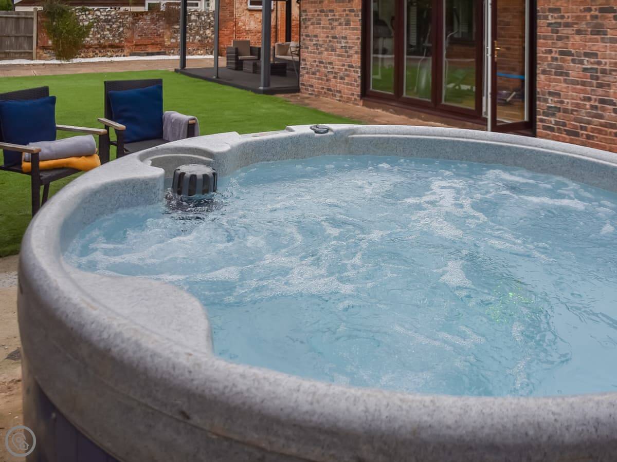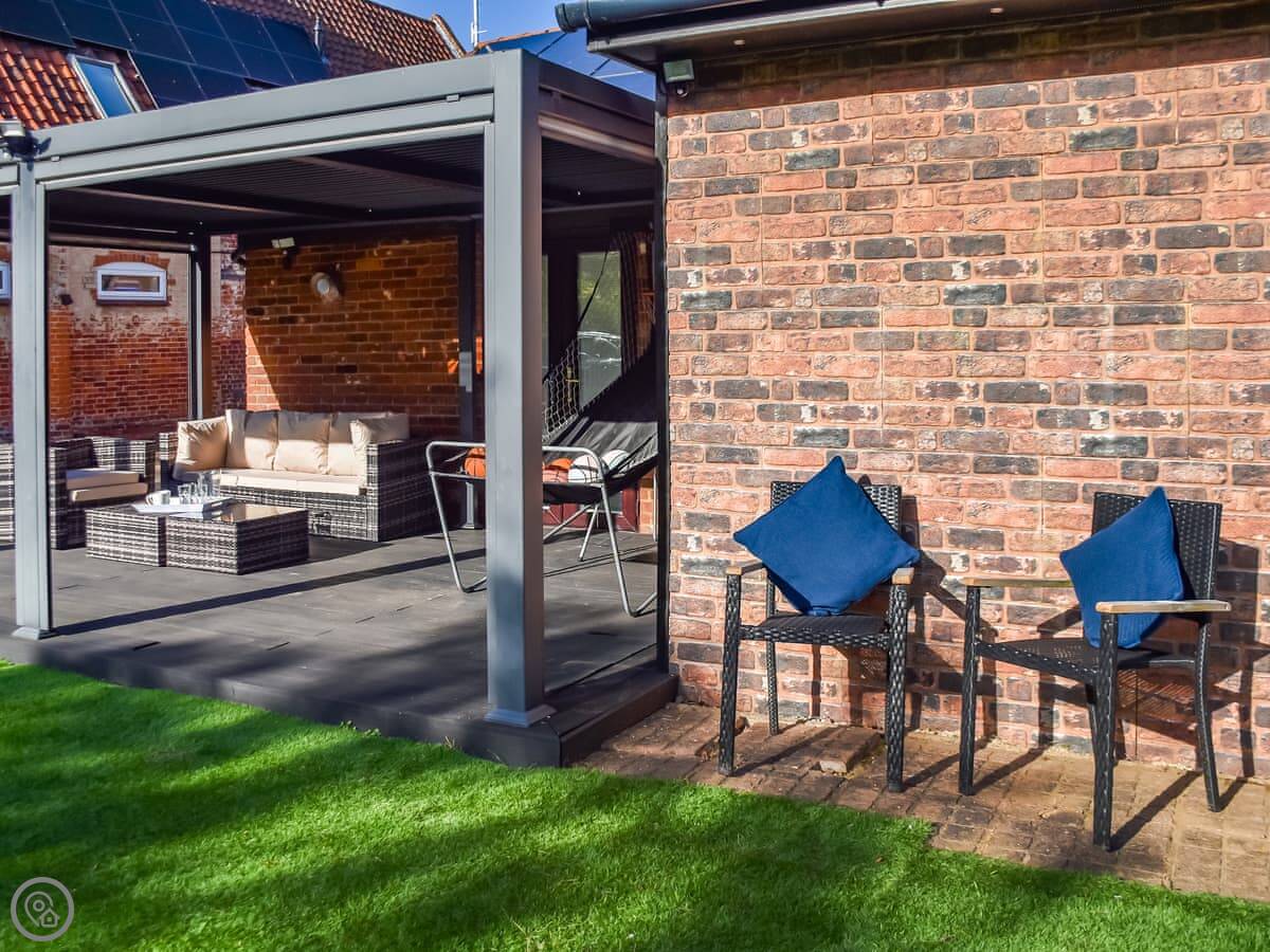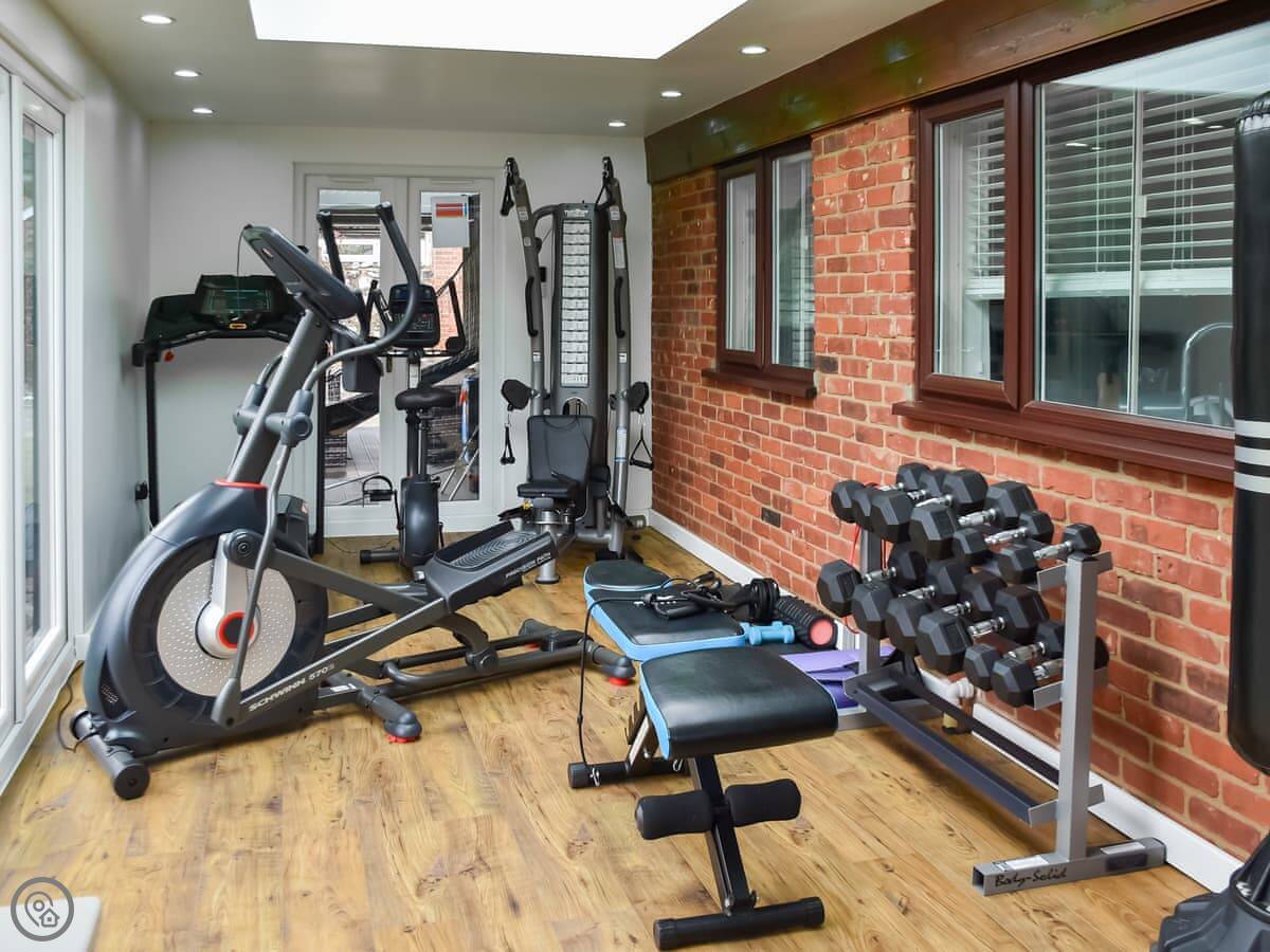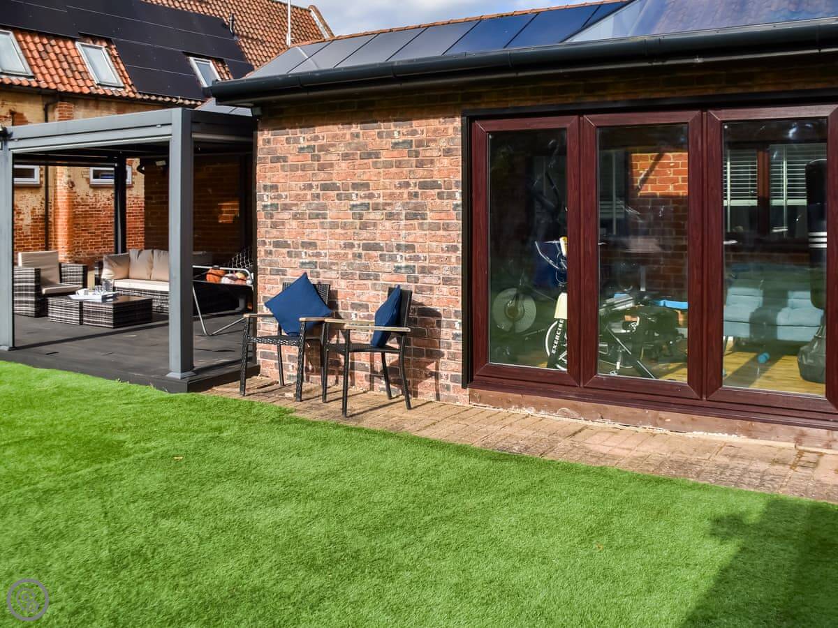 Outside, the garden is fully enclosed. It's got a big artificial turf area, which is good for dogs and kids. There's a putting green and a covered seating area with a hot tub. We put a gym in the outbuilding. It's got some weights and cardio machines.