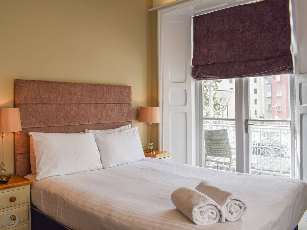 It sleeps six in three bedrooms, with one bathroom. There's a balcony off the living room with a table and chairs. It's got a 5 Star rating, which means it's well finished and everything's in good order. The building has a lift to all floors, so you don't have to worry about the stairs.