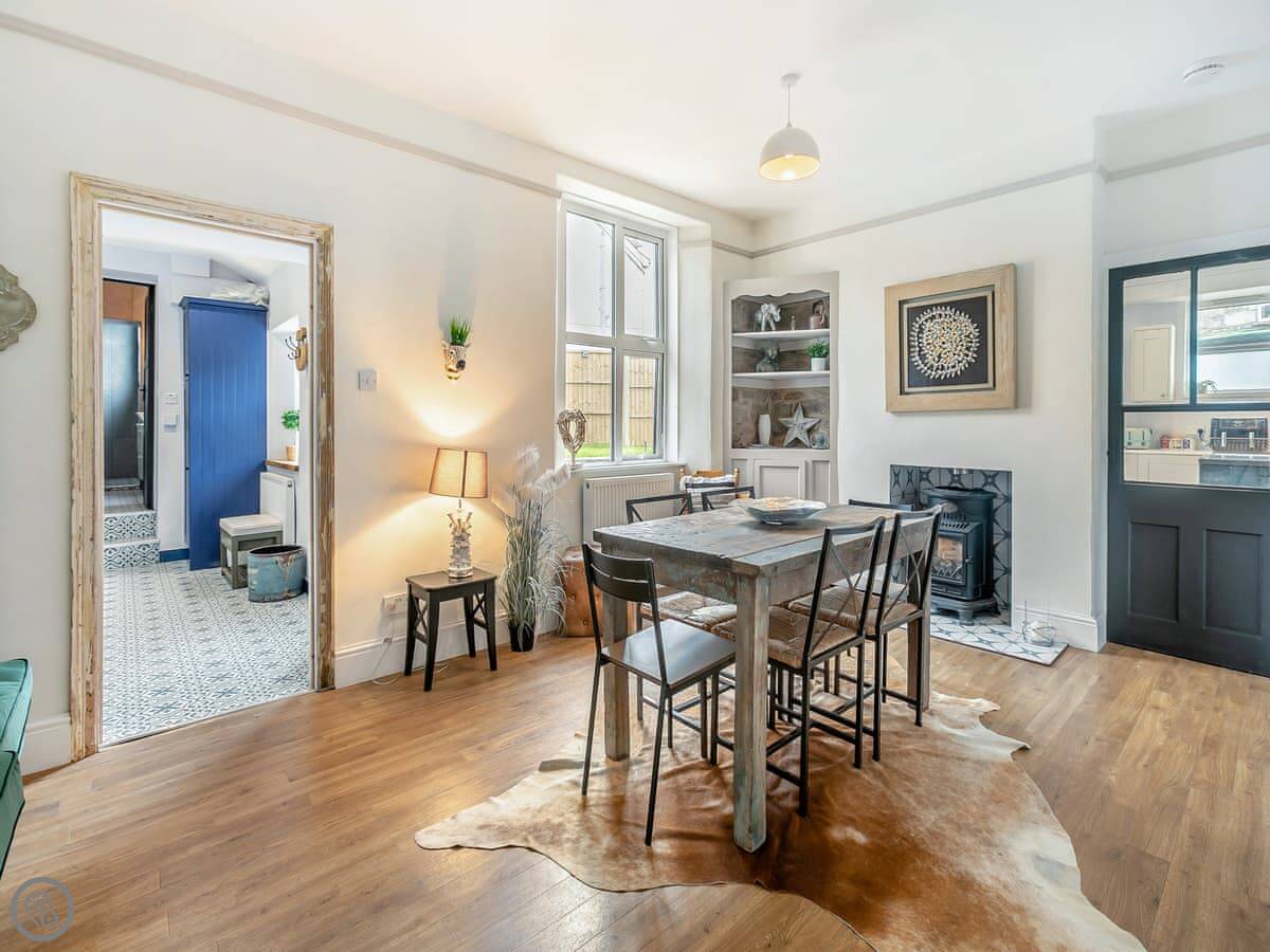 The kitchen is a good size and has a dishwasher and washing machine. There's a separate dining room. The living room has a woodburning stove.