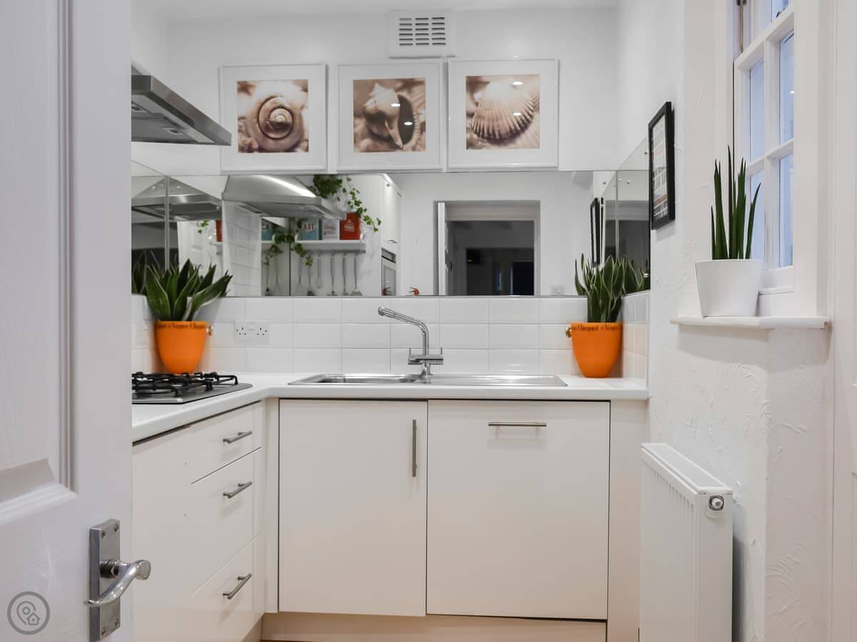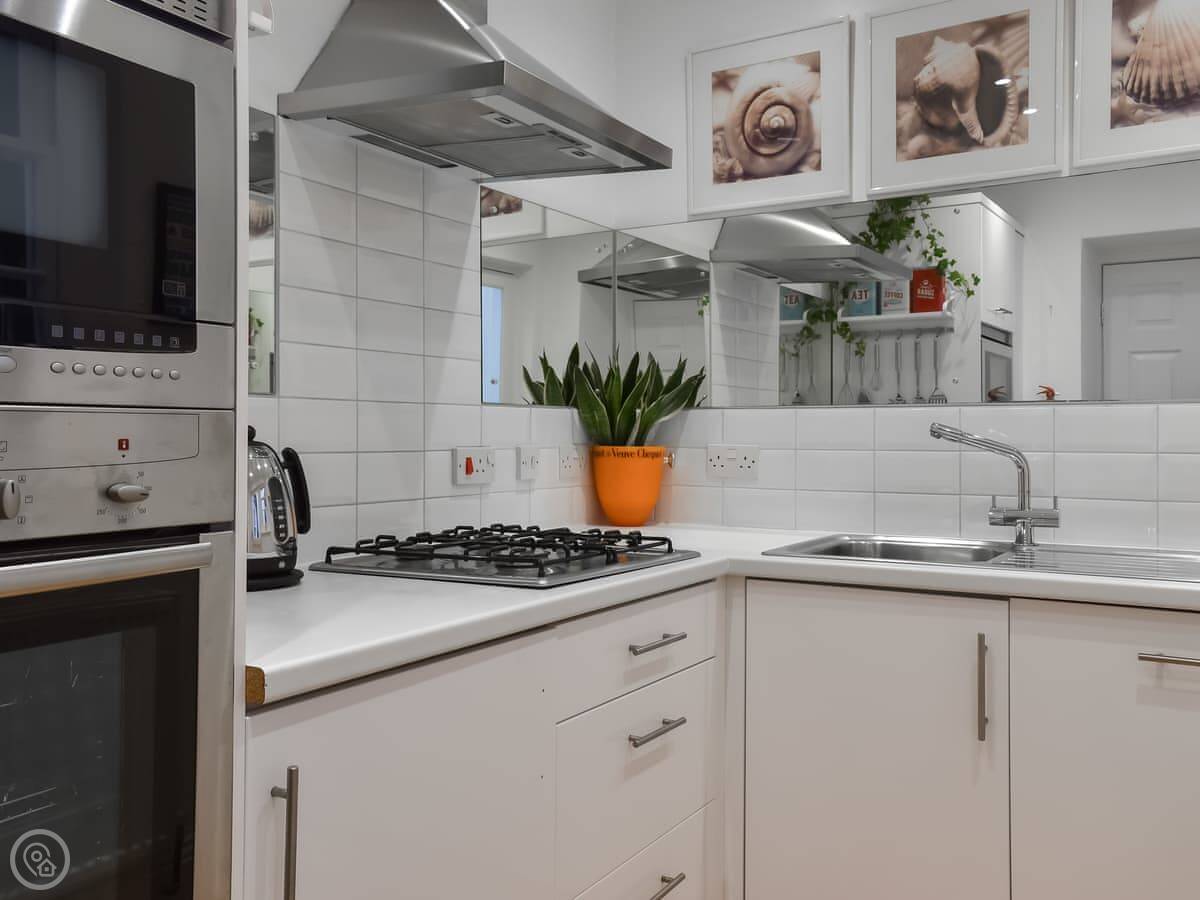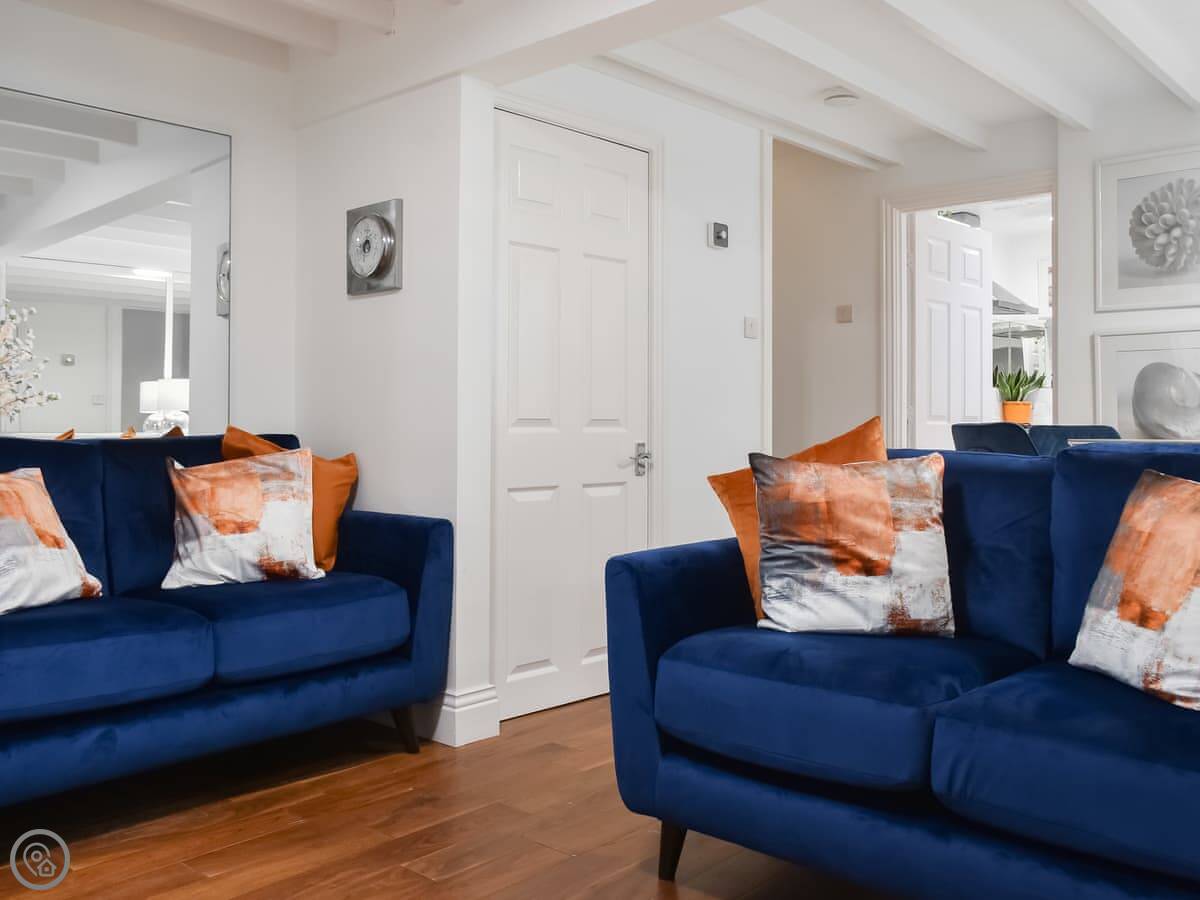 The living area is open plan with a gas fire. The kitchen looks out to a small, enclosed yard. There's an outhouse out there which is handy for storing wetsuits or beach gear. The beach is a short walk away.