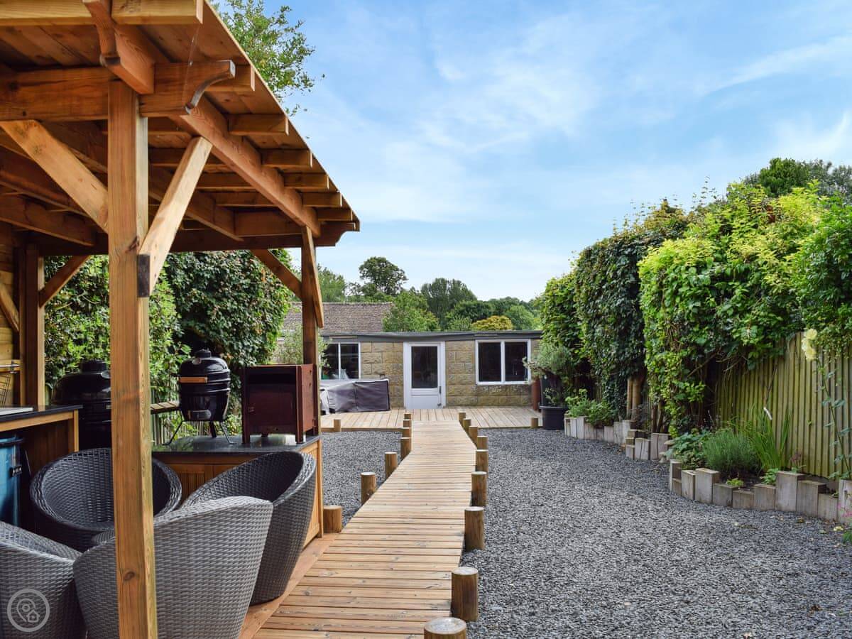 The kitchen's been done out well, with a dishwasher and a washing machine. There's a sunroom that makes a bright dining area. The garden is fully enclosed. There's decking and an outdoor kitchen area with a BBQ. It gets the sun.