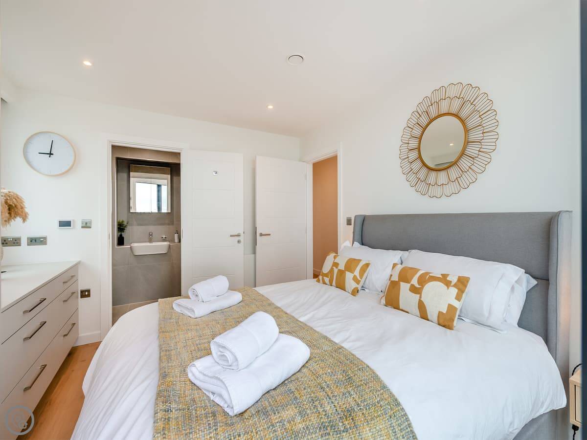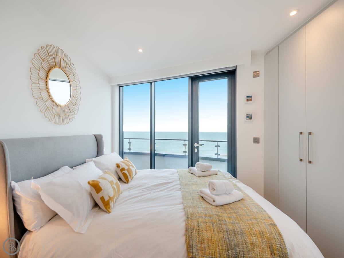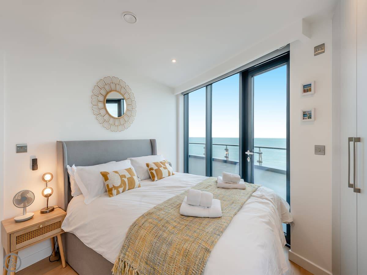 It's got two bedrooms and two bathrooms, so it sleeps four quite comfortably. It's a five star place, which means it's well finished and everything's in good order. The living area is open plan and there are big windows. You can see the sea from the main room.