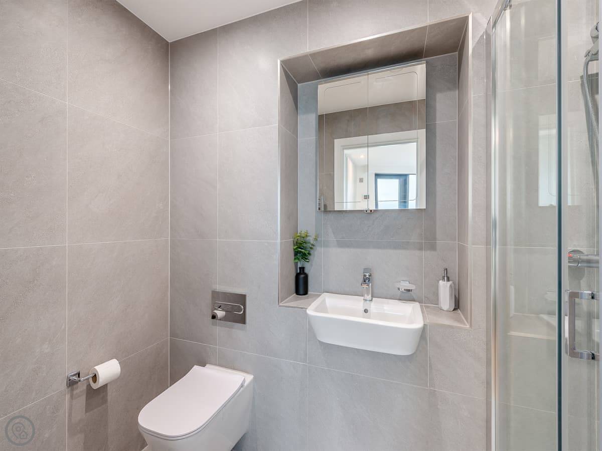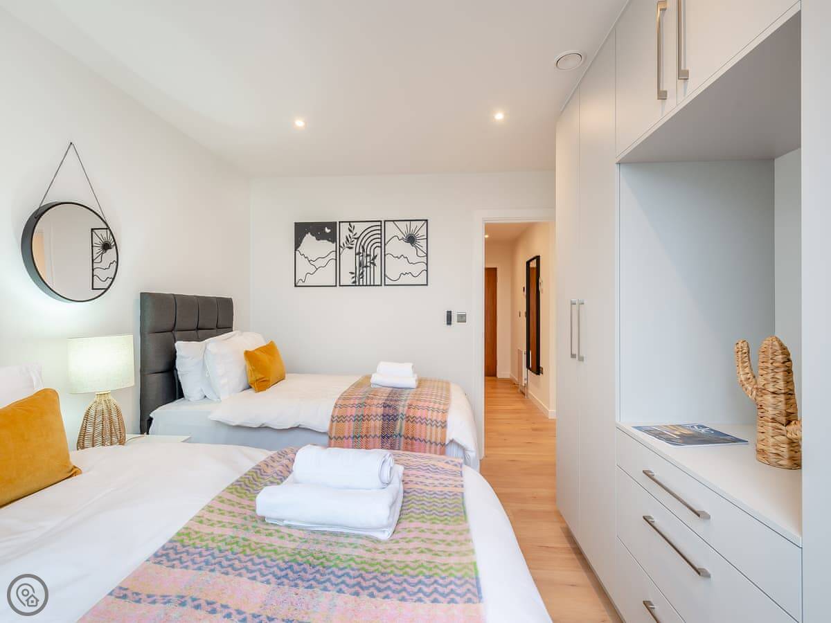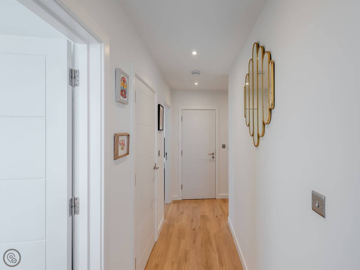 It's got two bedrooms and two bathrooms, so it sleeps four quite comfortably. It's a five star place, which means it's well finished and everything's in good order. The living area is open plan and there are big windows. You can see the sea from the main room.