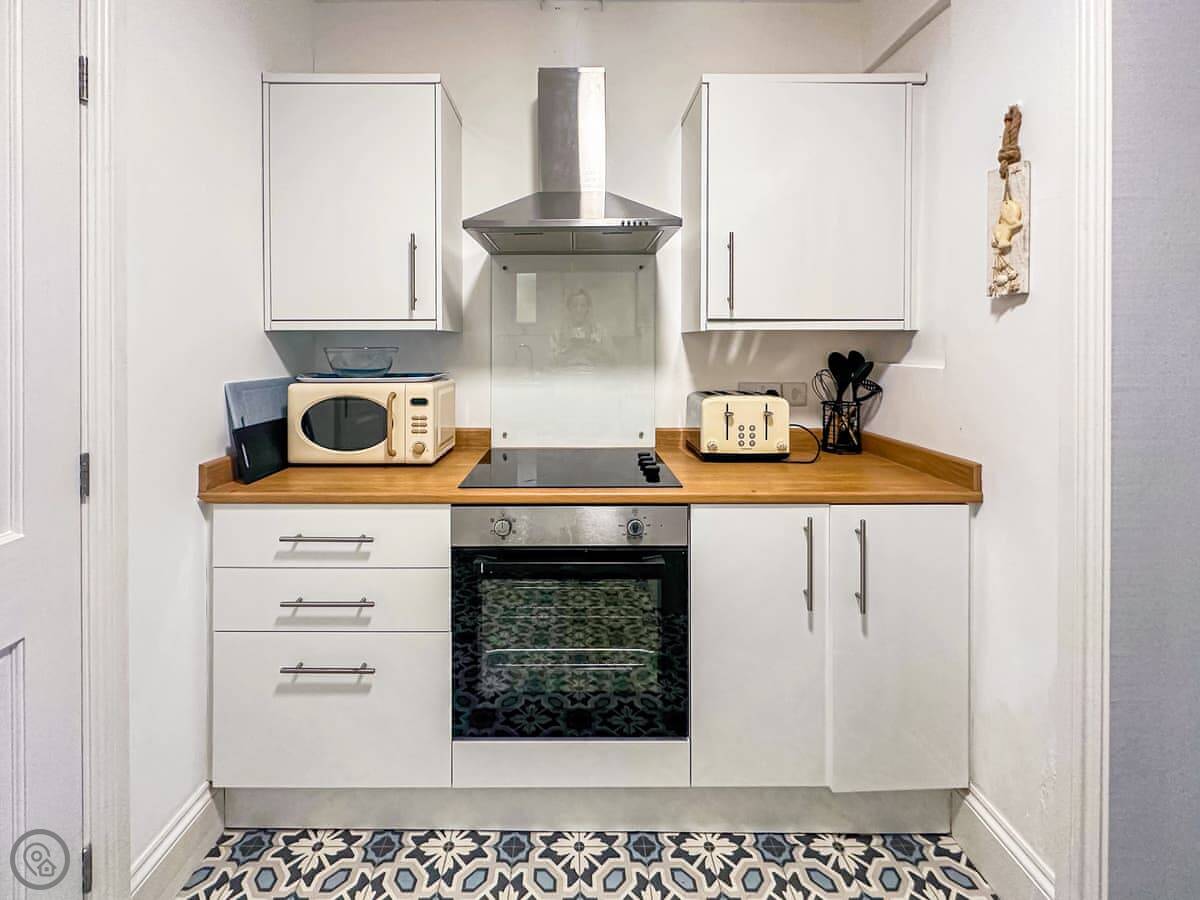 It's for two people. One bedroom with a standard double bed. One shower room. It's got a 3 Star rating, which is fine. Everything works and it's clean. The kitchen has what you need for basics.