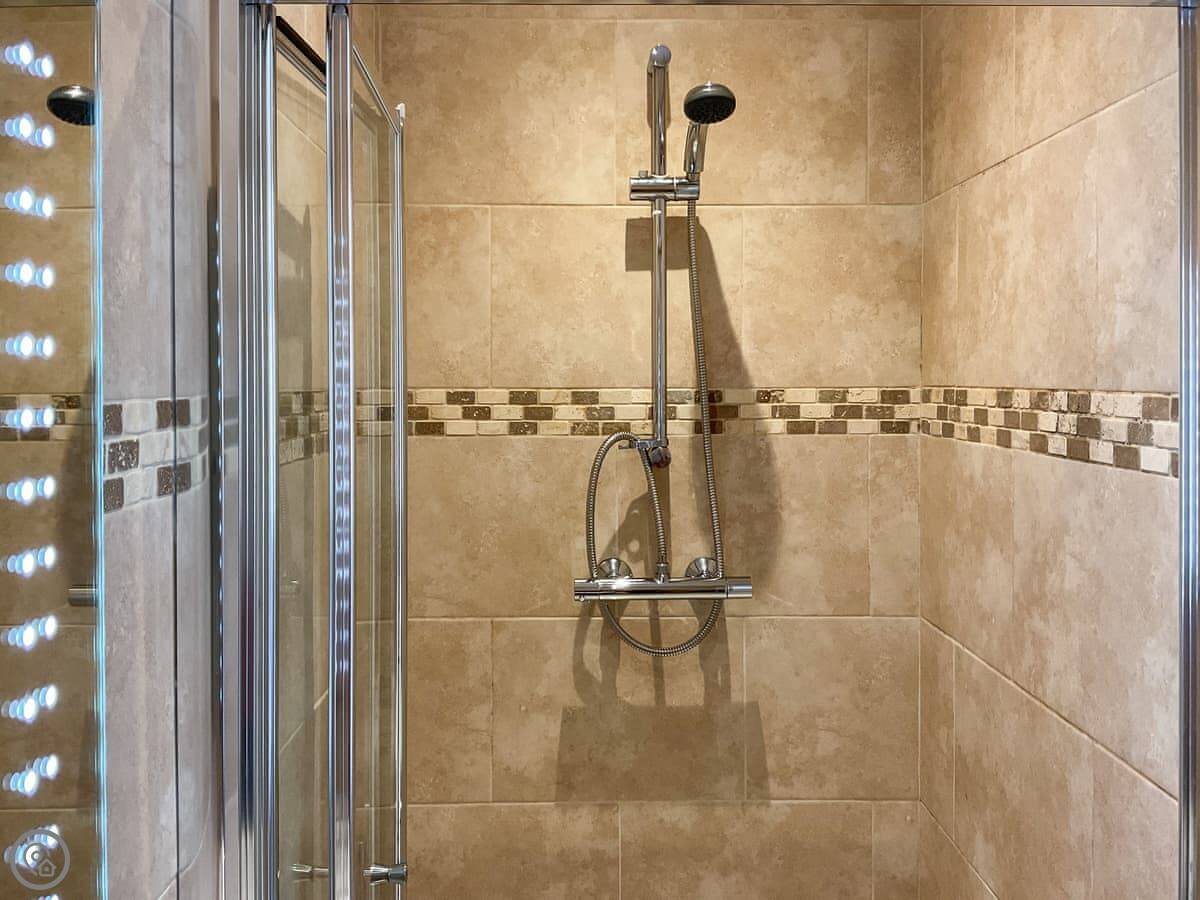 It sleeps four. Two bedrooms, two bathrooms, which is useful. It's got a 5 Star rating, which means it's well-equipped and smartly finished. The living and kitchen area is open plan. There's a washing machine, bedding and towels are provided, and you can park on site.