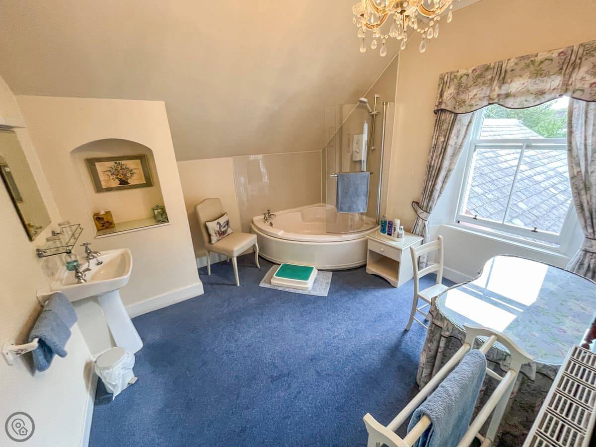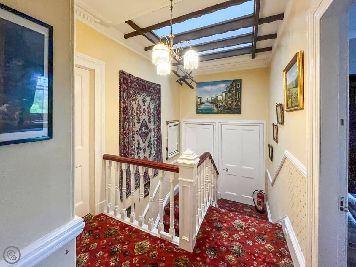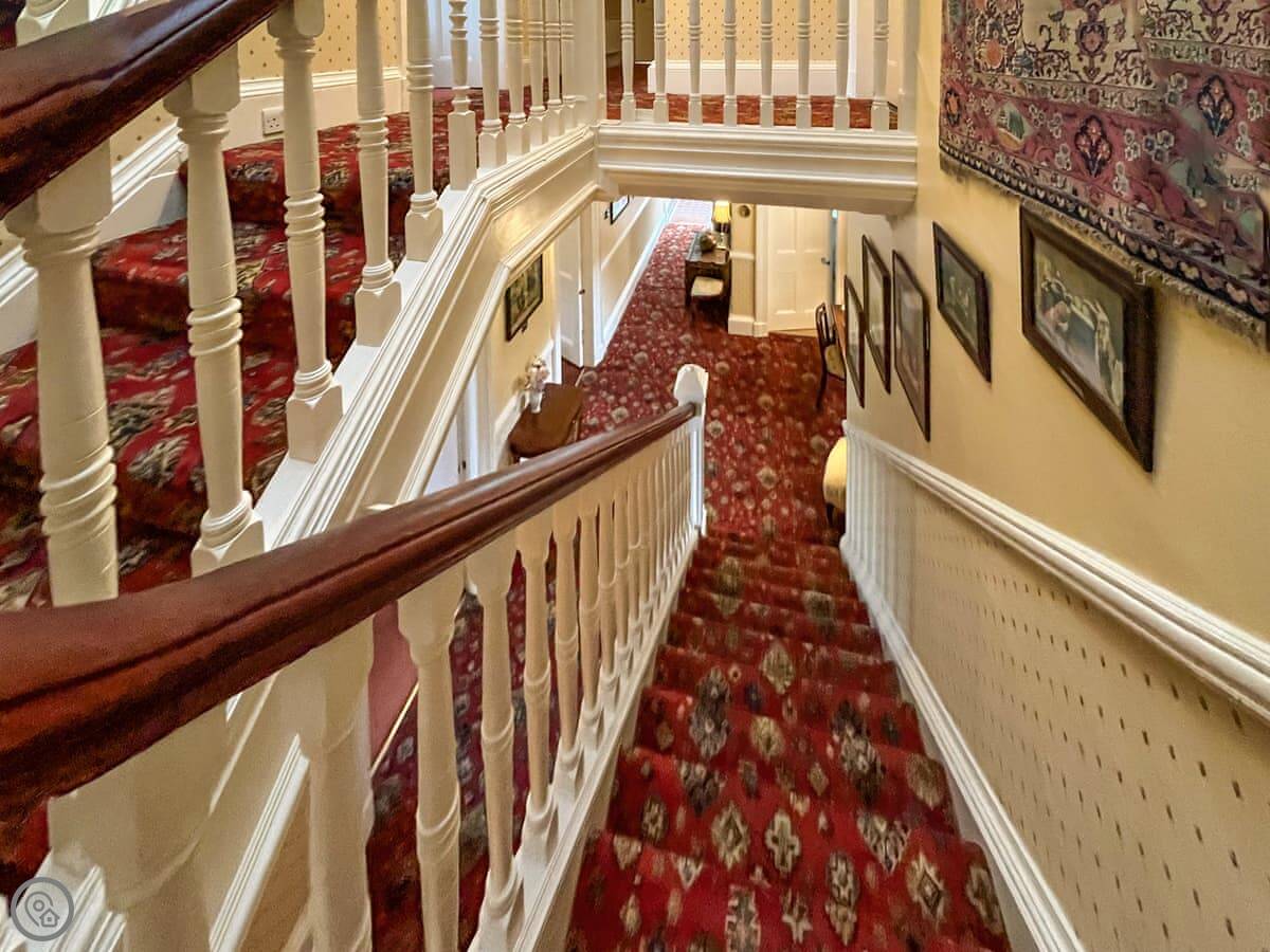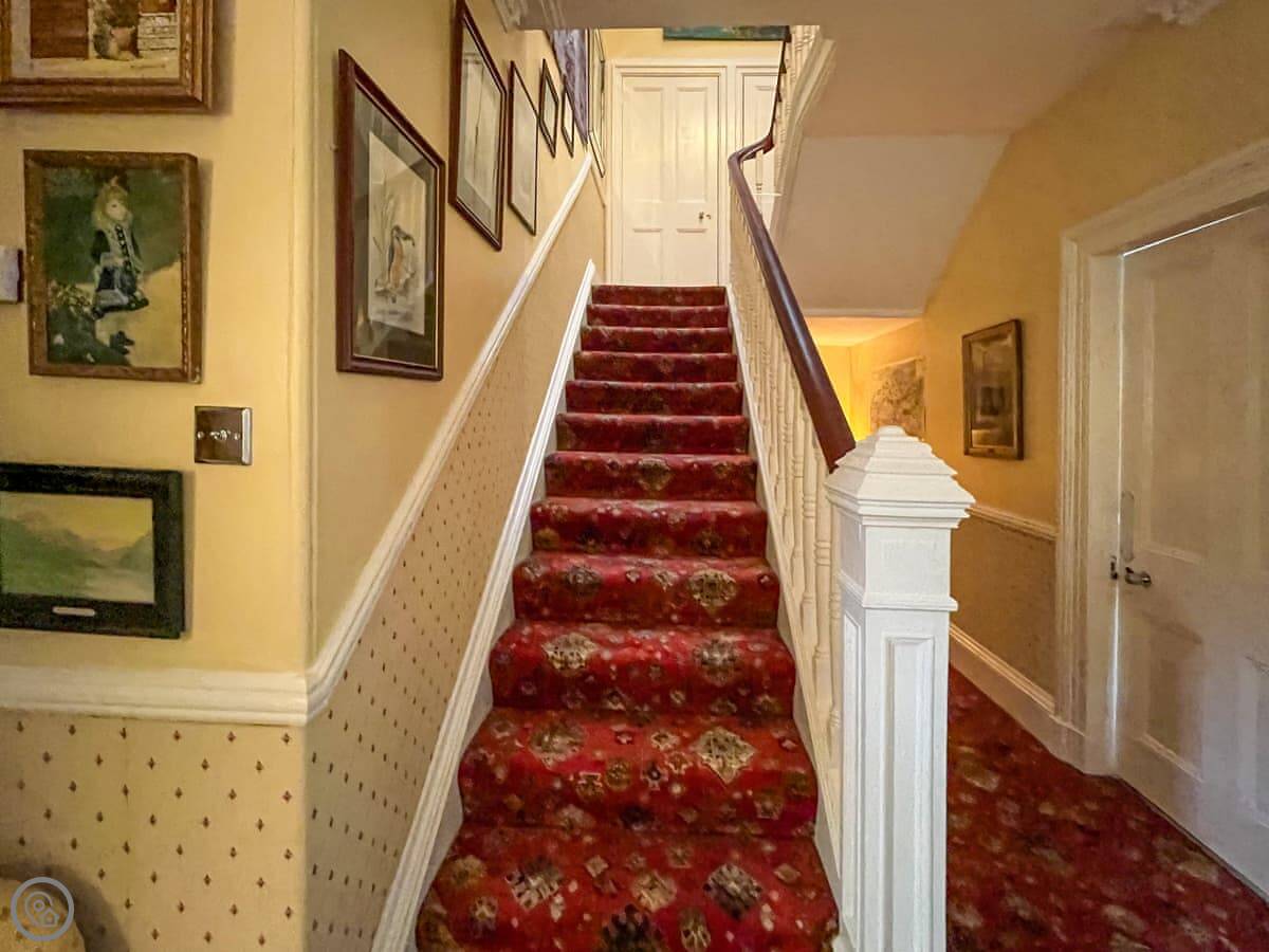 It sleeps eight. Four bedrooms, all with their own shower room, which is handy with a group. The main bedroom has a jacuzzi bath. The stairs are a normal staircase, not one of those twisty cottage ones.