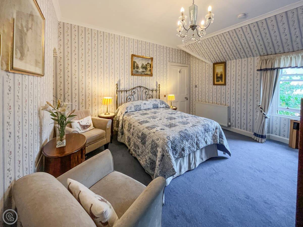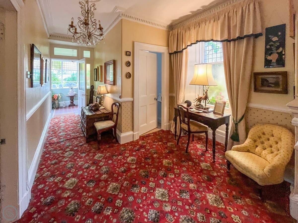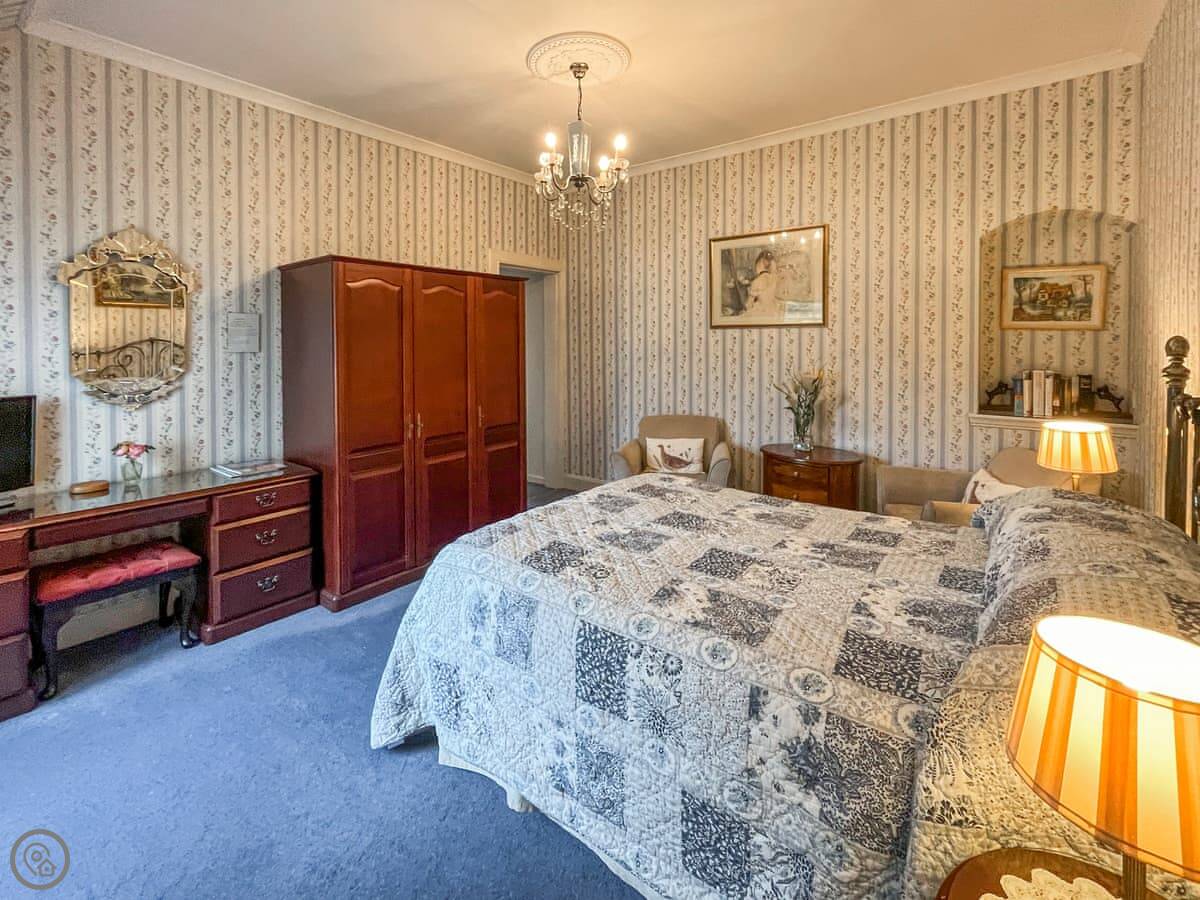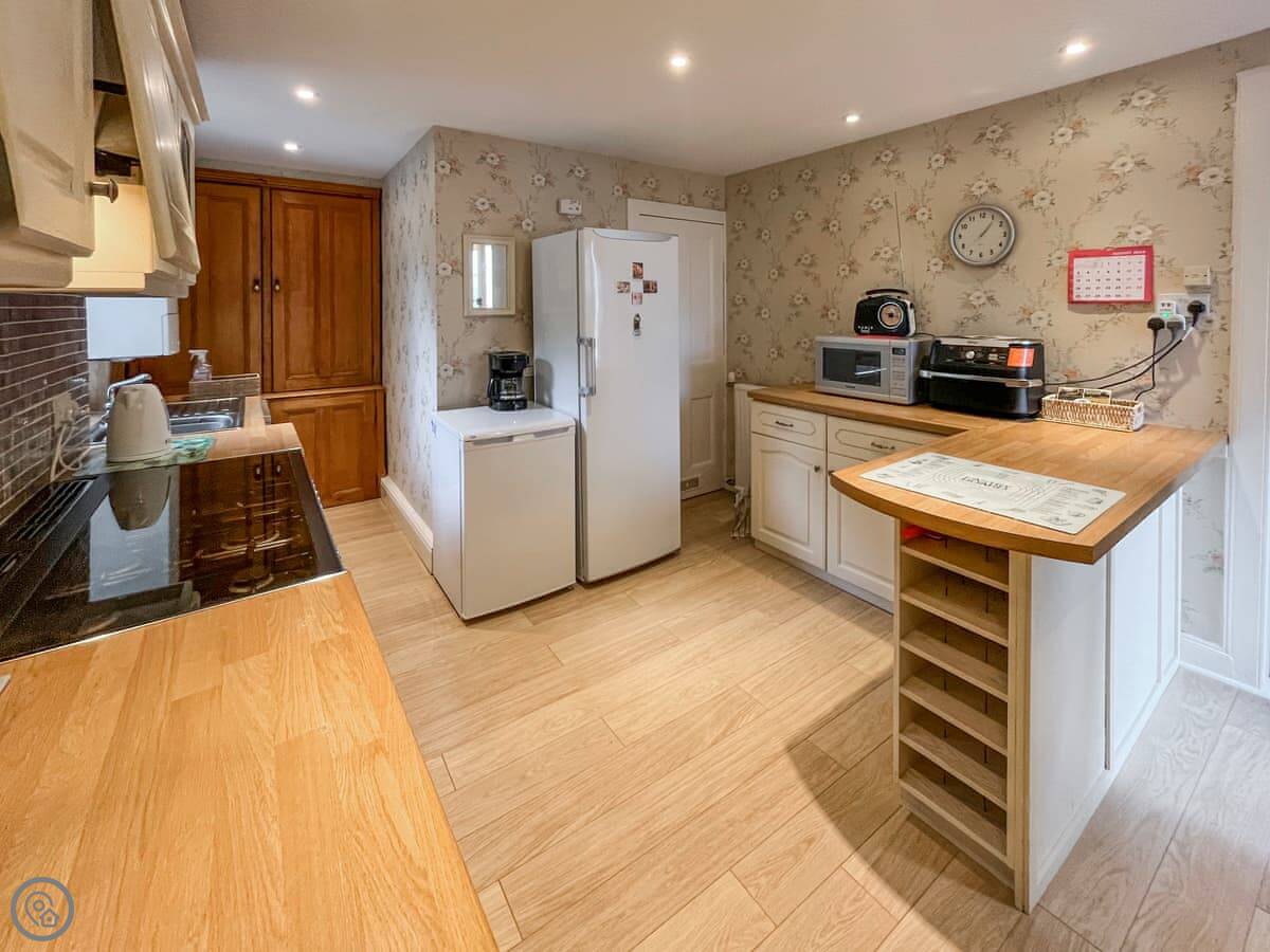 It sleeps eight. Four bedrooms, all with their own shower room, which is handy with a group. The main bedroom has a jacuzzi bath. The stairs are a normal staircase, not one of those twisty cottage ones.