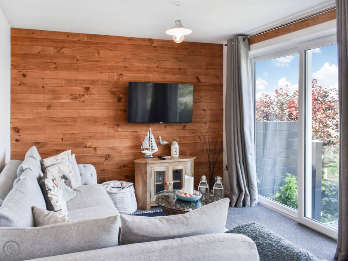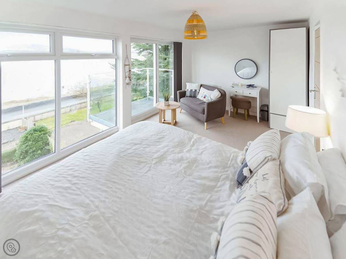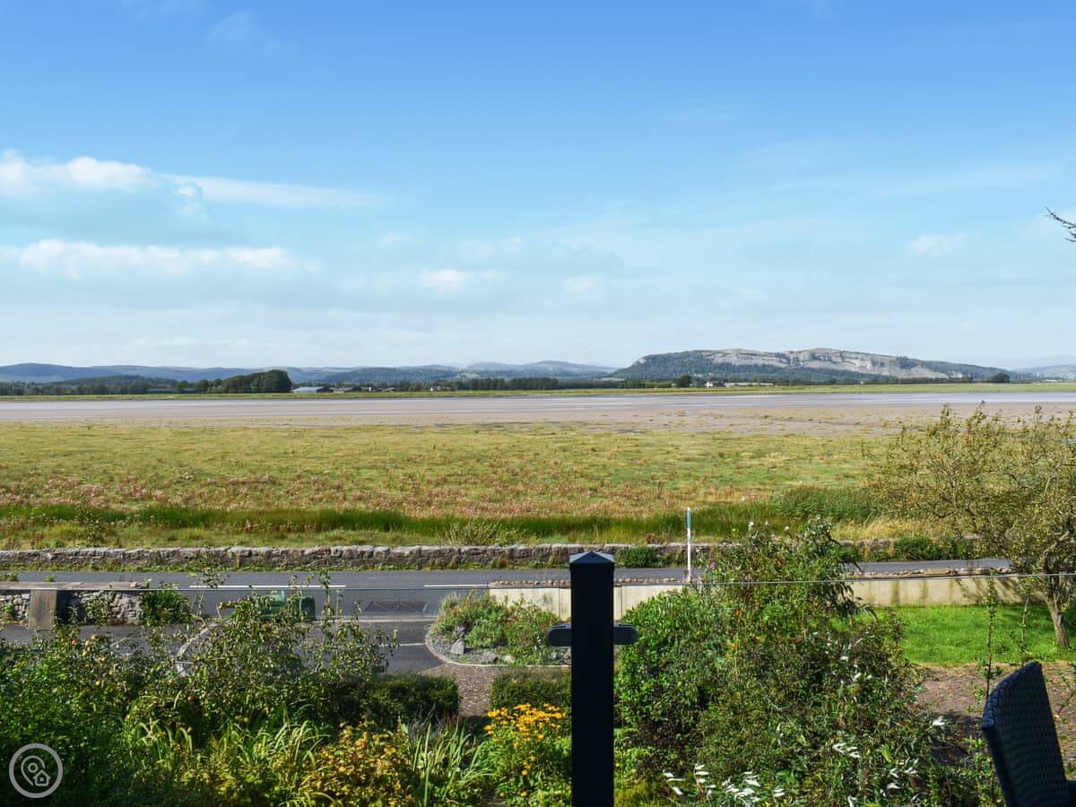 The main thing is the view. You look straight out over the River Kent estuary to the Lake District fells. You get that from the lounge and the main bedroom upstairs. Both rooms have a glass balcony you can step out onto. It's a modern build, so everything is on one level once you're inside, no steep stairs. There's one bathroom with a shower.