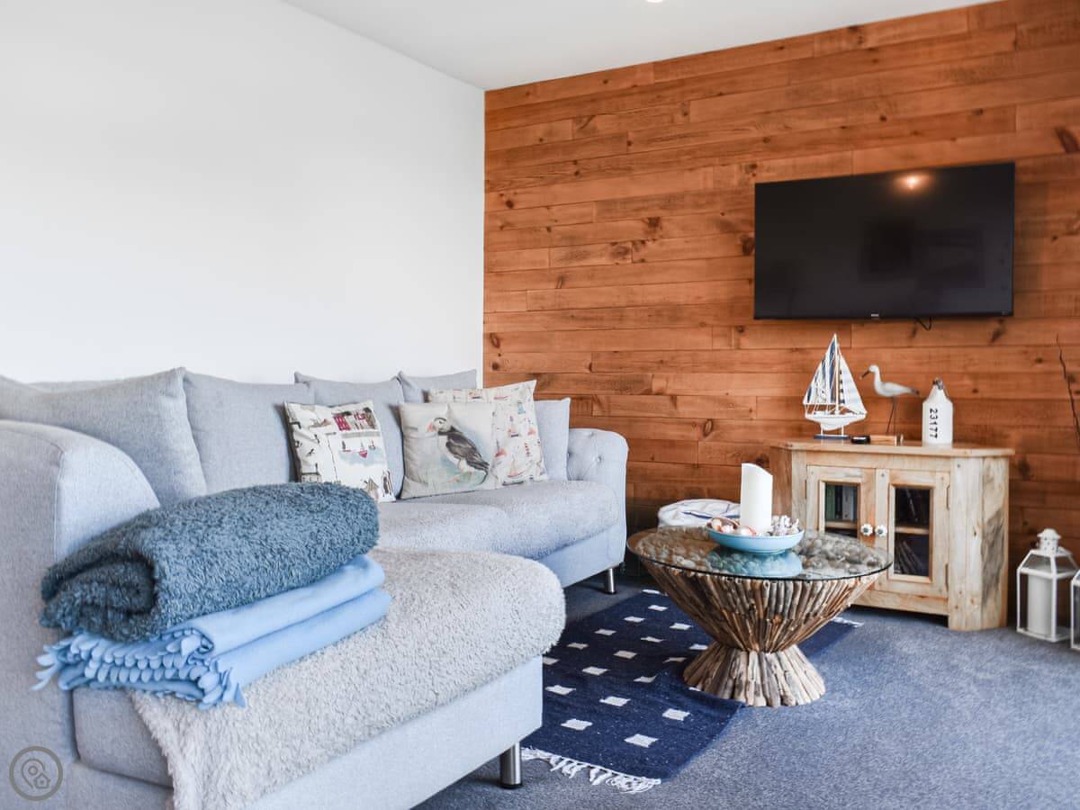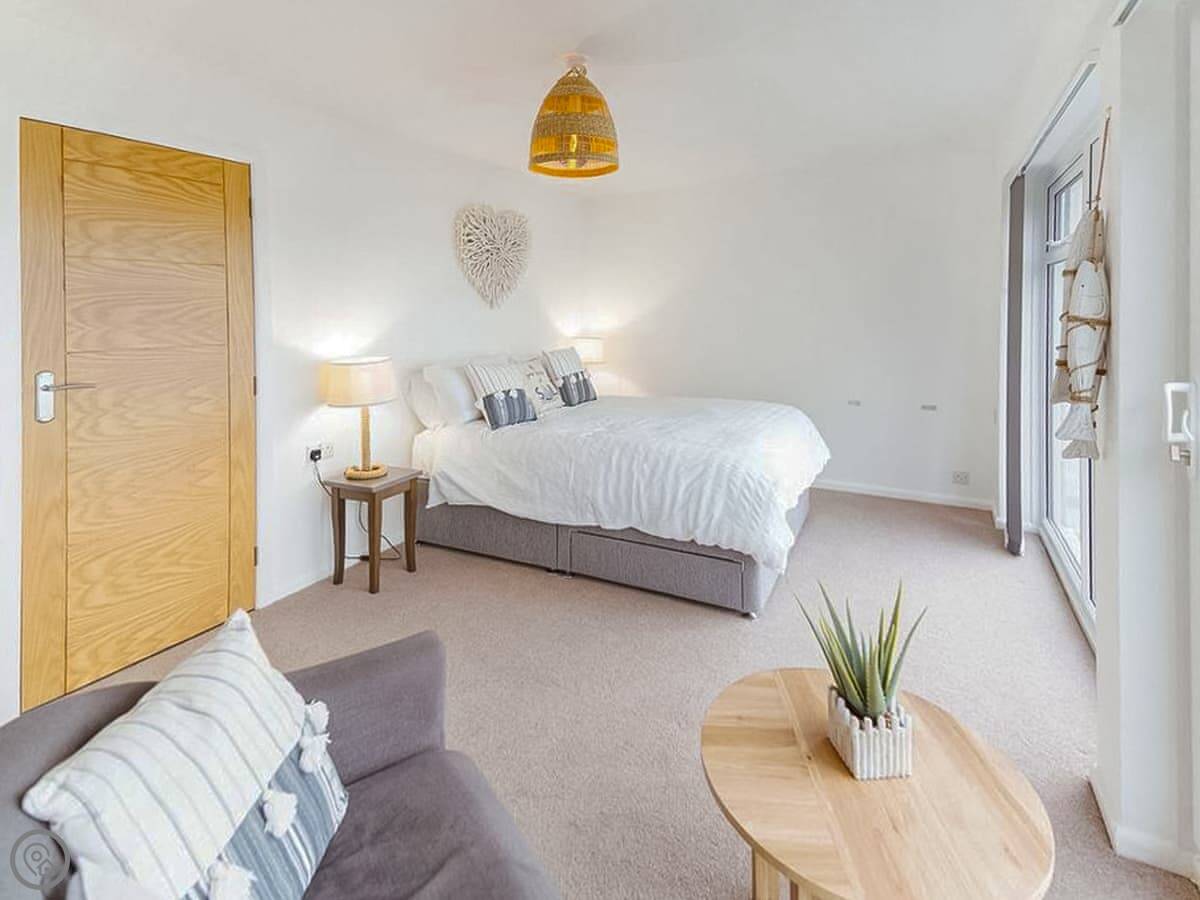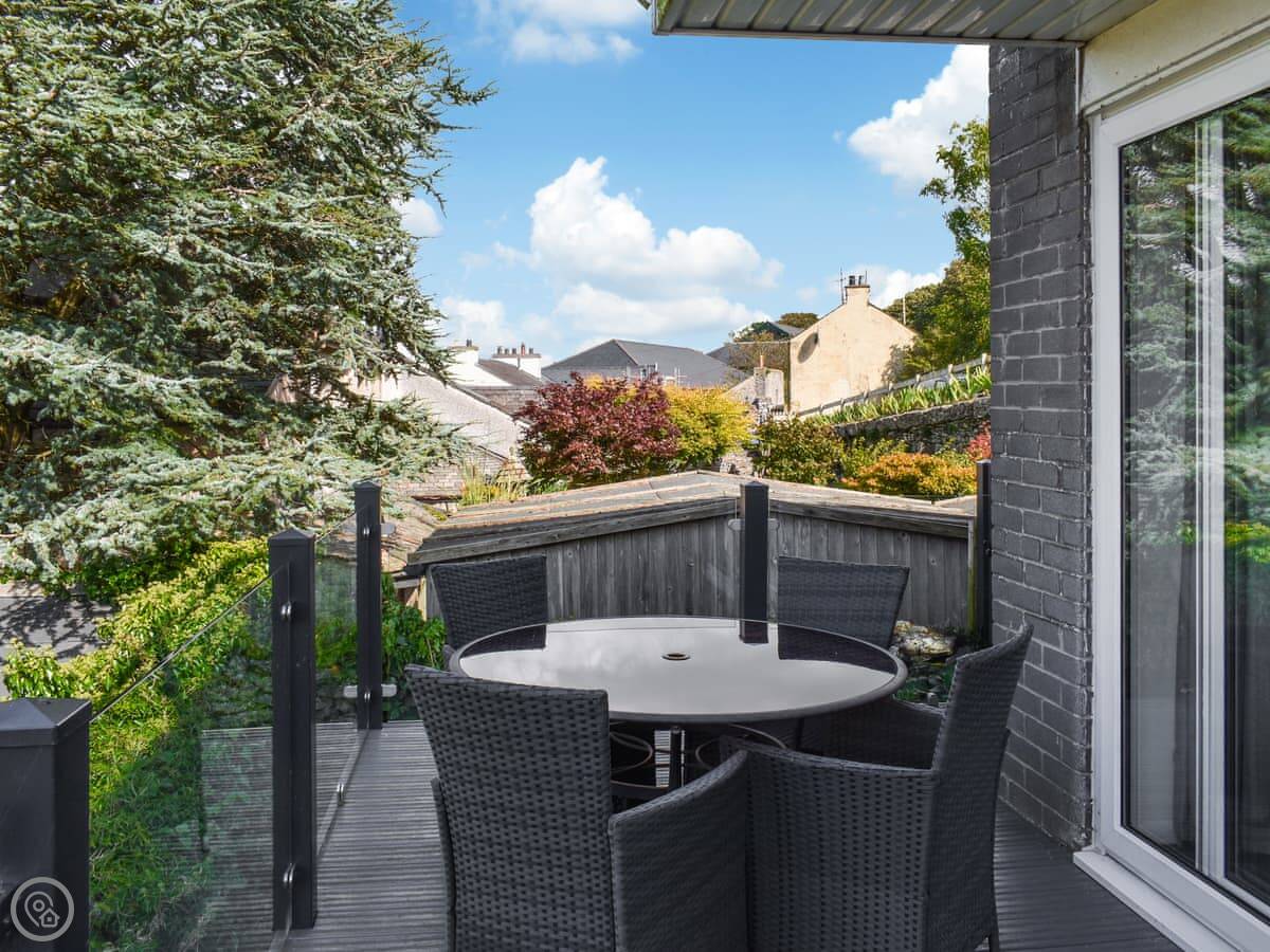 The main thing is the view. You look straight out over the River Kent estuary to the Lake District fells. You get that from the lounge and the main bedroom upstairs. Both rooms have a glass balcony you can step out onto. It's a modern build, so everything is on one level once you're inside, no steep stairs. There's one bathroom with a shower.
