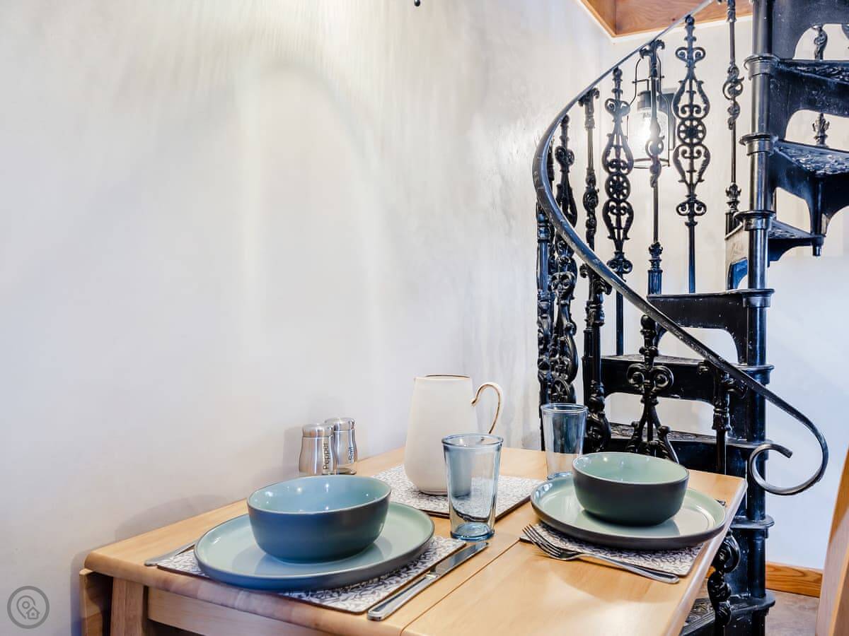 It's for two people. One double bedroom upstairs, one shower room. The stairs to the bedroom are a spiral staircase made of cast iron. They're open and steep. You'll want to watch your step.