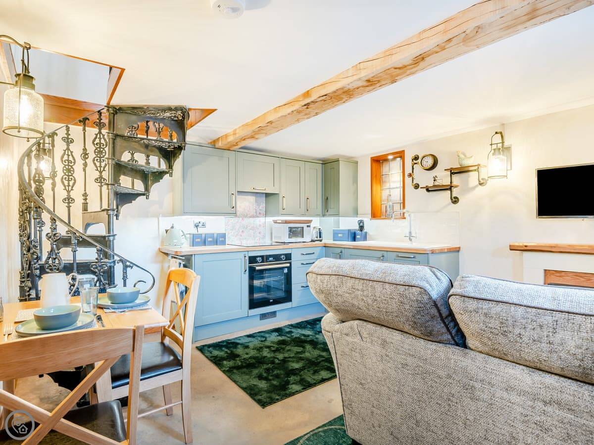There's a small kitchen with a dishwasher. The sofa is a two-seater. Outside is a private, enclosed courtyard with a table and chairs and a barbecue. It's a good sun trap.