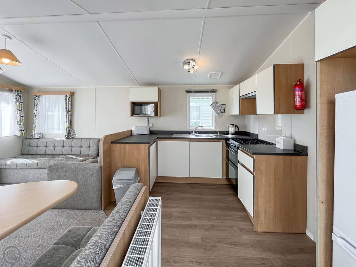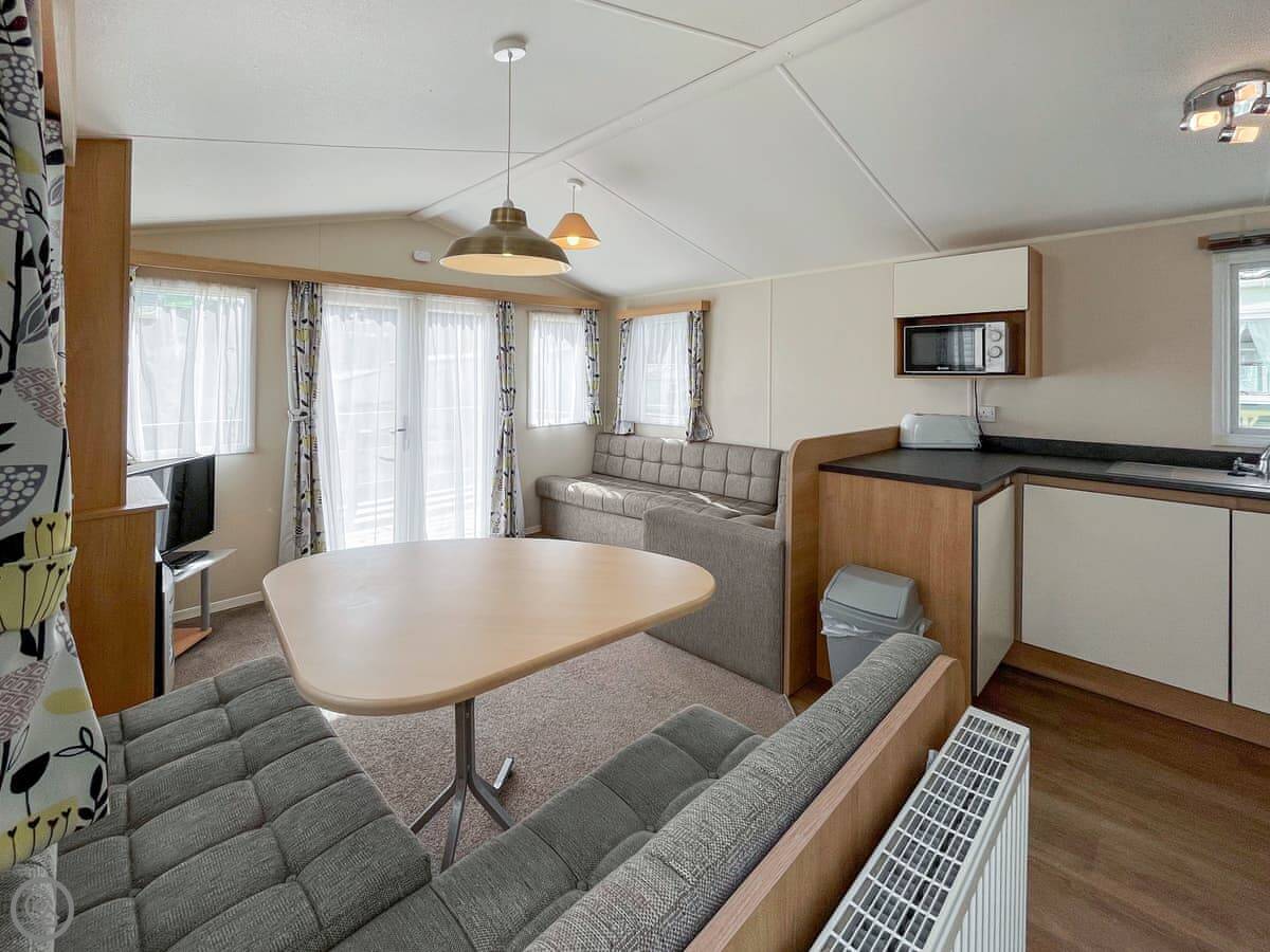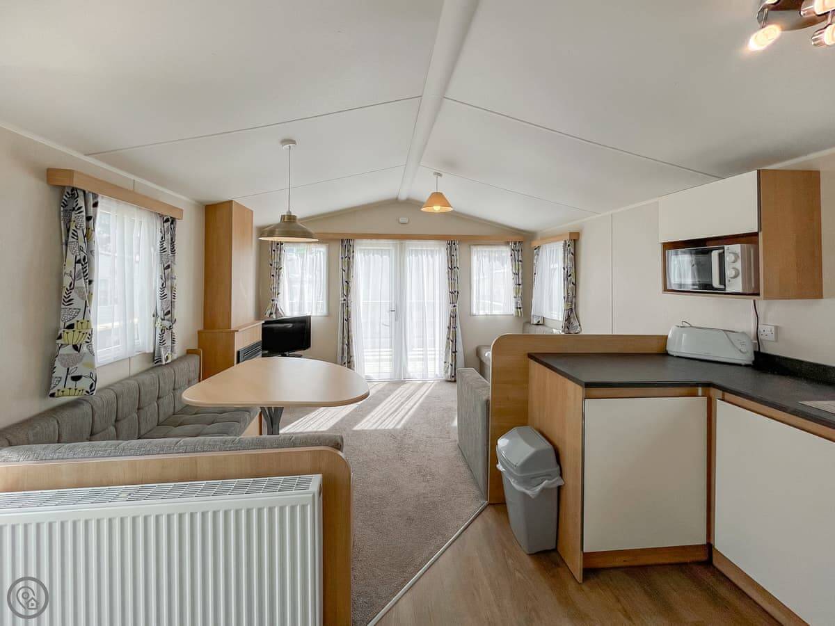 It sleeps six. There's a double room and two twins. Two bathrooms, both with showers. It's got a 3 Star rating. It's clean and comfortable. The living area is all one space, with the kitchen at the end. The decking is enclosed, which is handy if you have dogs.