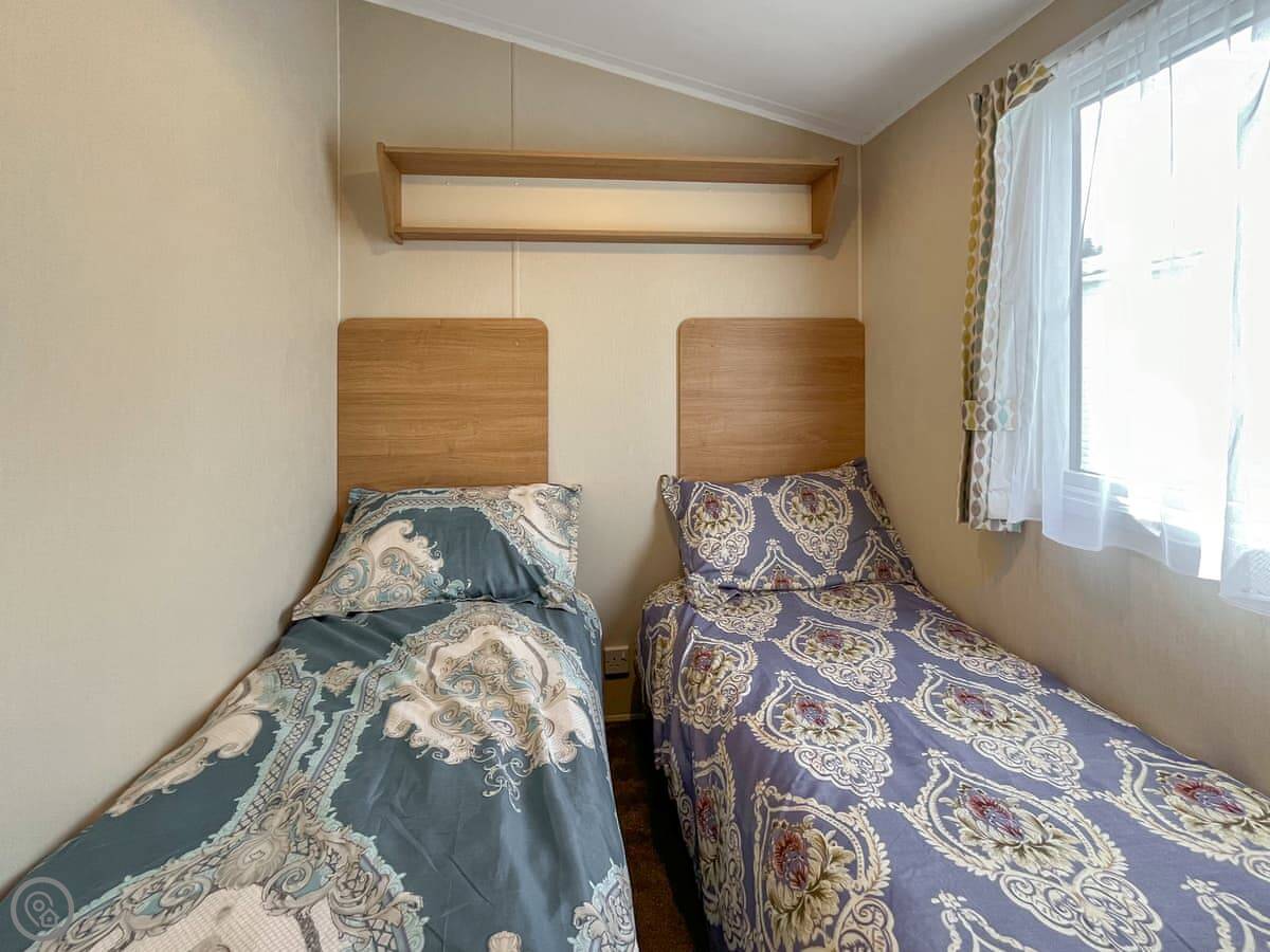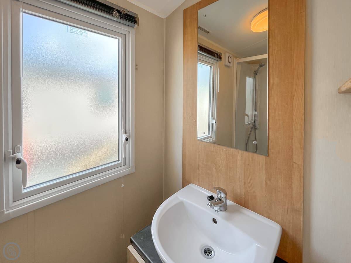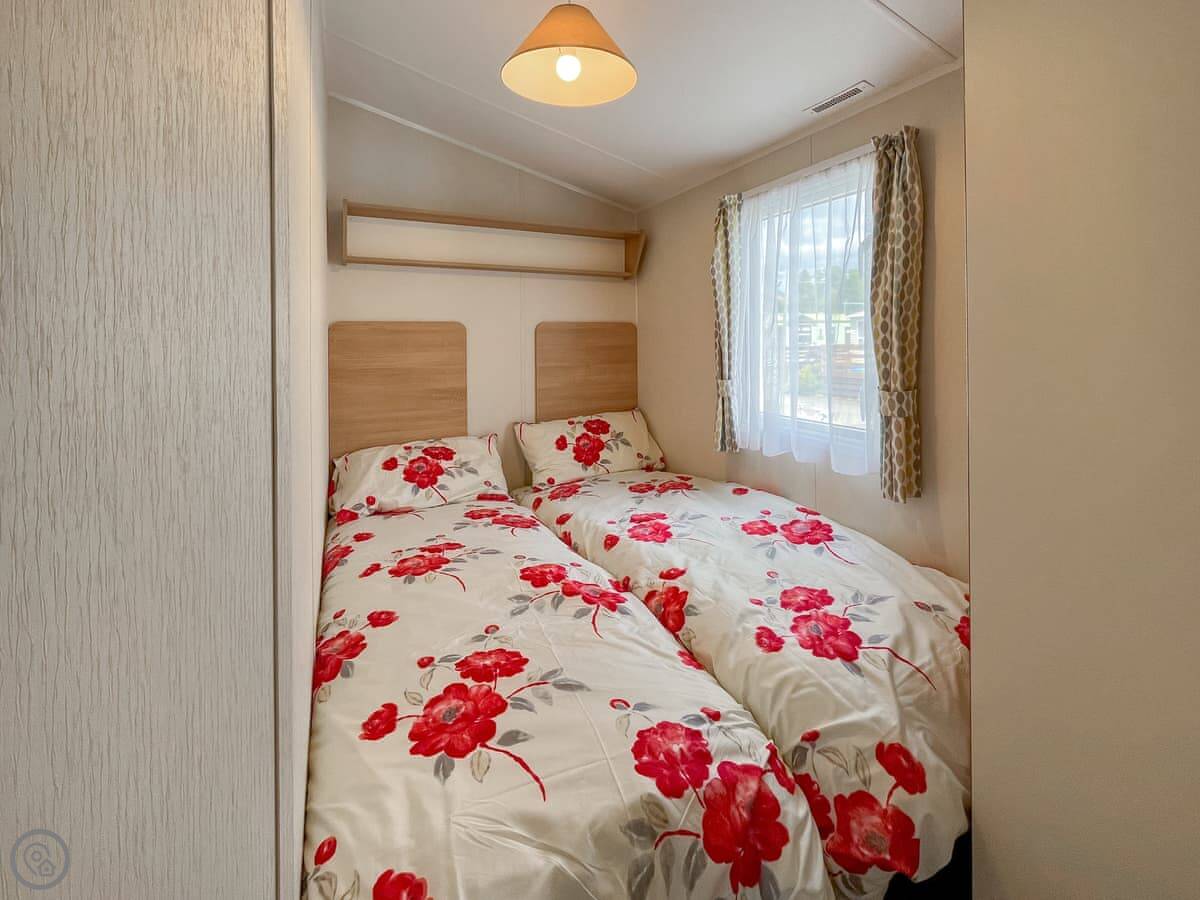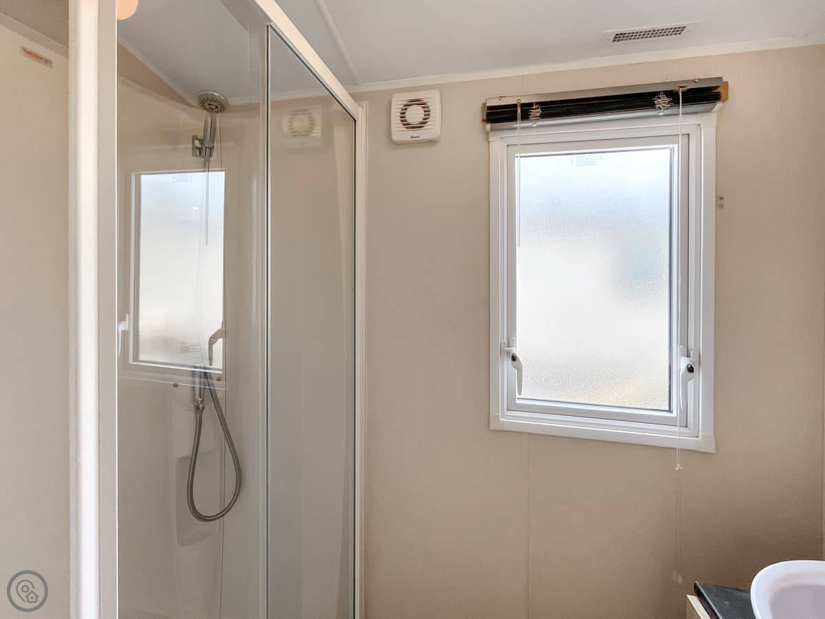 It sleeps six. There's a double room and two twins. Two bathrooms, both with showers. It's got a 3 Star rating. It's clean and comfortable. The living area is all one space, with the kitchen at the end. The decking is enclosed, which is handy if you have dogs.