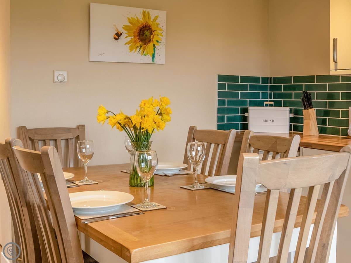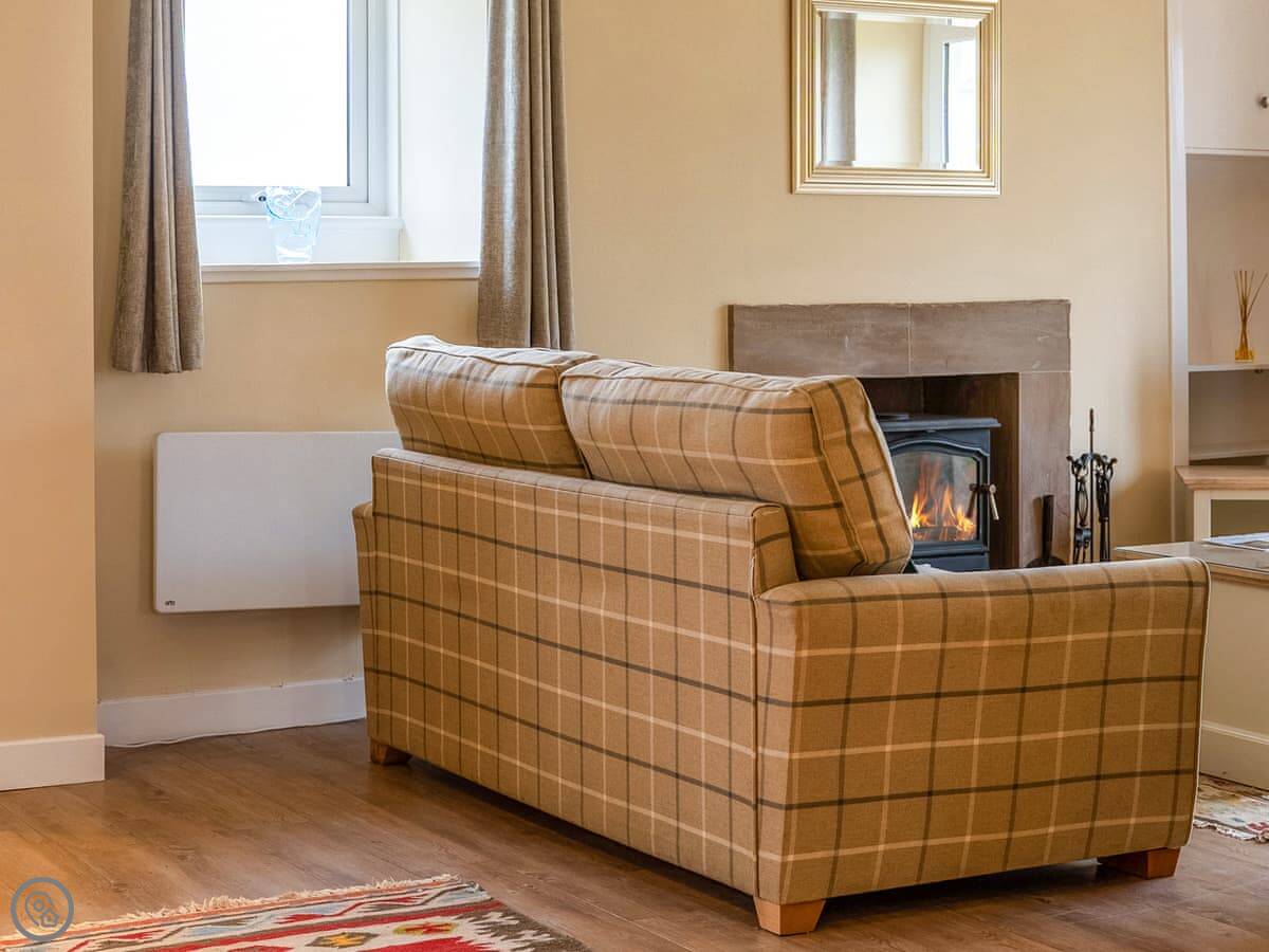 The living area has a wood-burning stove. Outside is an enclosed garden with a patio, which is good for dogs. There's a hot tub.