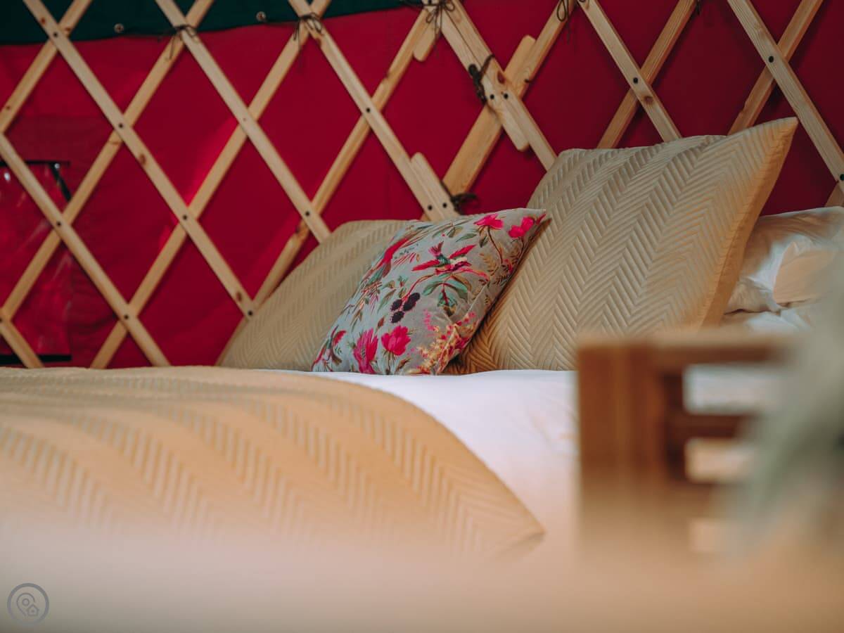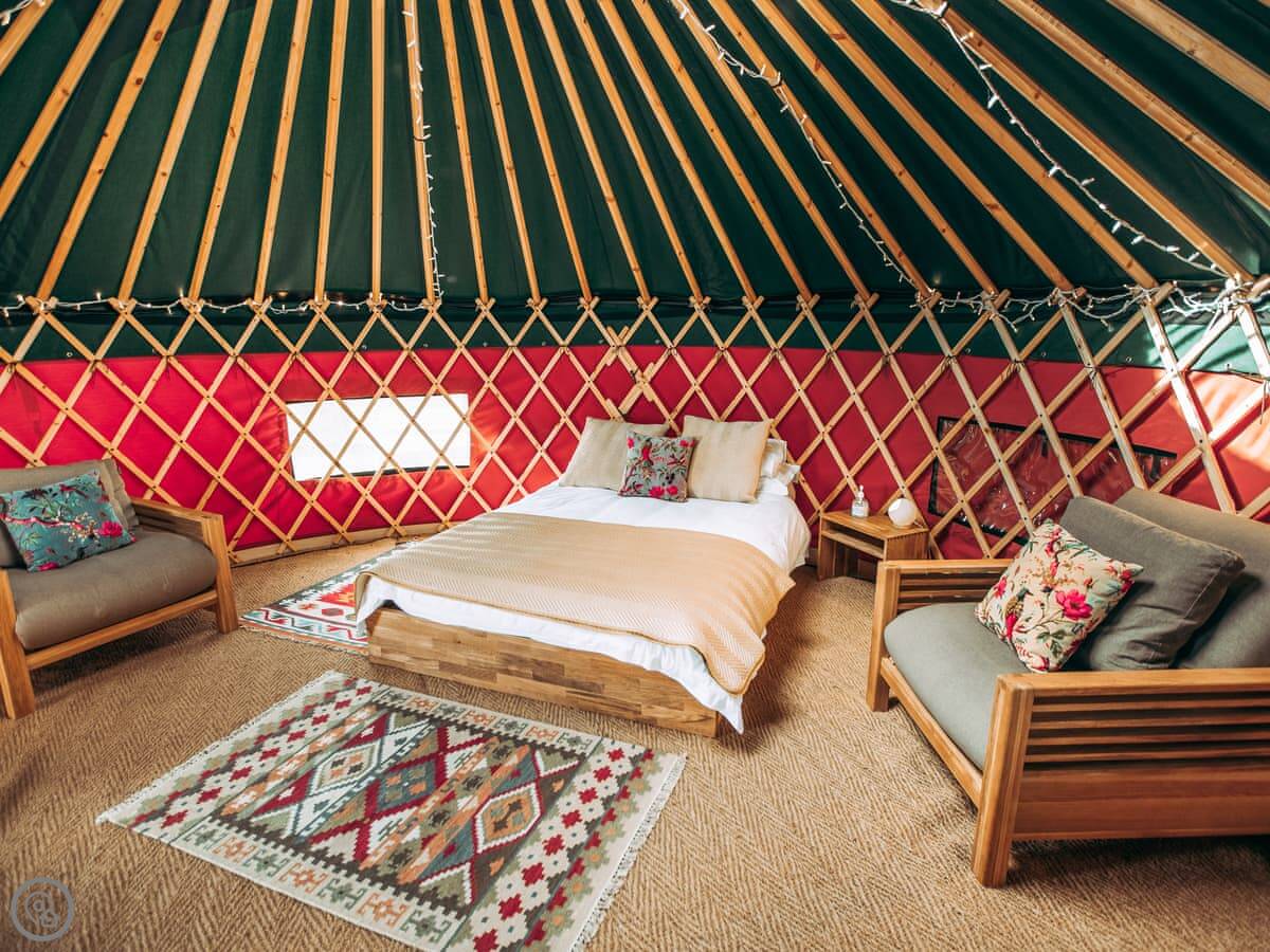 It sleeps four, not six. There's one main space with a double bed, a double futon, and two single futons. It's one bedroom, really. Everything's in that one round room. There's one bathroom, but it's not in the yurt itself. You walk a short distance to a shared toilet and shower block. It's clean and private, just separate.