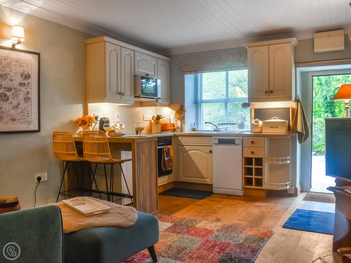It sleeps two in one bedroom. There's one bathroom with a bath. It's got a 4 Star rating. Everything you'd expect is there. The layout is all open-plan downstairs, with the kitchen, dining area, and living space in one room. The bedroom and bathroom are off a little hallway. It's compact but it works.