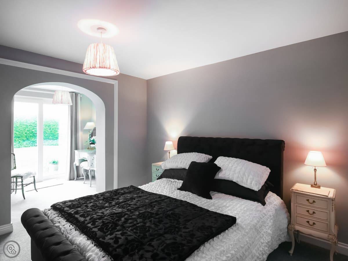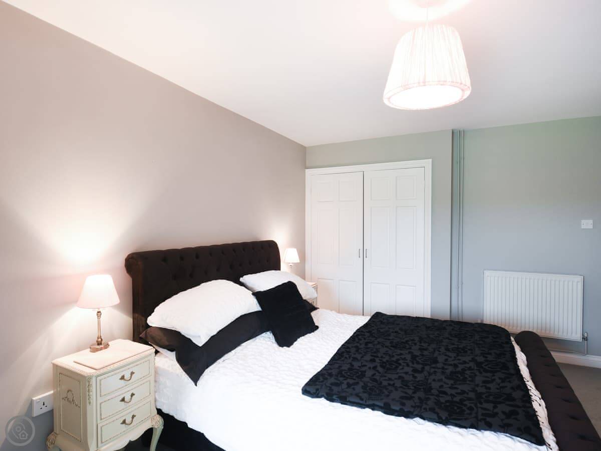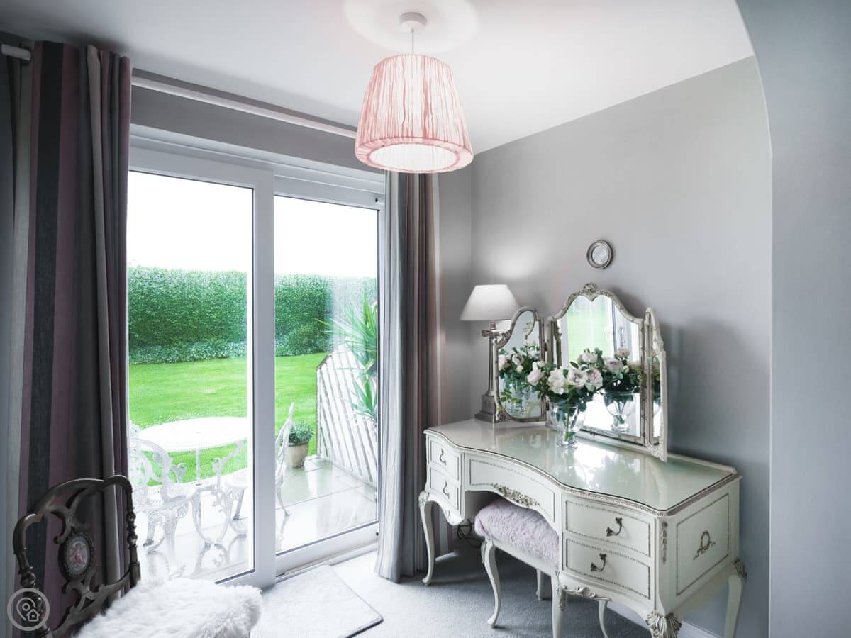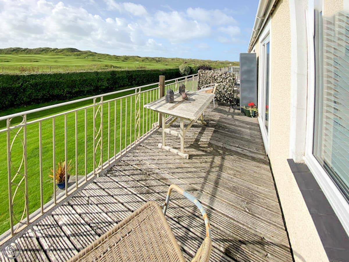 The cottage sleeps four. Two bedrooms, both doubles, and two bathrooms. It's got a 4 Star rating. Everything's on one level, which is handy. The master bedroom has doors that open onto a little private terrace. The living room is upstairs, with a balcony that looks over the golf course towards the sea. The kitchen is separate.