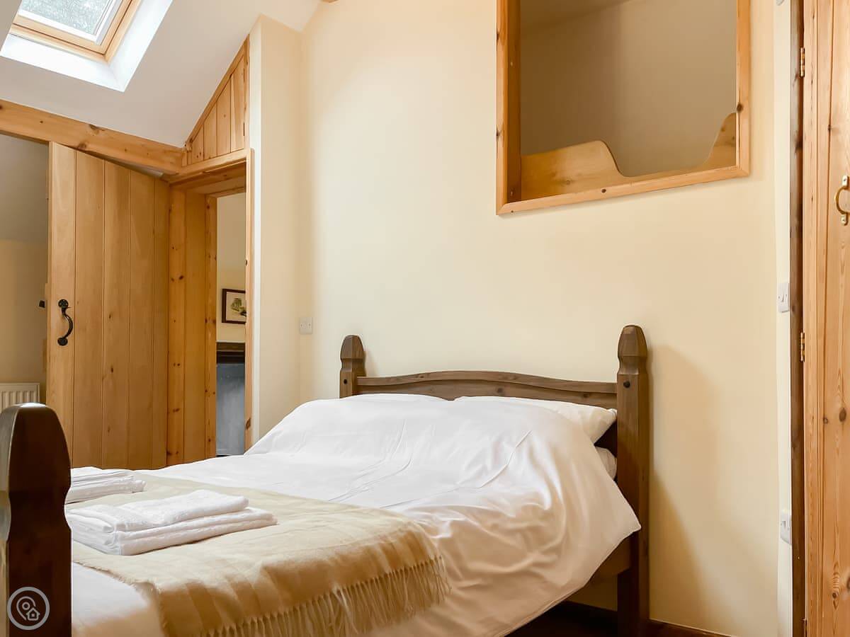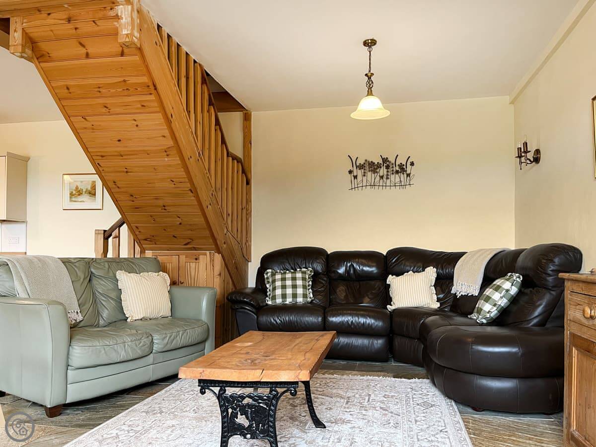 Downstairs is all open plan. Kitchen, big table, and the sitting area. It works for everyone being together. Upstairs are the bedrooms. The stairs are a typical barn conversion staircase, a bit open and steep, so just be aware.