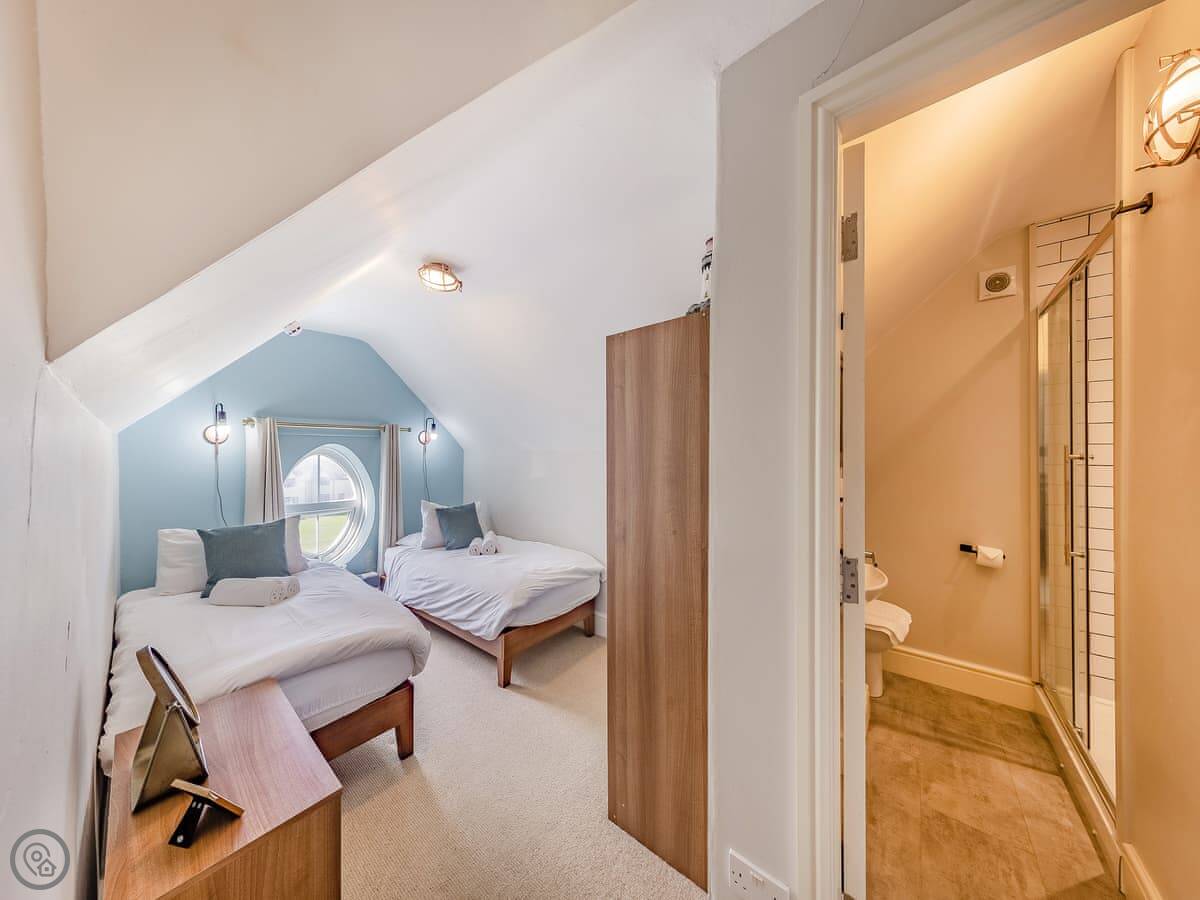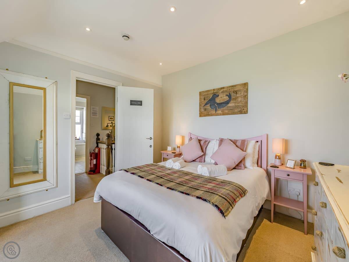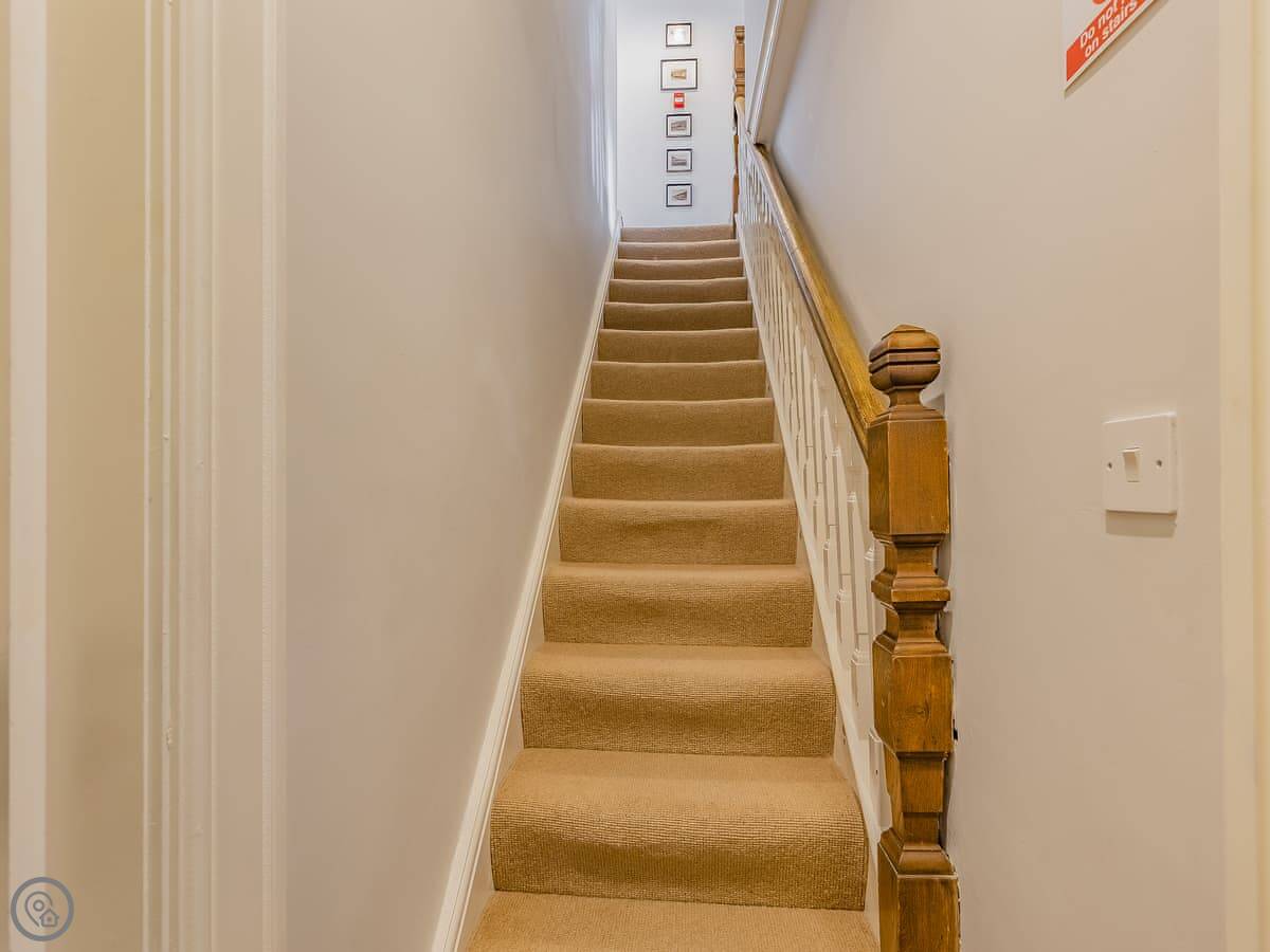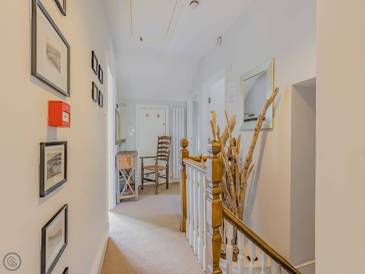 It sleeps eight. There are four bedrooms and three bathrooms, one is an en-suite. It gets a 4 Star rating, so it's comfortable and well looked after. It's a flat walk to the shops and cafes in the village. The stairs inside are fine, but they're the original ones so a bit narrower than you might get in a new build.