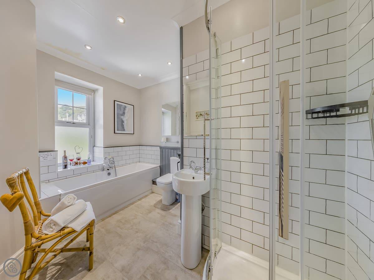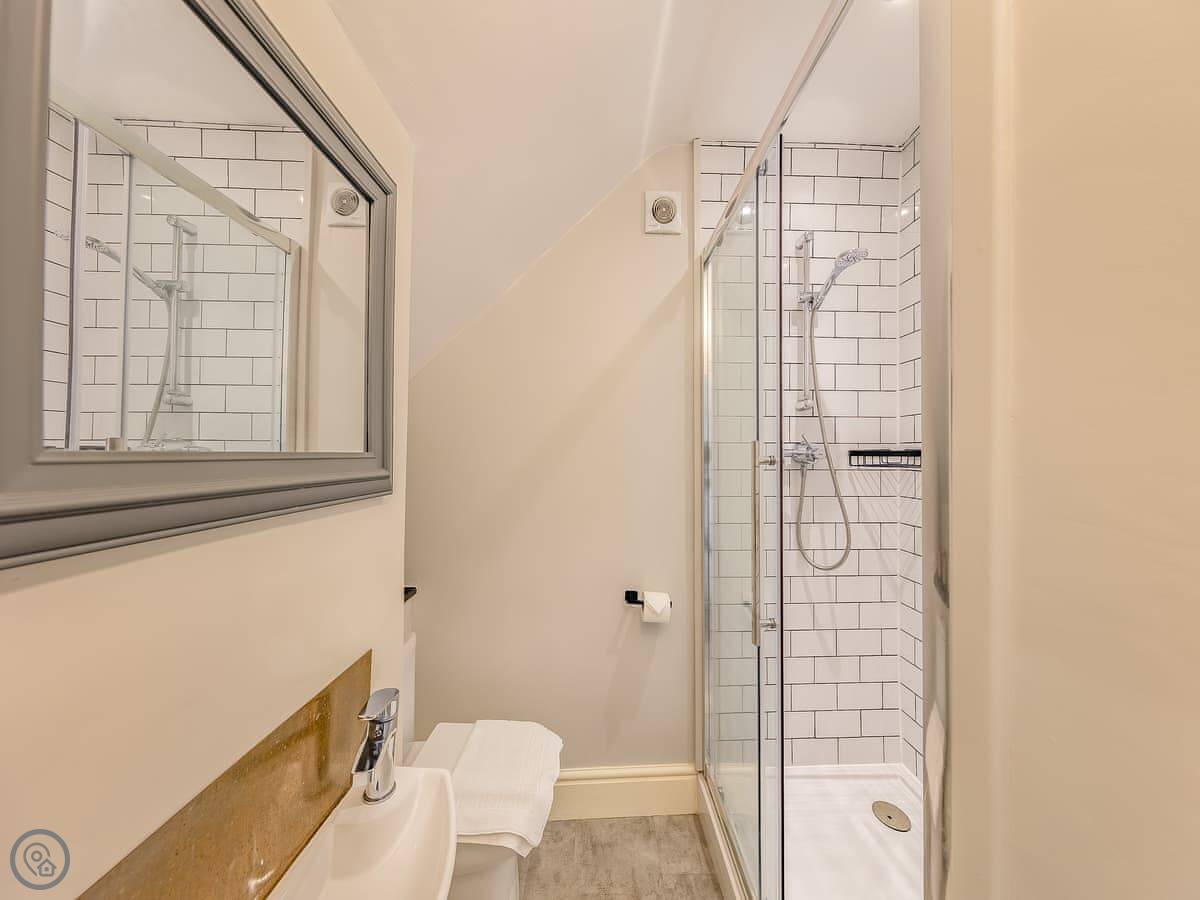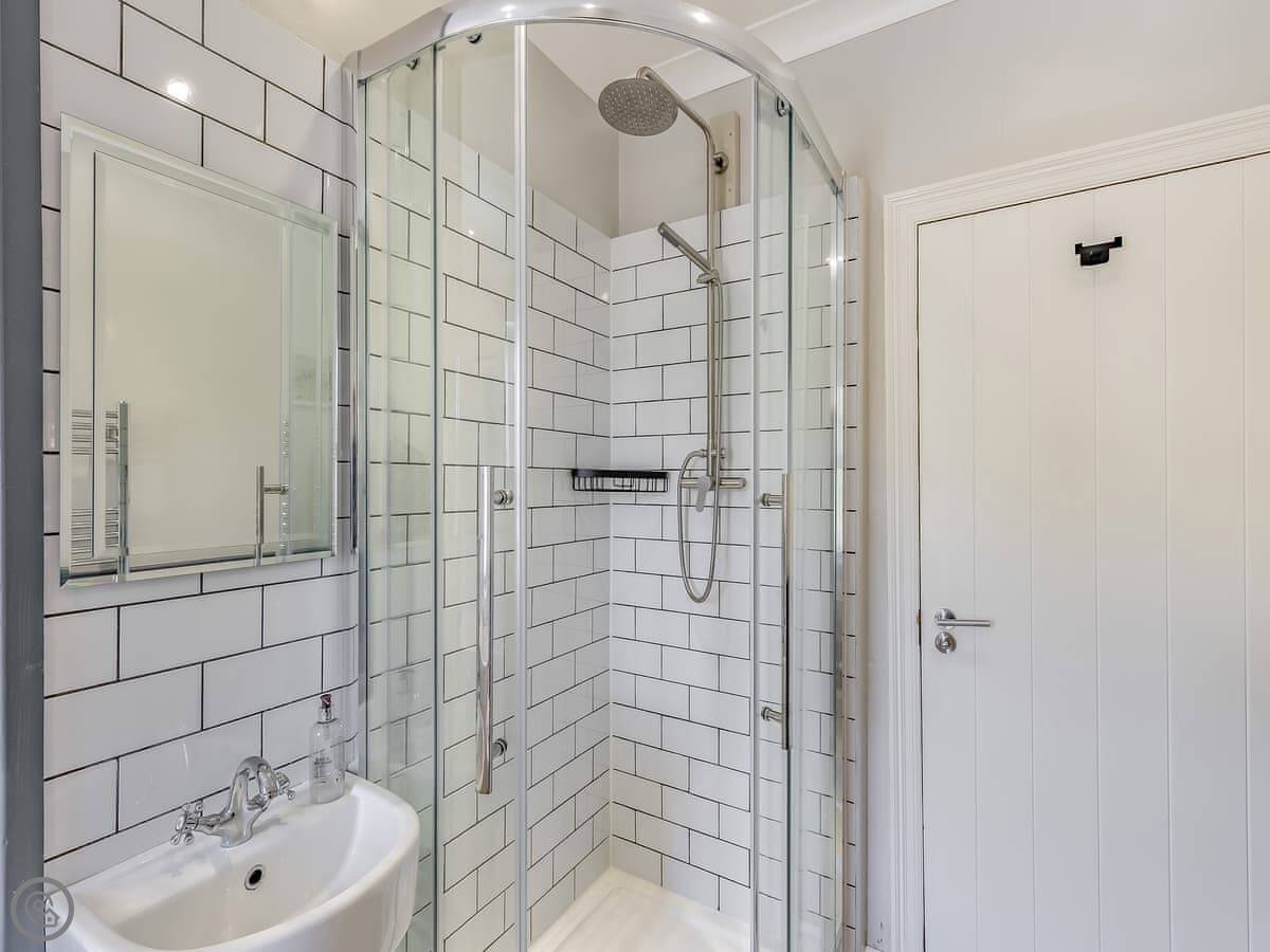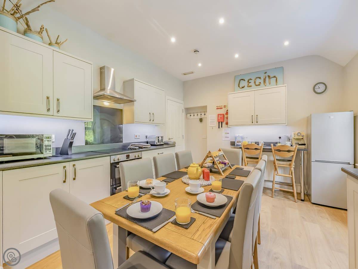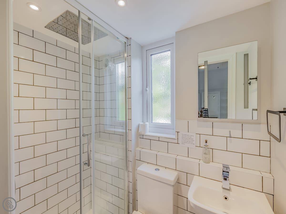 It sleeps eight. There are four bedrooms and three bathrooms, one is an en-suite. It gets a 4 Star rating, so it's comfortable and well looked after. It's a flat walk to the shops and cafes in the village. The stairs inside are fine, but they're the original ones so a bit narrower than you might get in a new build.