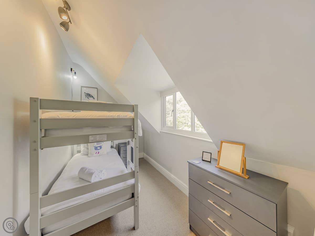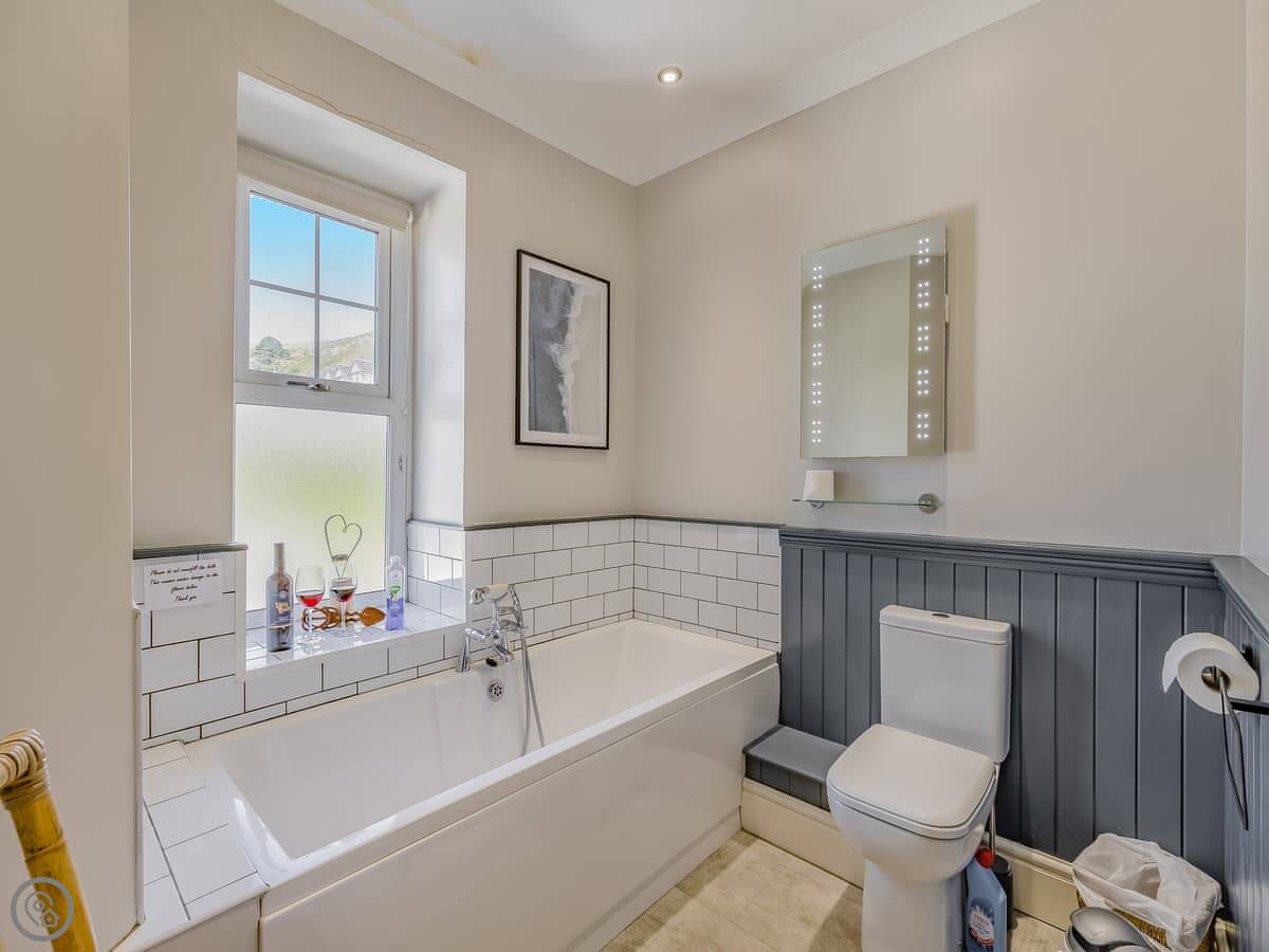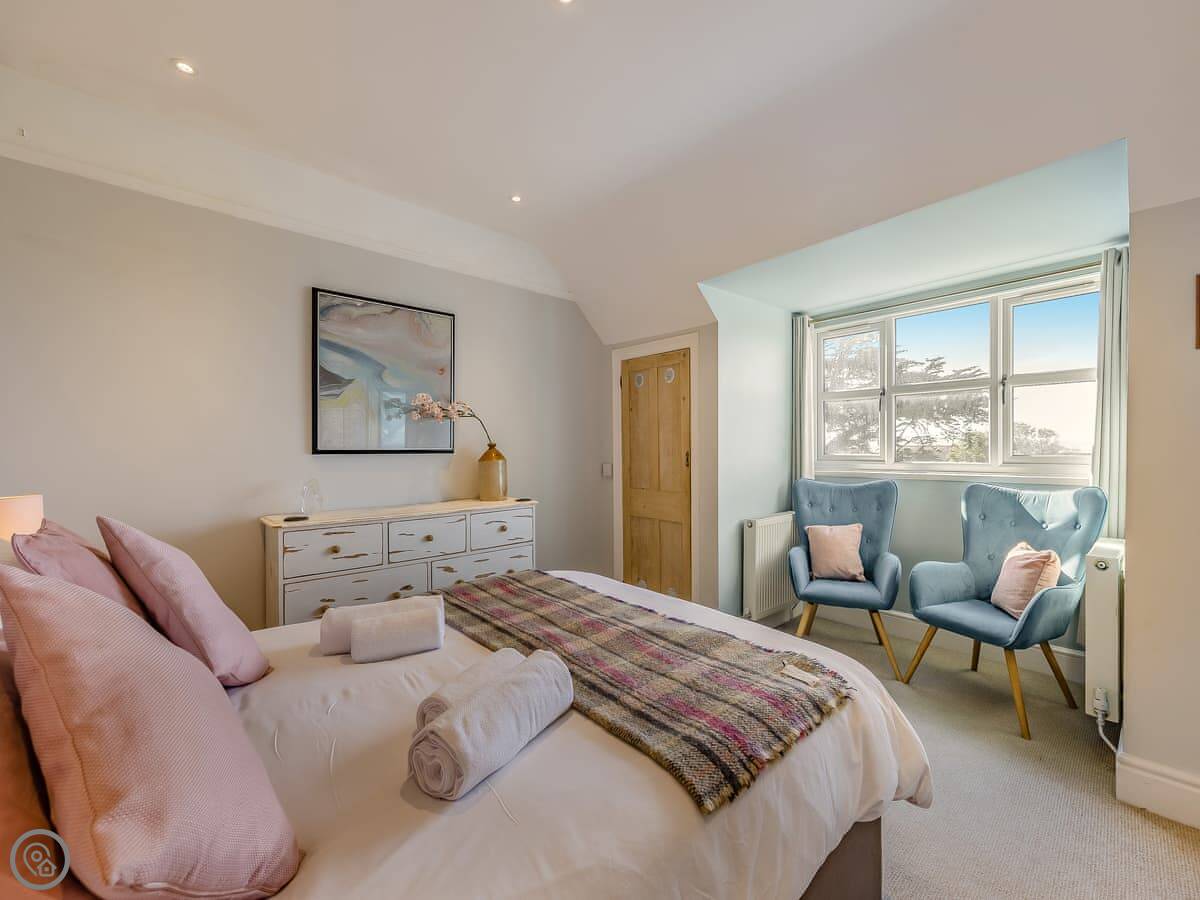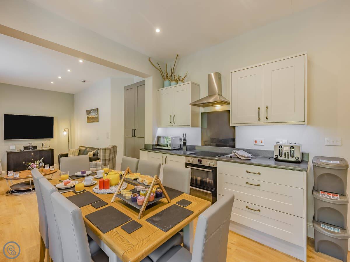 It sleeps eight. There are four bedrooms and three bathrooms, one is an en-suite. It gets a 4 Star rating, so it's comfortable and well looked after. It's a flat walk to the shops and cafes in the village. The stairs inside are fine, but they're the original ones so a bit narrower than you might get in a new build.
