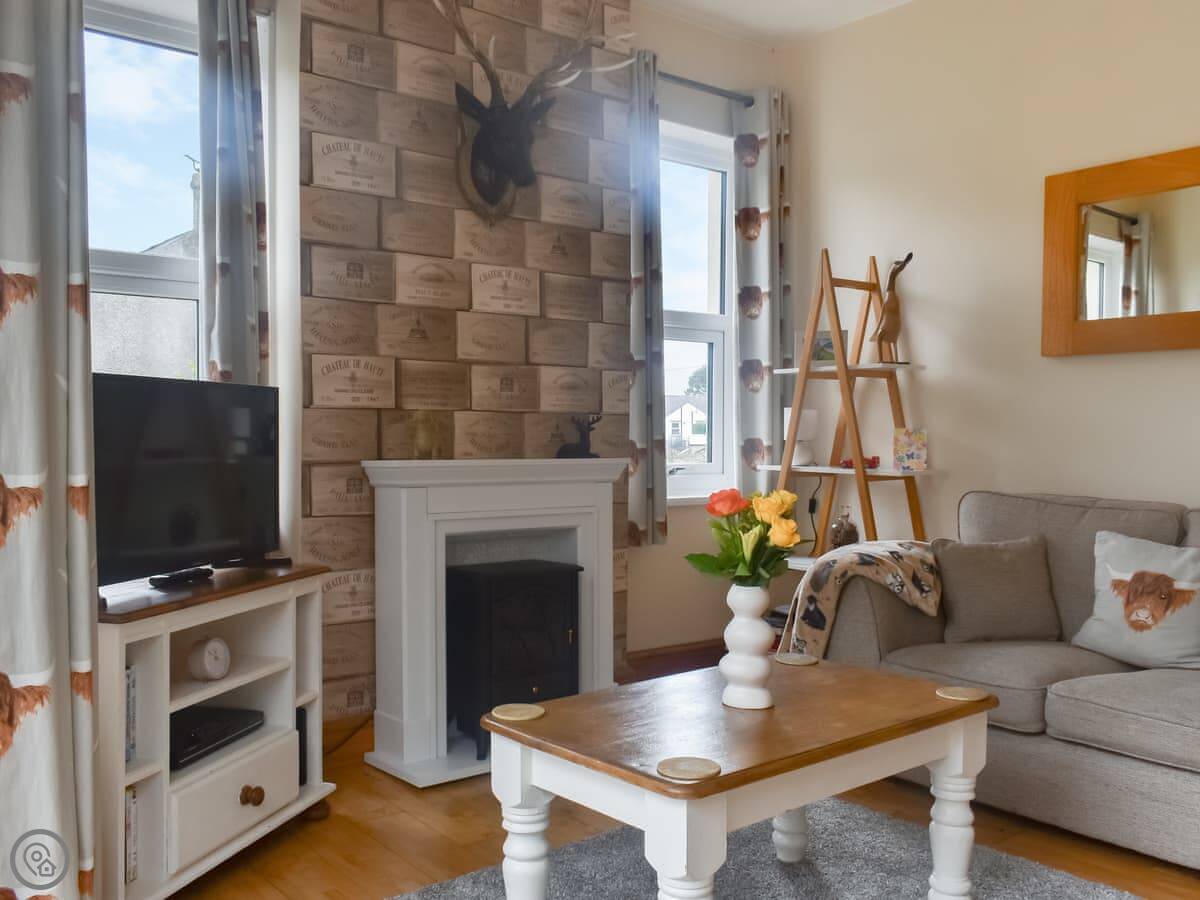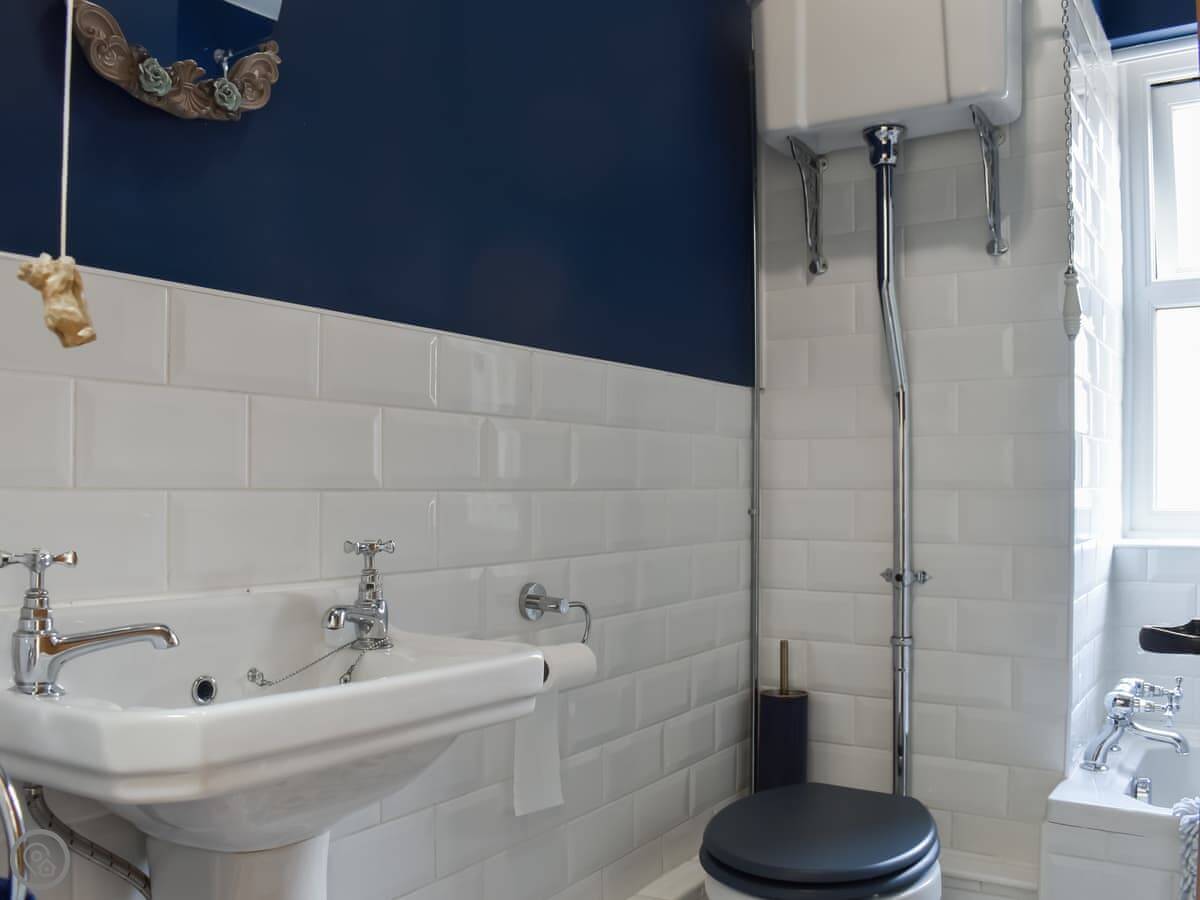 It sleeps four. One double bedroom is on the ground floor. The other double bedroom and the bathroom are upstairs, along with the living room. So if you're in the upstairs bedroom, you've got to come down a flight for the toilet. The bathroom has a bath with a shower over it. You get all your bedding and towels.