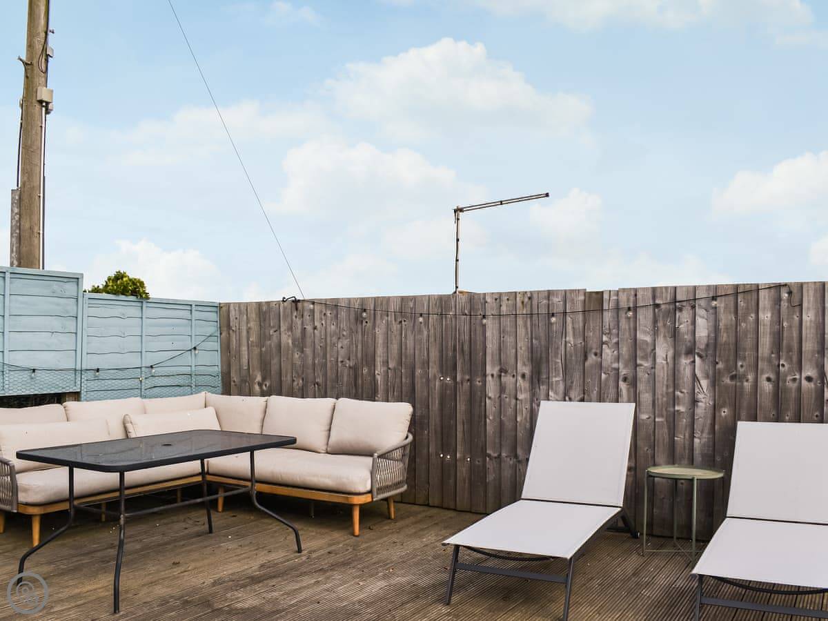 Outside, there's a small enclosed garden and a driveway for parking. You can sit out there with a drink in the evening.