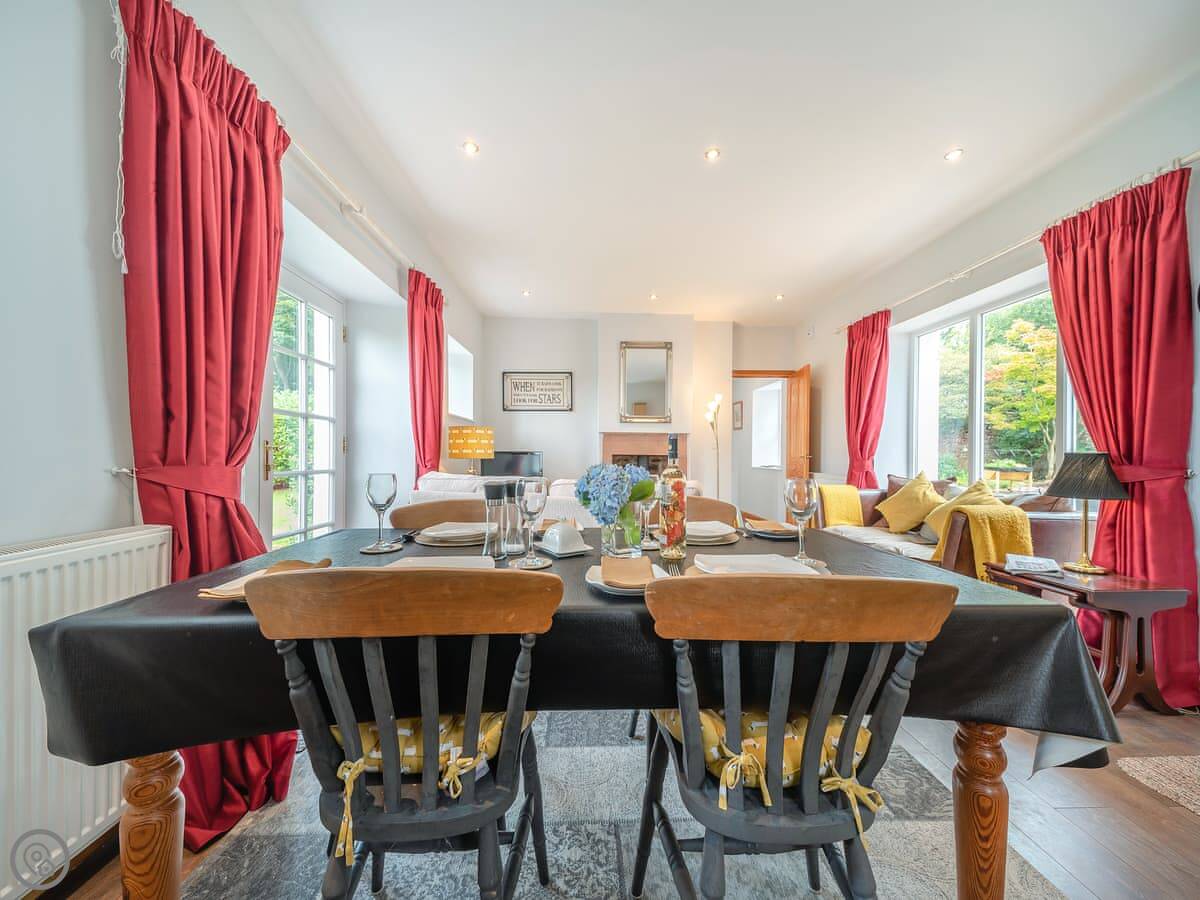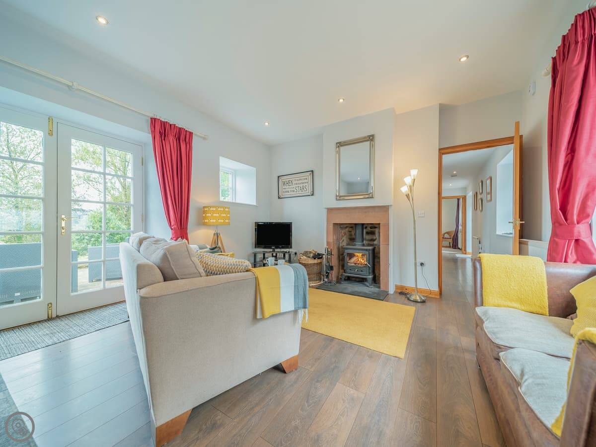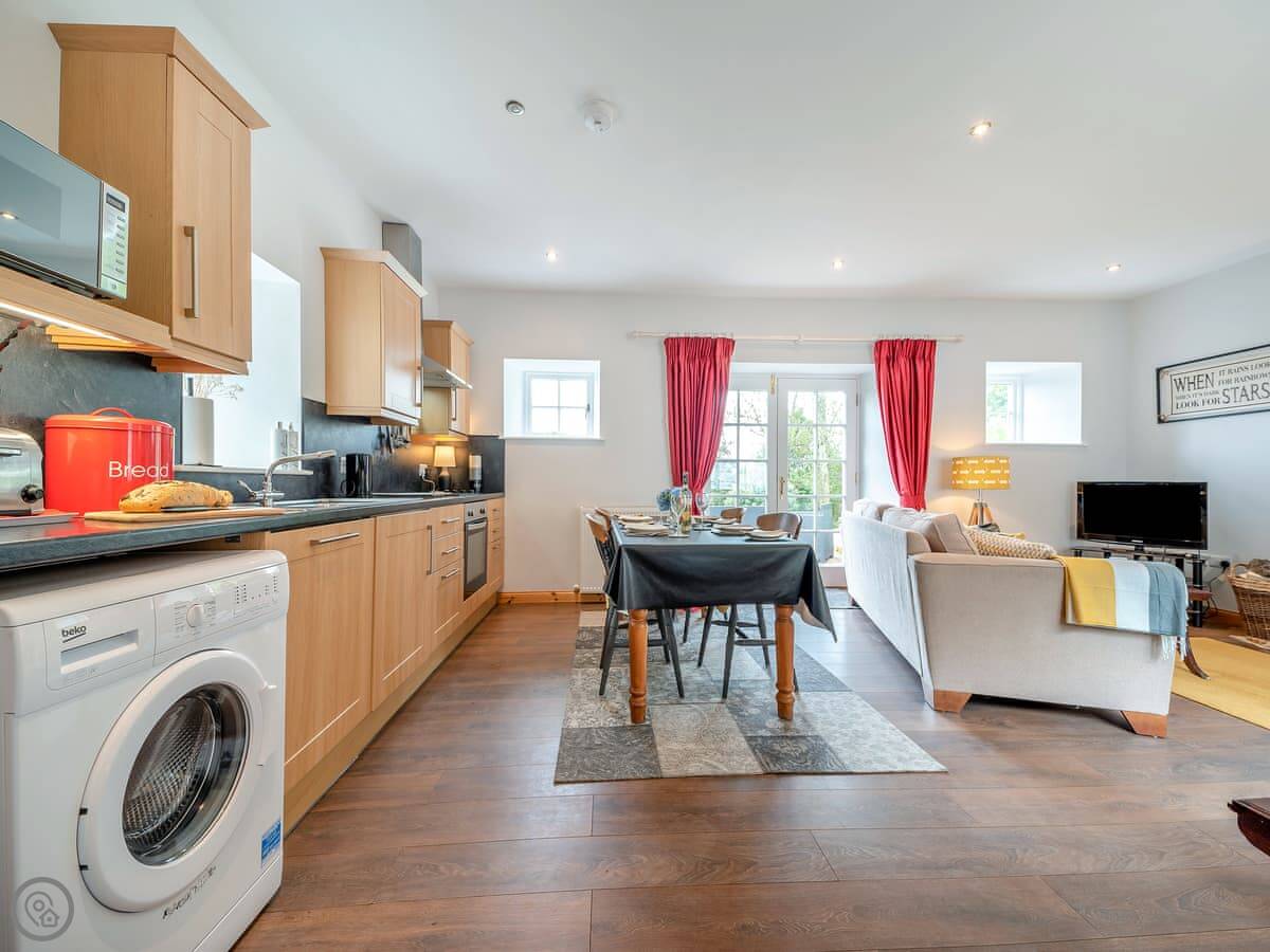 The main room is open plan: kitchen, dining and sitting area together. There's a wood burner for cooler evenings. French doors open straight out into the garden. The garden is enclosed and looks out over the Nith Valley.