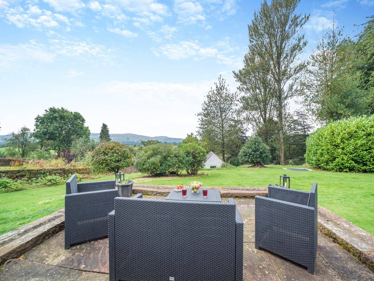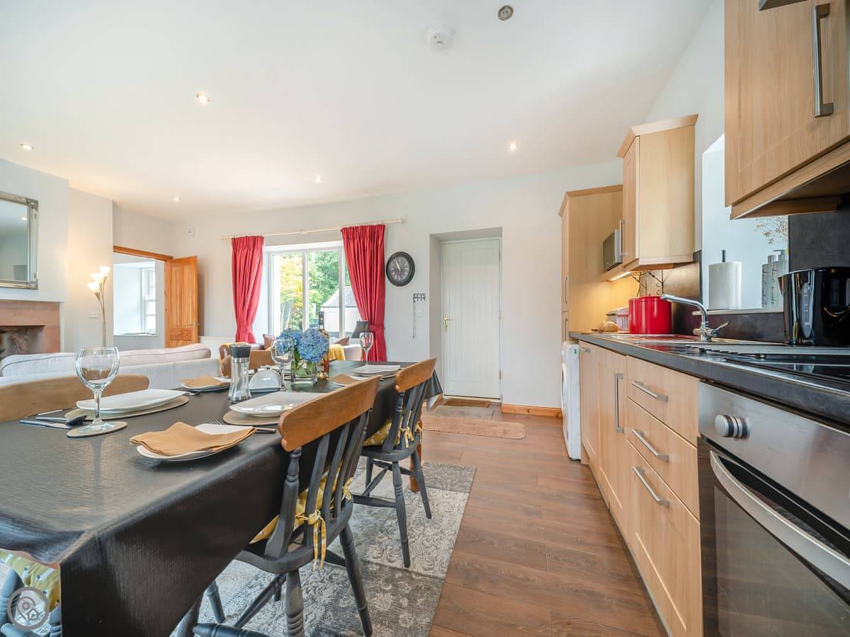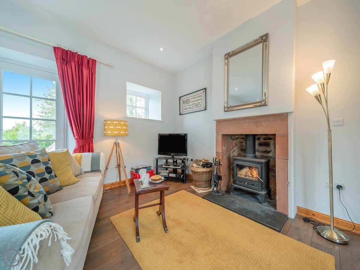 The main room is open plan: kitchen, dining and sitting area together. There's a wood burner for cooler evenings. French doors open straight out into the garden. The garden is enclosed and looks out over the Nith Valley.