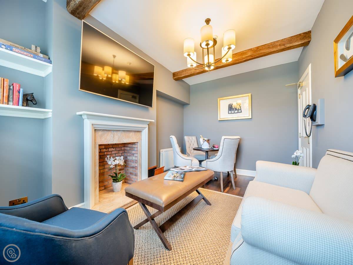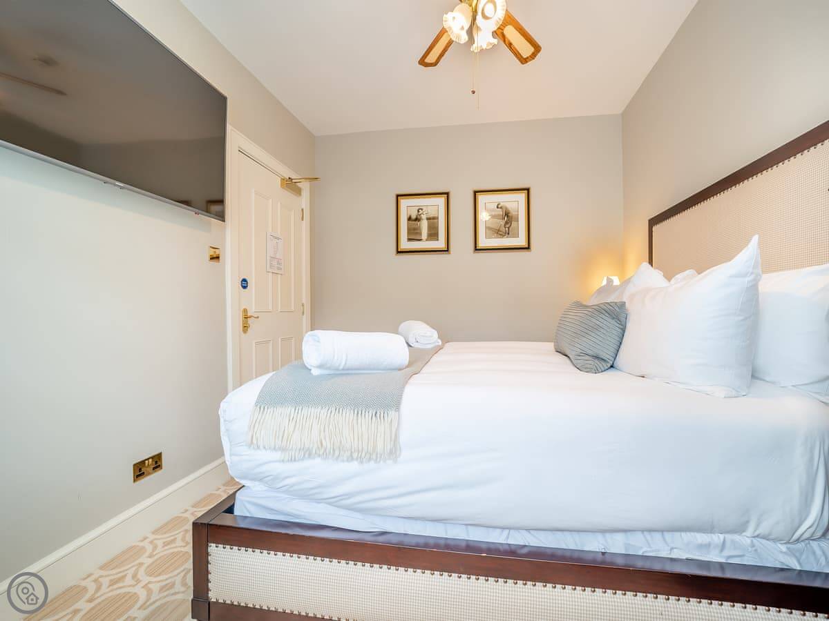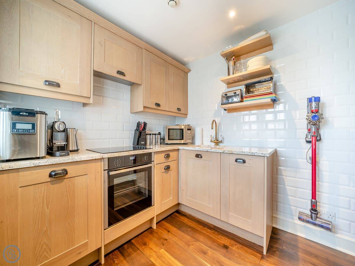 Inside, there's a living room with a large TV, a fully fitted kitchen with a dishwasher, and two bedrooms. All the bedding and towels are included. There's a cot and a highchair if you need them. You can bring up to two dogs.