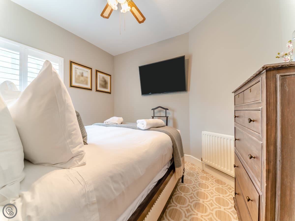 The cottage sleeps six. There are two bedrooms and one bathroom. The living area is open plan with a big TV. You get bedding and towels included. There's a cot if you need it. You can bring up to two dogs.