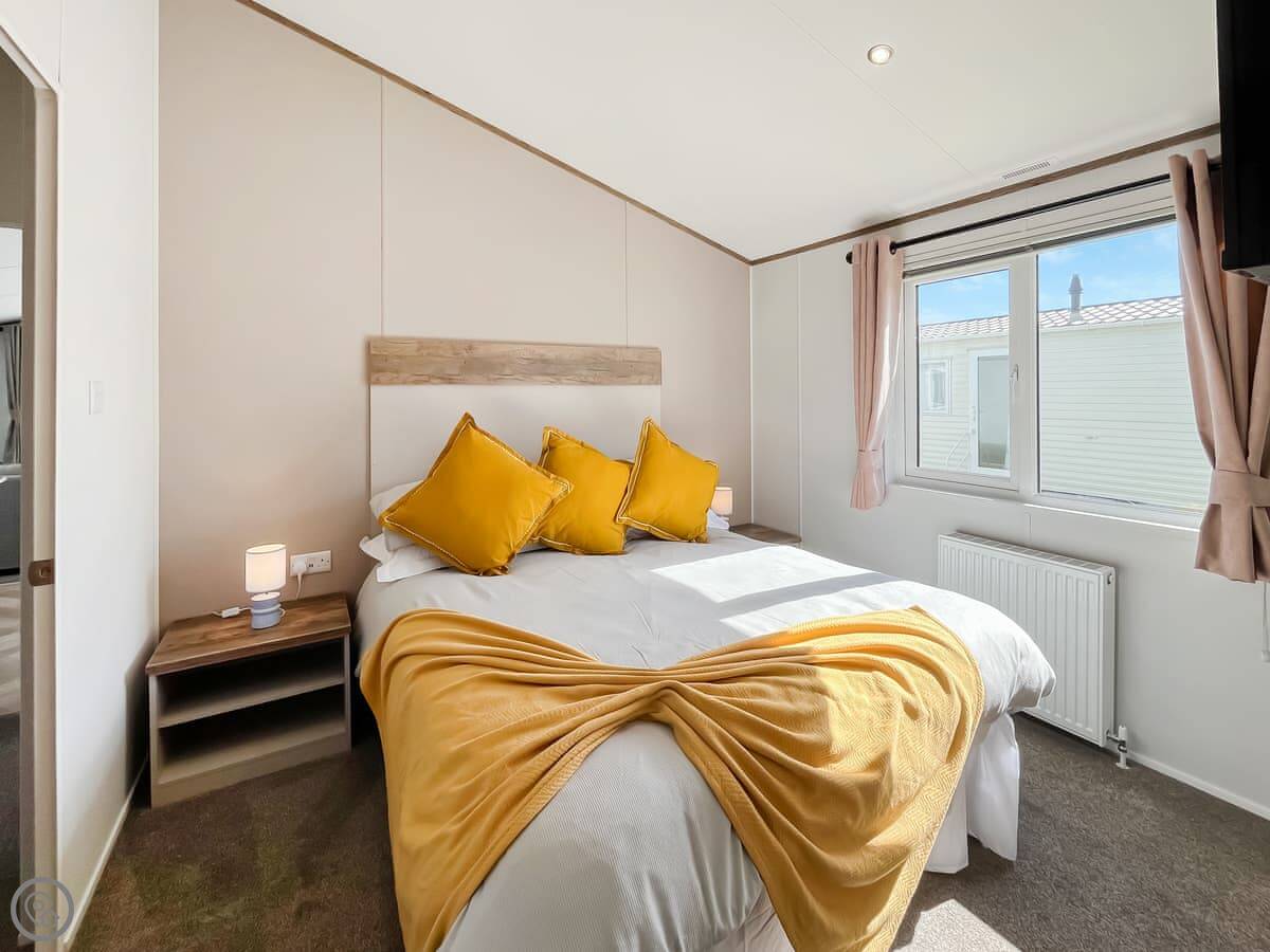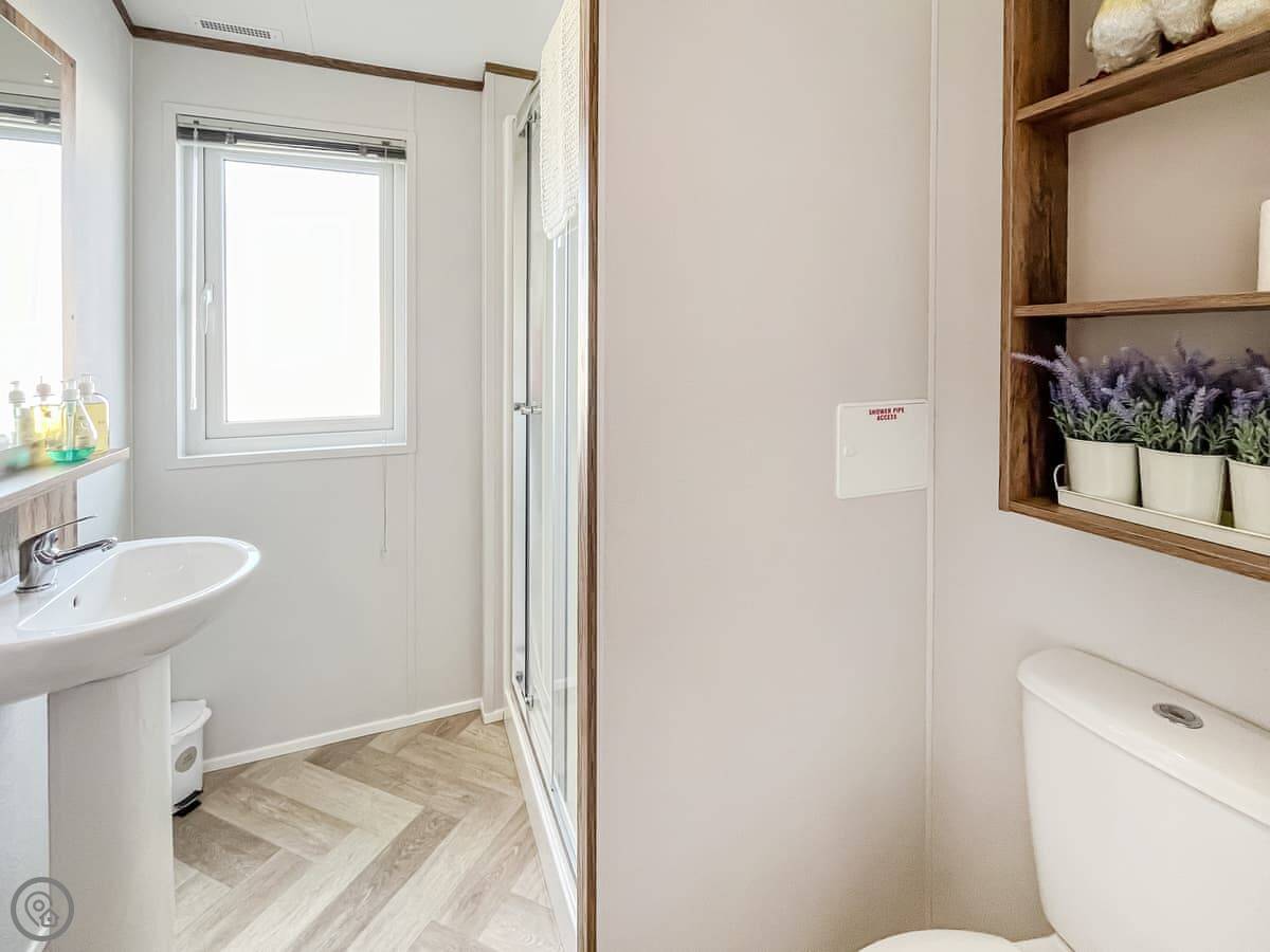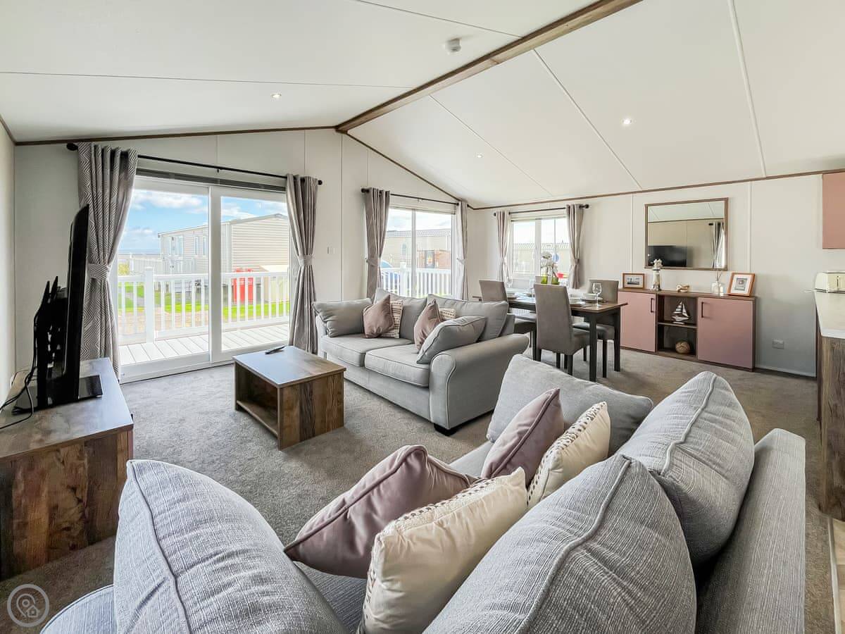 The lodge sleeps four. Two bedrooms, one is a double with an en-suite shower, the other has two singles. There's a separate family shower room too. It's all on one level, no stairs. The living area is open plan with patio doors out to a deck. The deck is enclosed, which is handy if you've got a dog or young kids.