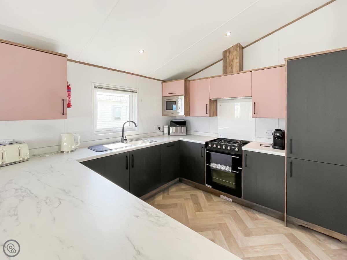 In terms of what's here, it's a 4 Star lodge. That means it's well-equipped and comfortable. There's Wi-Fi, Sky TV, a washing machine, and parking right outside. Bedding is included. You can bring one dog.