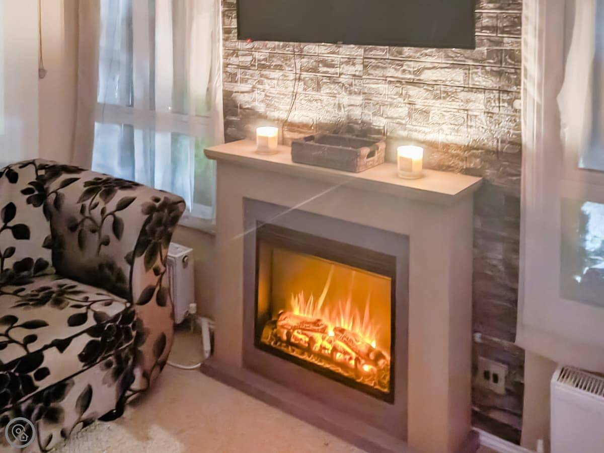 The main room is open plan, with the kitchen, dining, and living area all together. There's a dishwasher and a washing machine. The sofa faces an electric fire. French doors lead out to a decked area, which is enclosed. It's a good spot to sit outside.