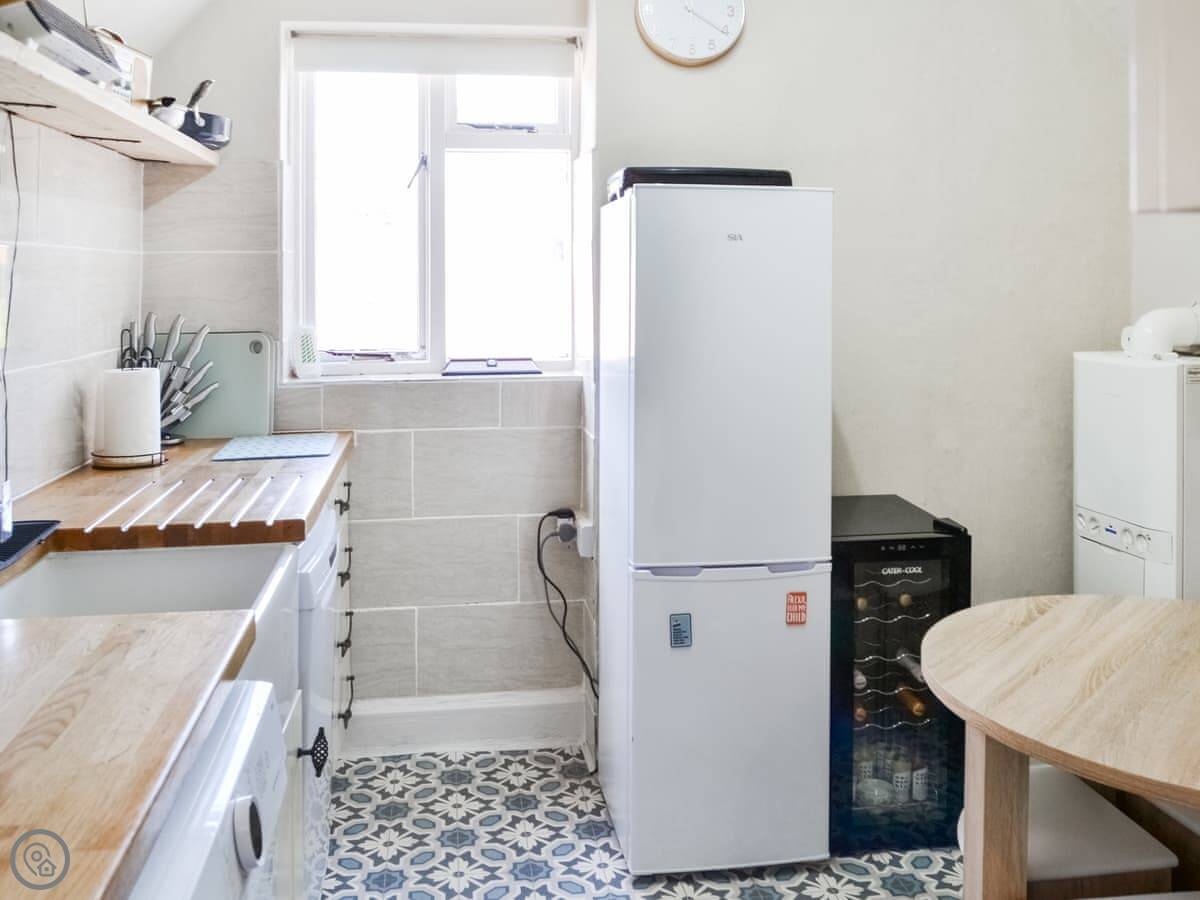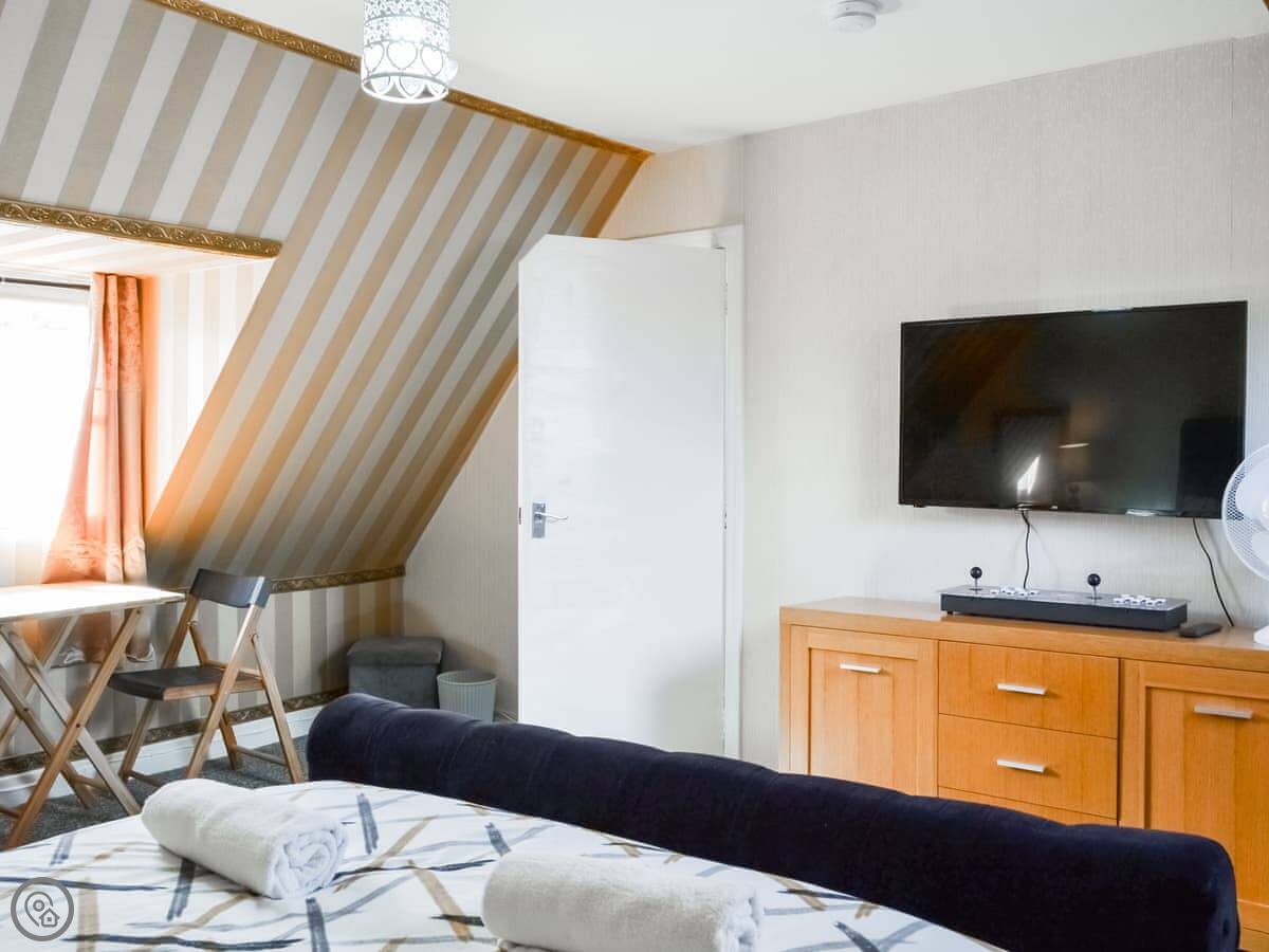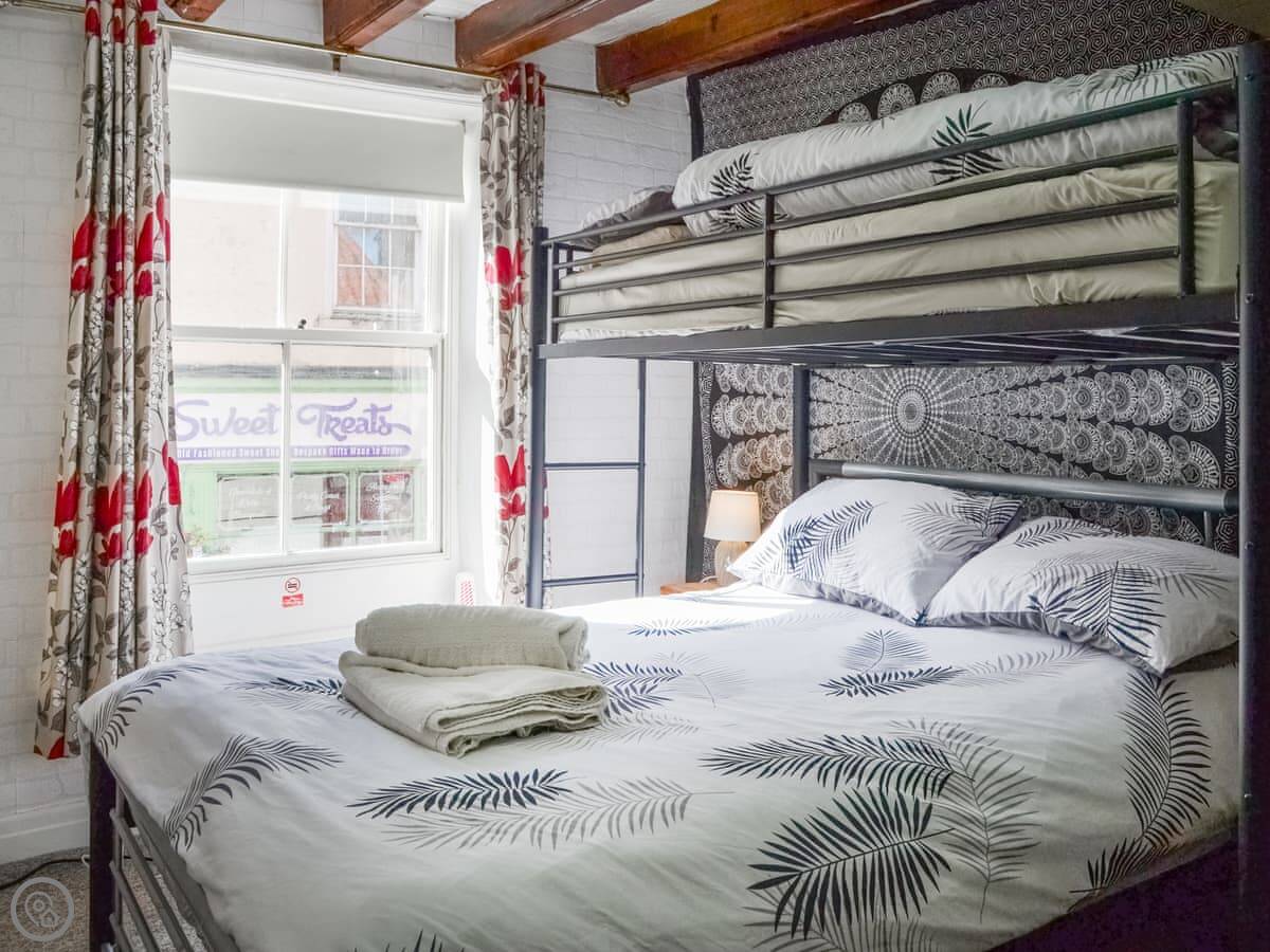 There's one bedroom on the first floor with bunk beds: a double on the bottom and a single on top. Upstairs on the second floor is the main bedroom with a king-size bed. It's got a smart TV in the living room and WiFi. Towels and bedding are included. There's a washing machine and a dishwasher.