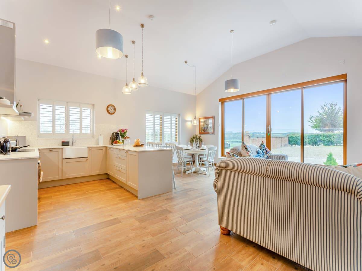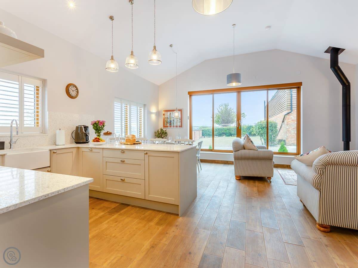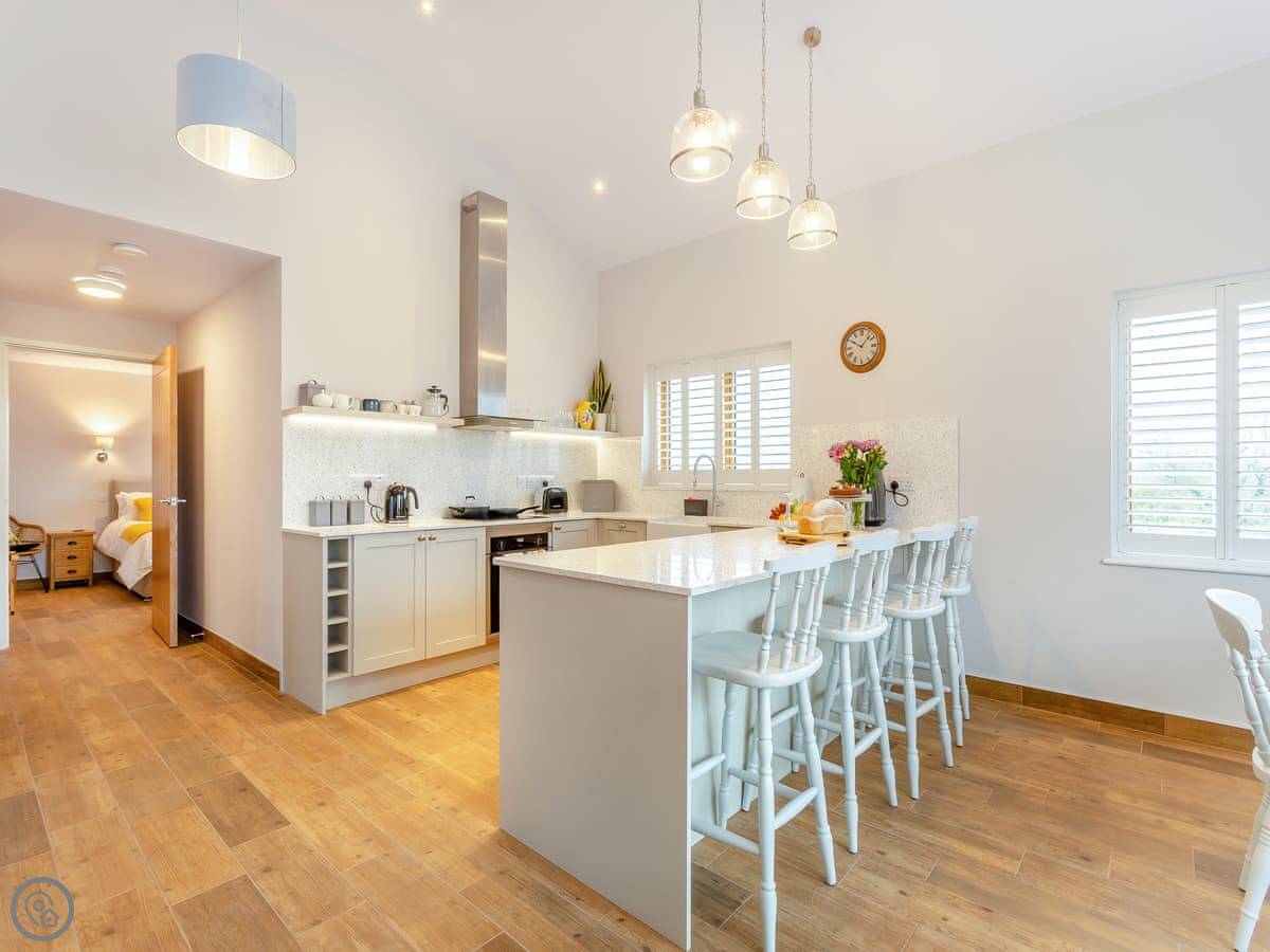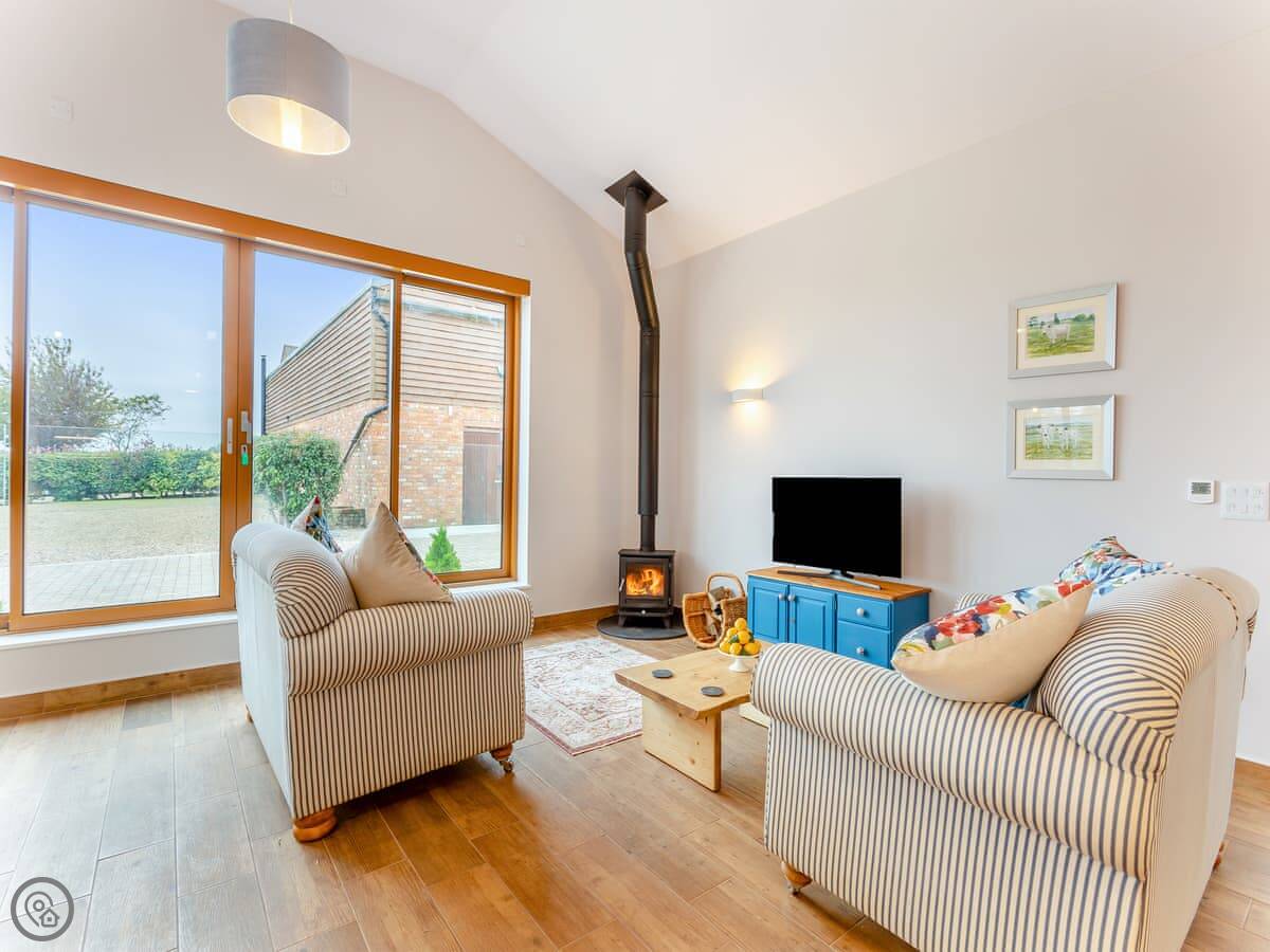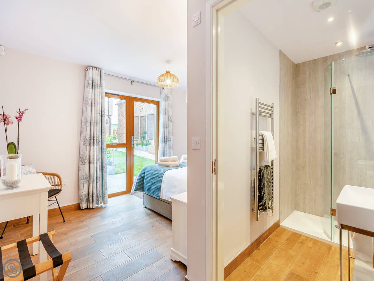 It sleeps four. Two bedrooms, both with their own shower room. Everything is on the ground floor and it's wheelchair accessible. There's underfloor heating and a wood burner in the living area. The kitchen is open plan. We allow one dog.