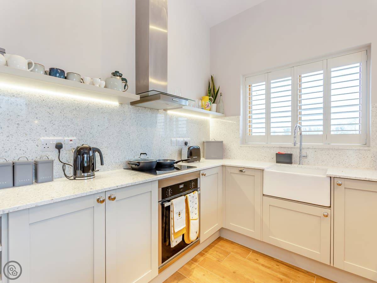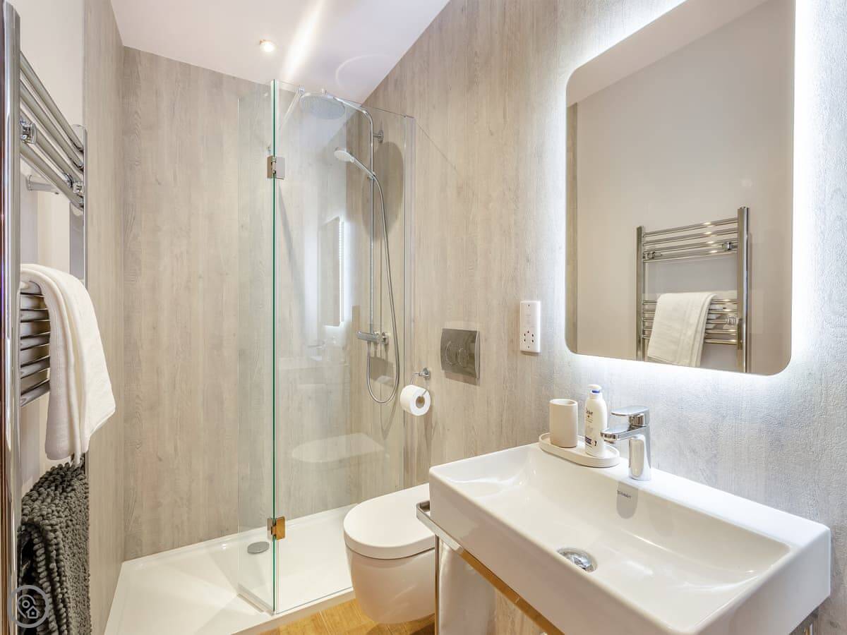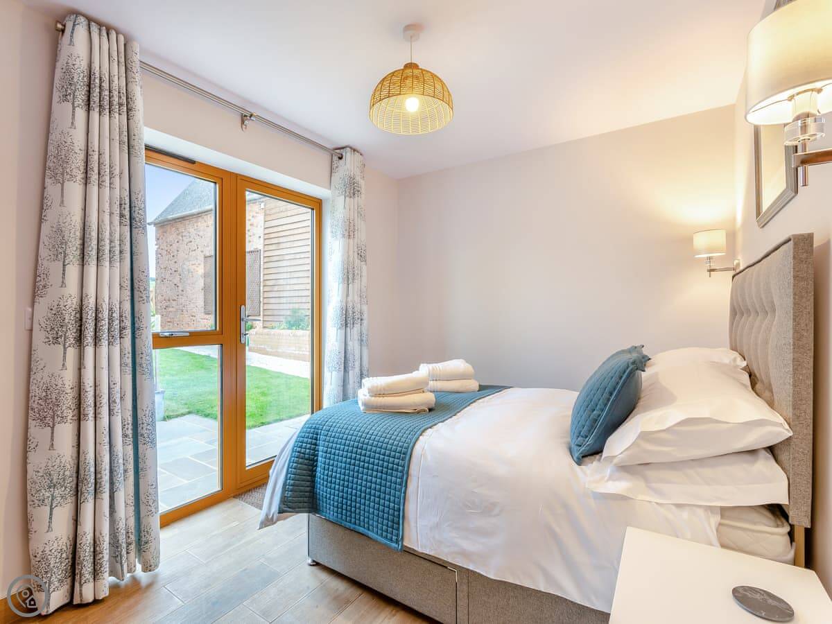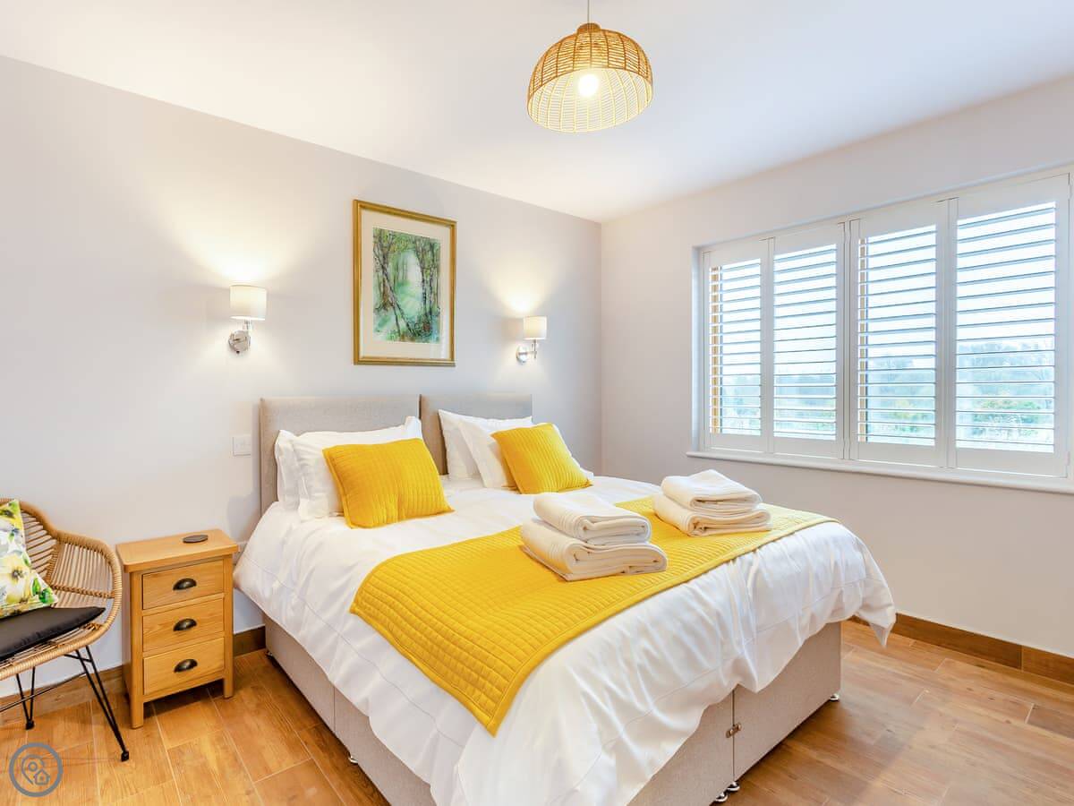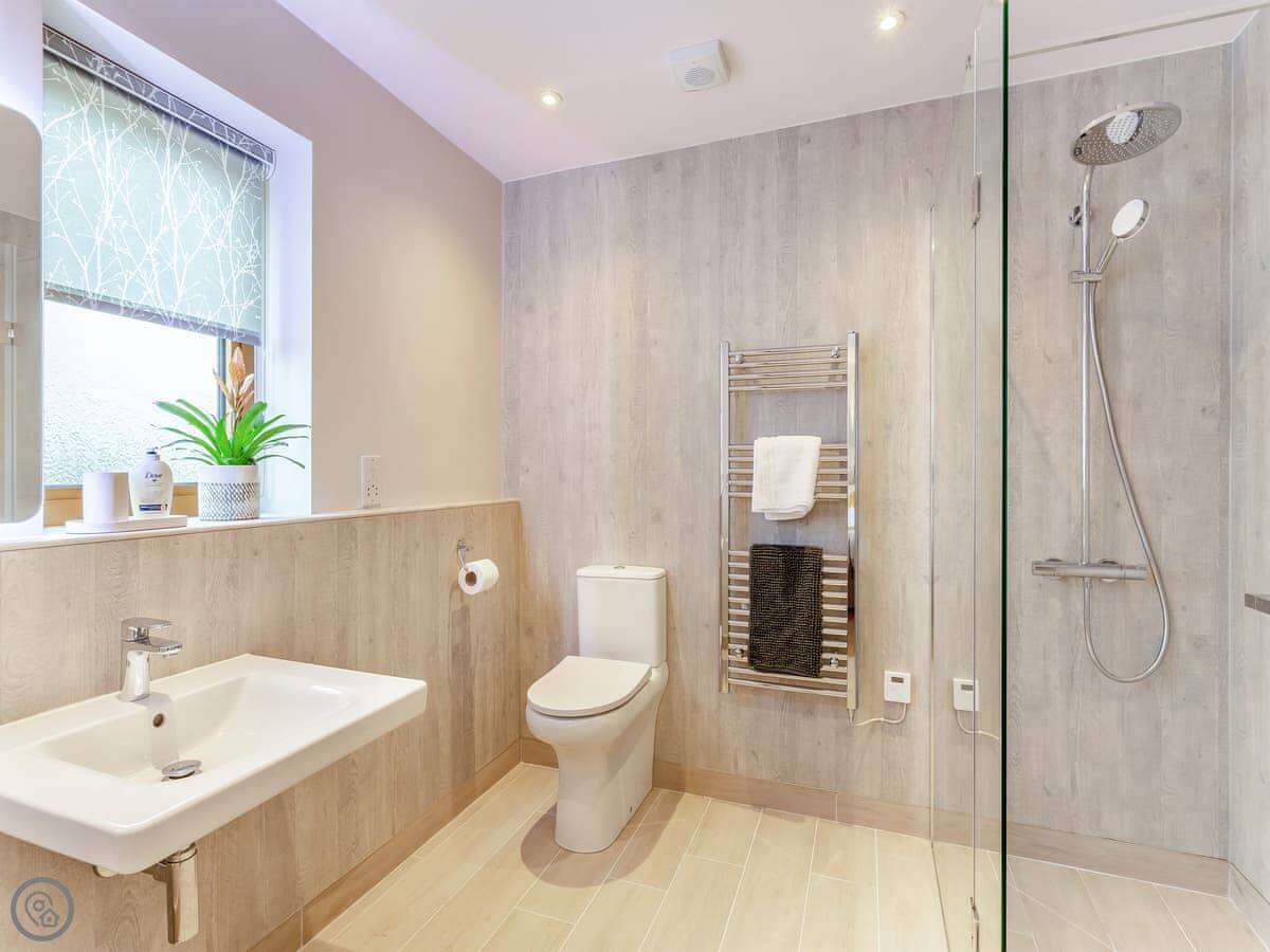 It sleeps four. Two bedrooms, both with their own shower room. Everything is on the ground floor and it's wheelchair accessible. There's underfloor heating and a wood burner in the living area. The kitchen is open plan. We allow one dog.