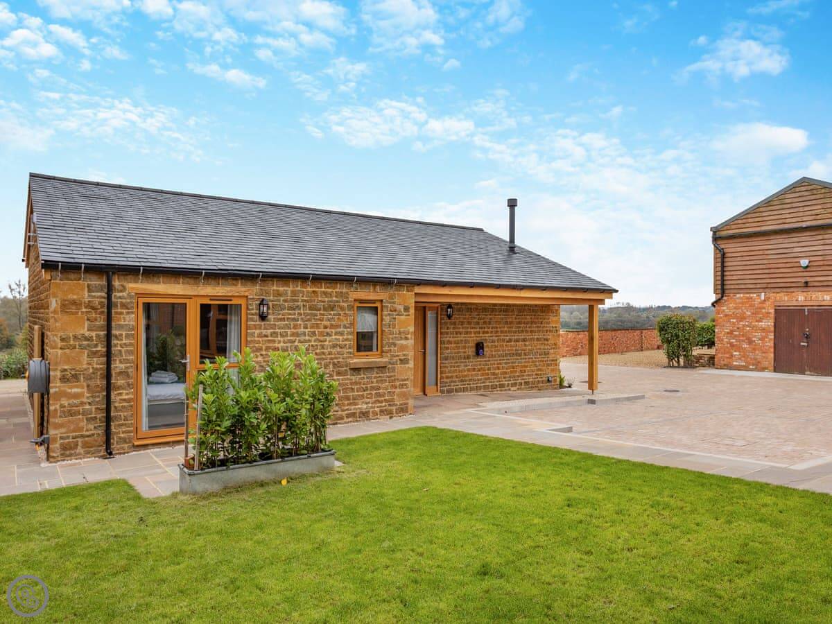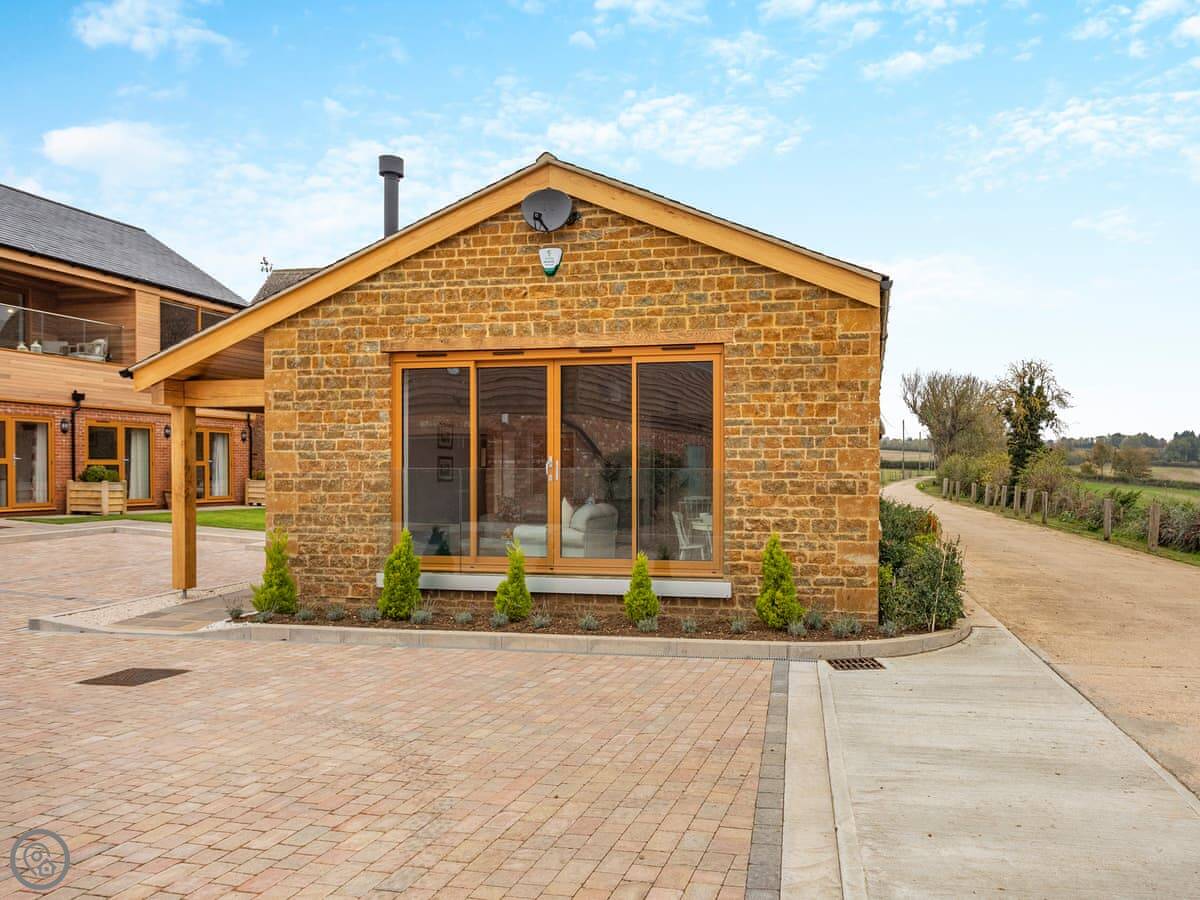 Meadow View is near Woodford in Northamptonshire. It's a single-storey cottage, brand new for this year. It's on a farm, so it's just fields out of the windows. You can walk straight out onto the Nene Way path from the gate.