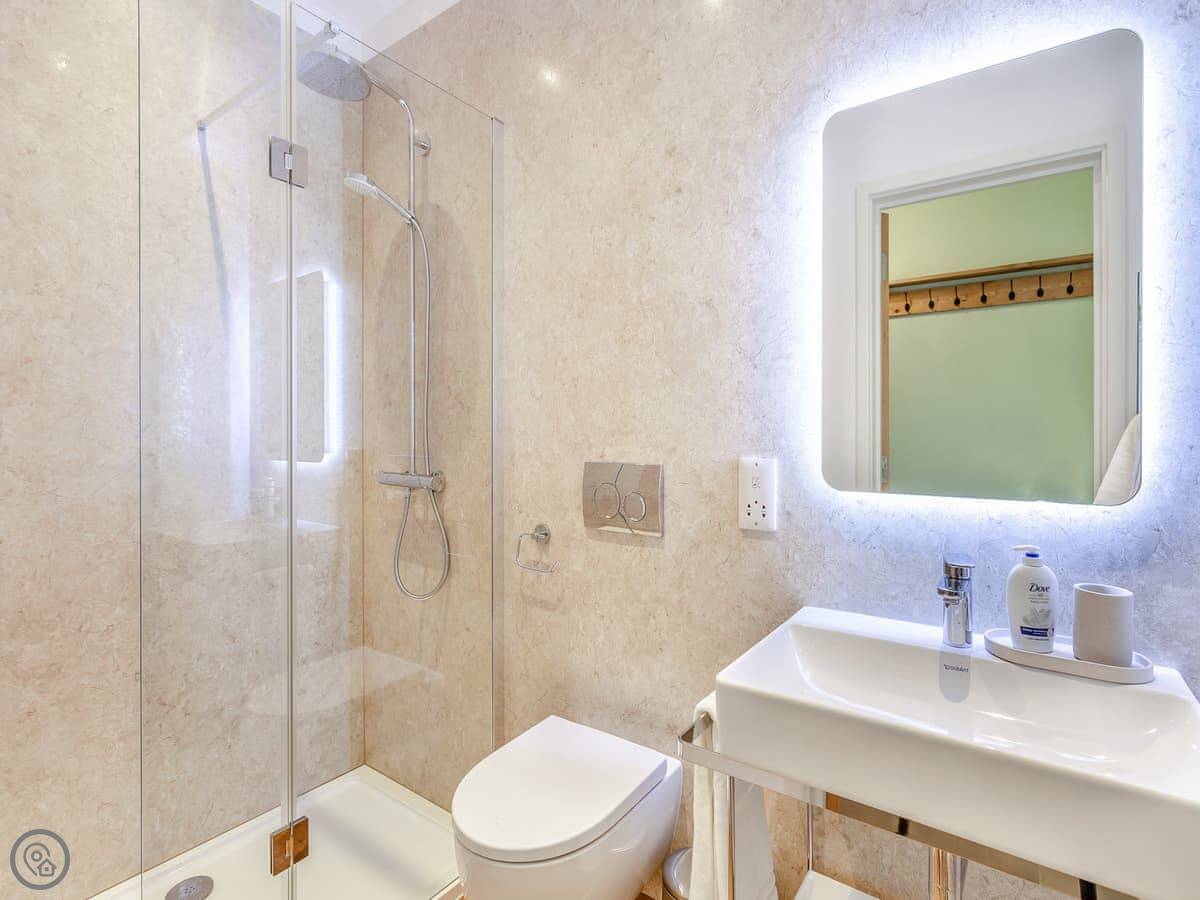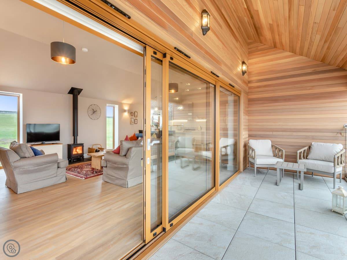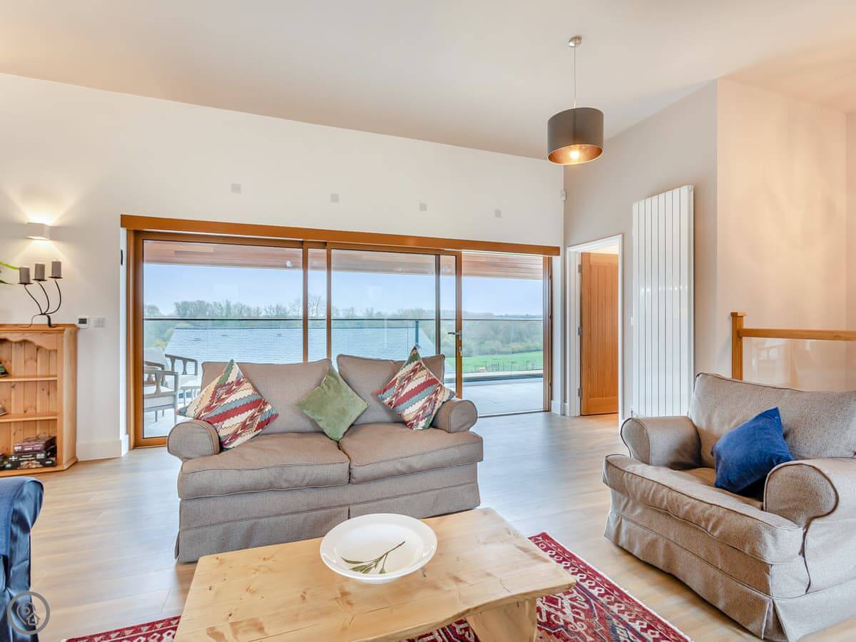 It sleeps six. There are three bedrooms, all downstairs. Each has its own shower room, which is handy. There's also a wet room downstairs, and a washing machine in a utility room. Upstairs is one big room with the kitchen, dining table, and living area. The ceiling is high and there are big windows. You get a good view of the land from there. There's a big balcony off this room. You can sit out there.