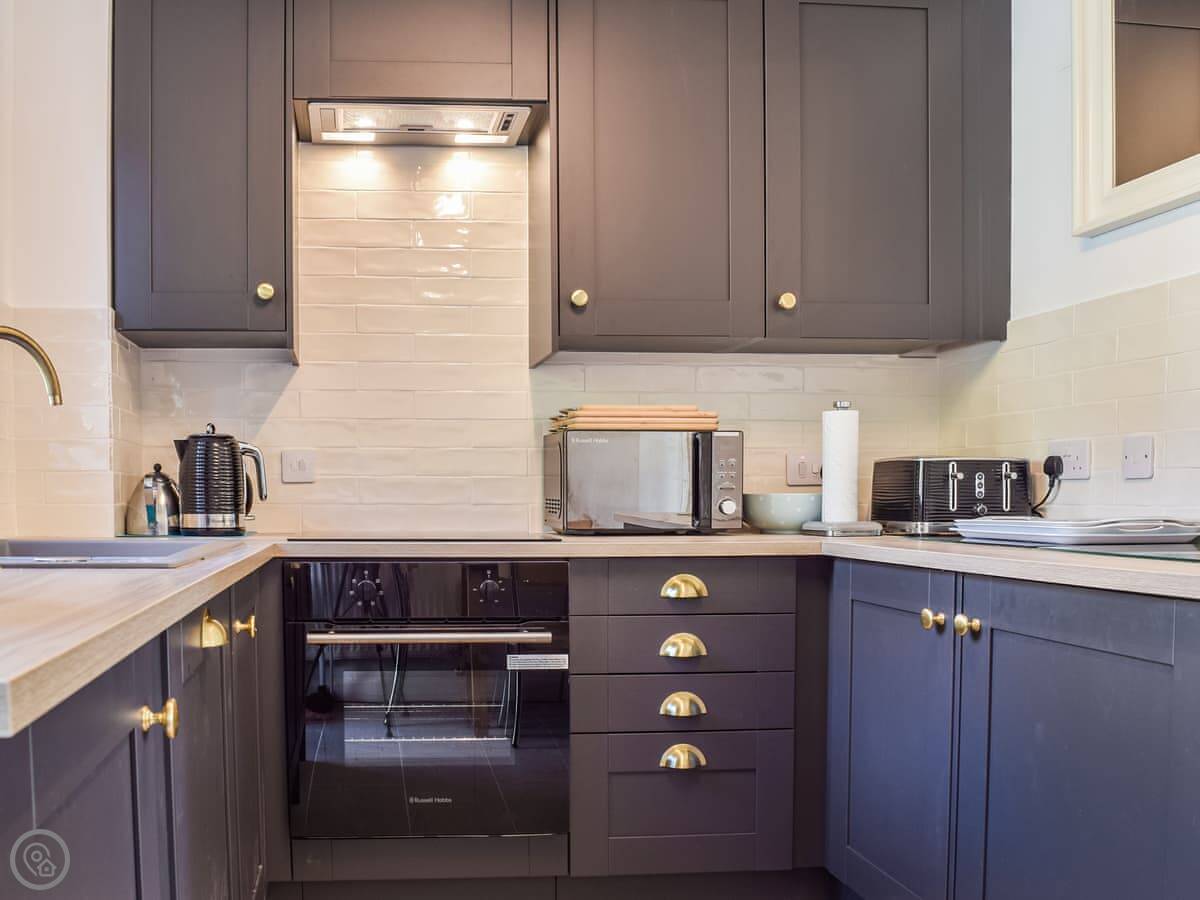 It's got a 4 Star rating. Everything is in good order and it feels light. The living room and kitchen are all one space. The kitchen has a dishwasher. French doors open to a small patio garden that's fully enclosed.