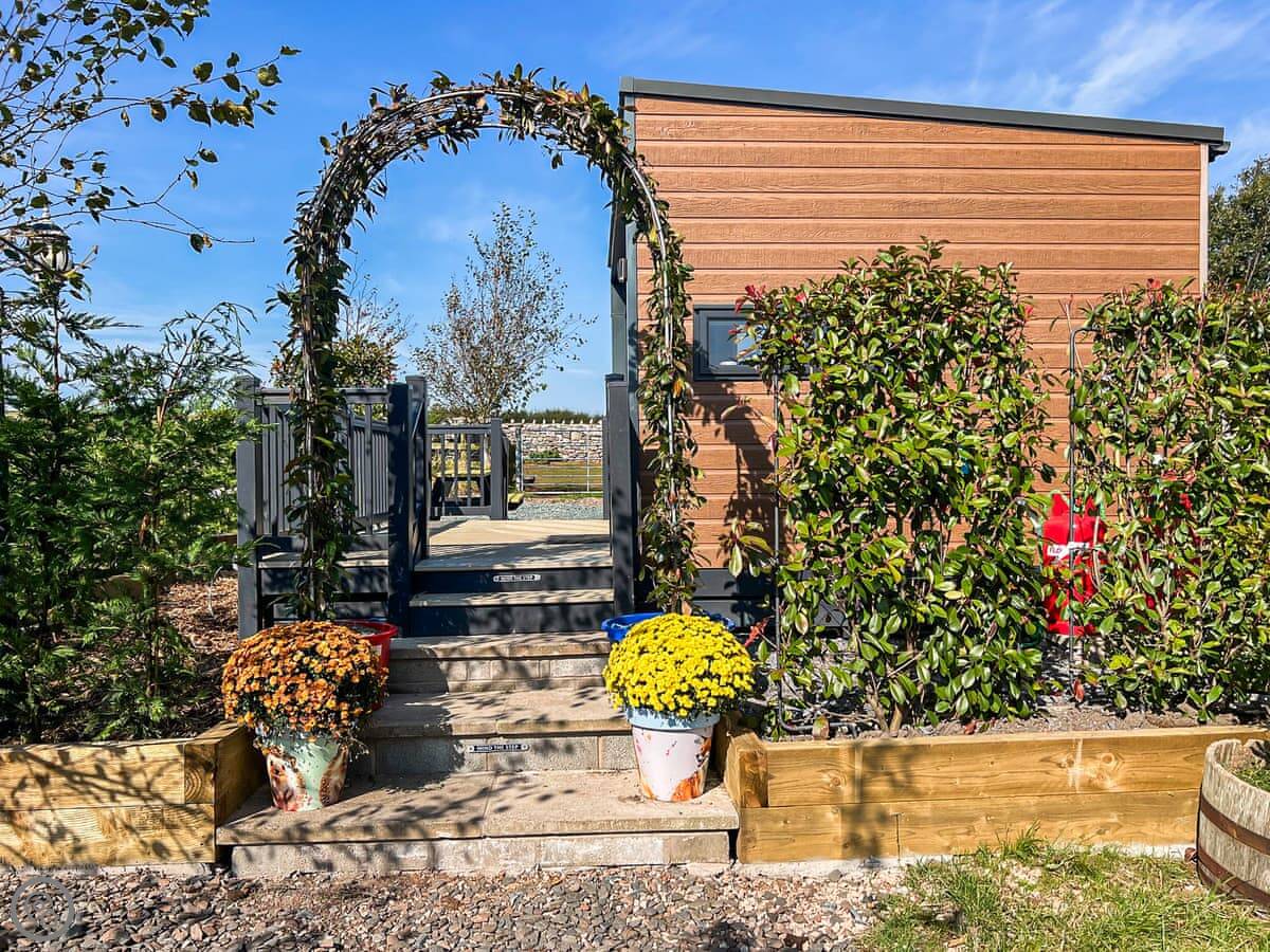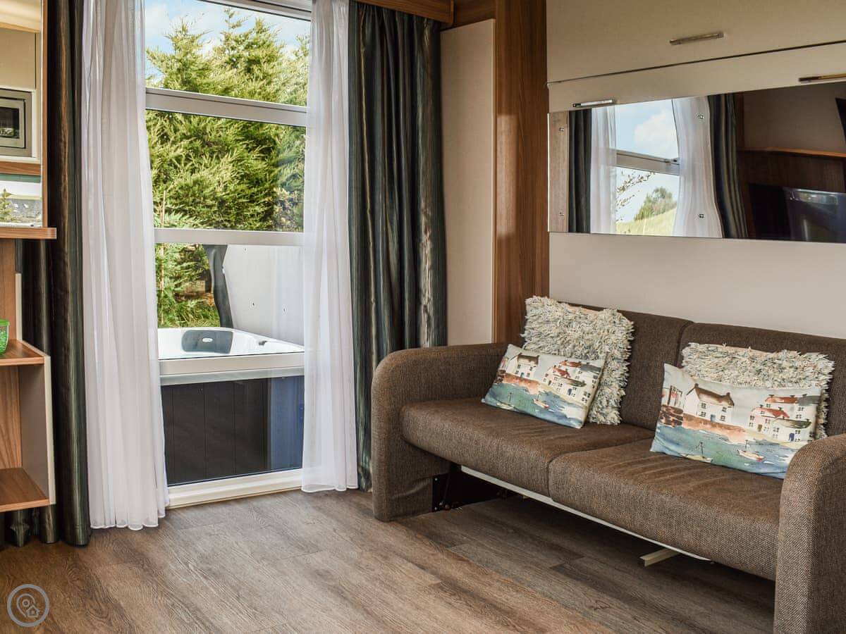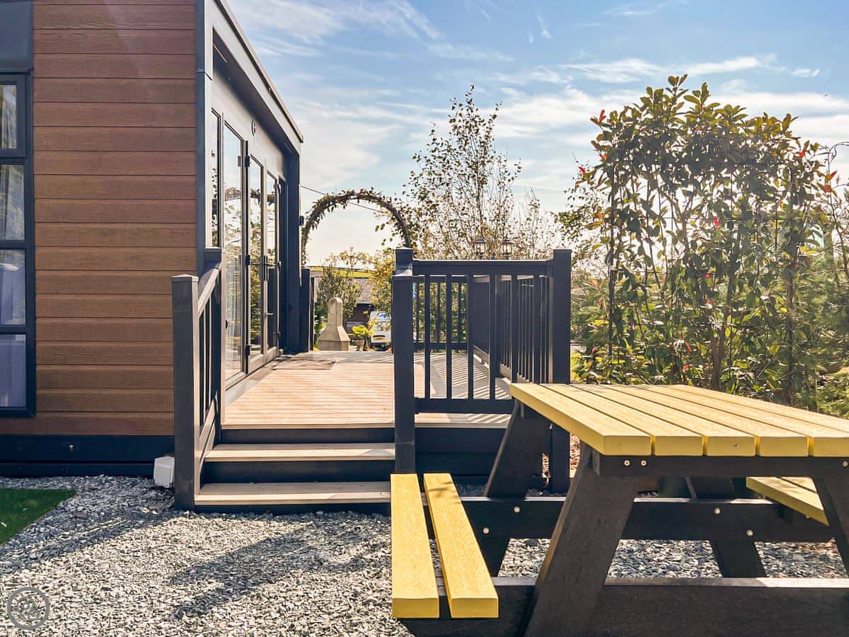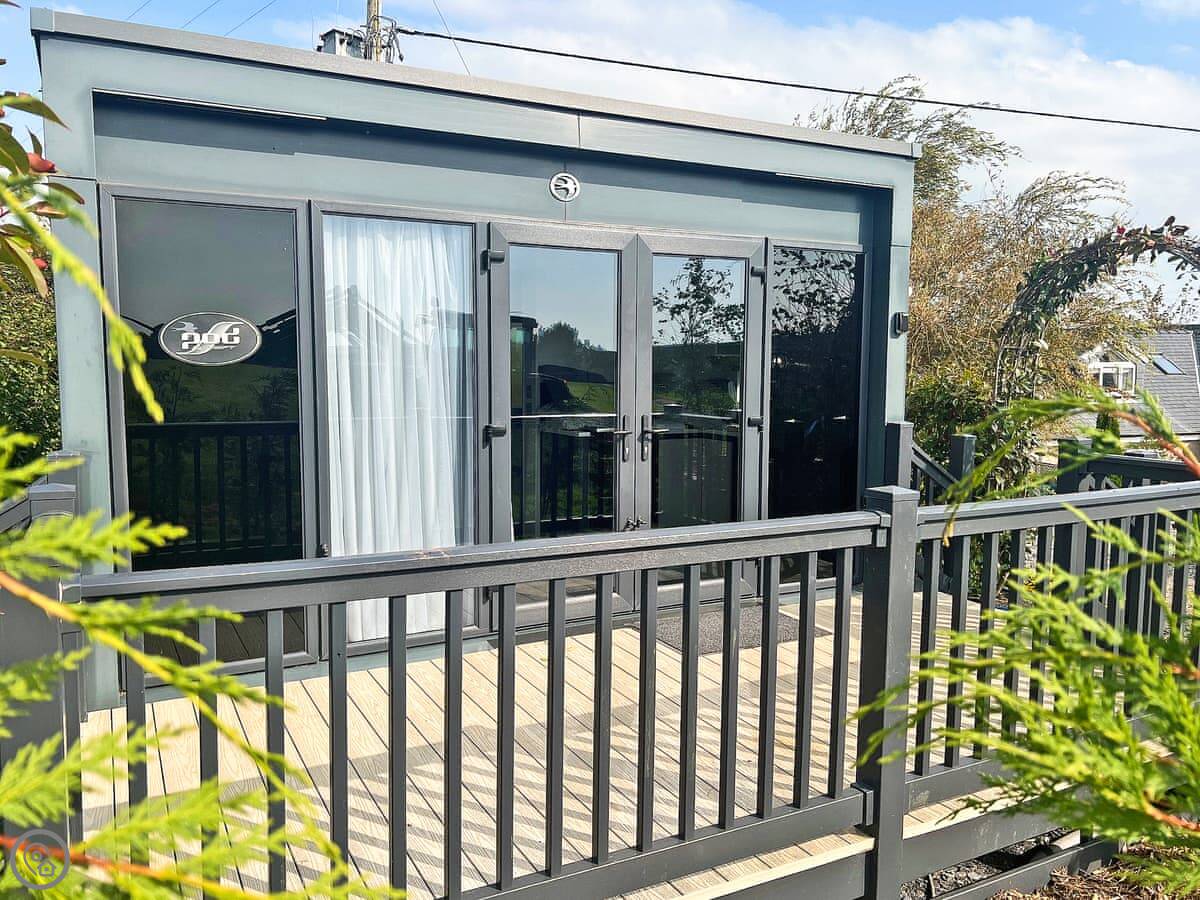 Outside, you have a private deck with a hot tub. You can use that anytime. There's a barbecue there too, and you can buy fuel for it on site. The pod sits in a field on a 12-acre site, so it's quiet. You can park right next to it.