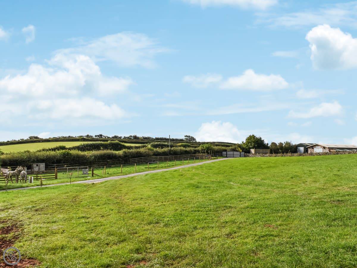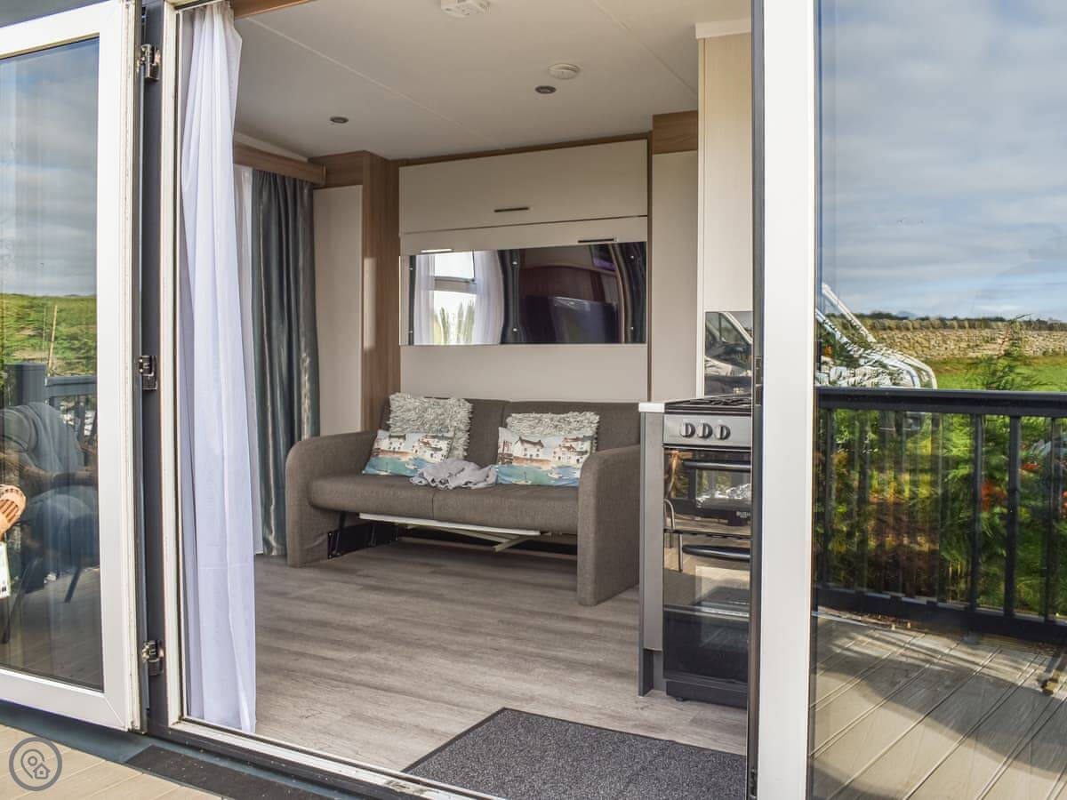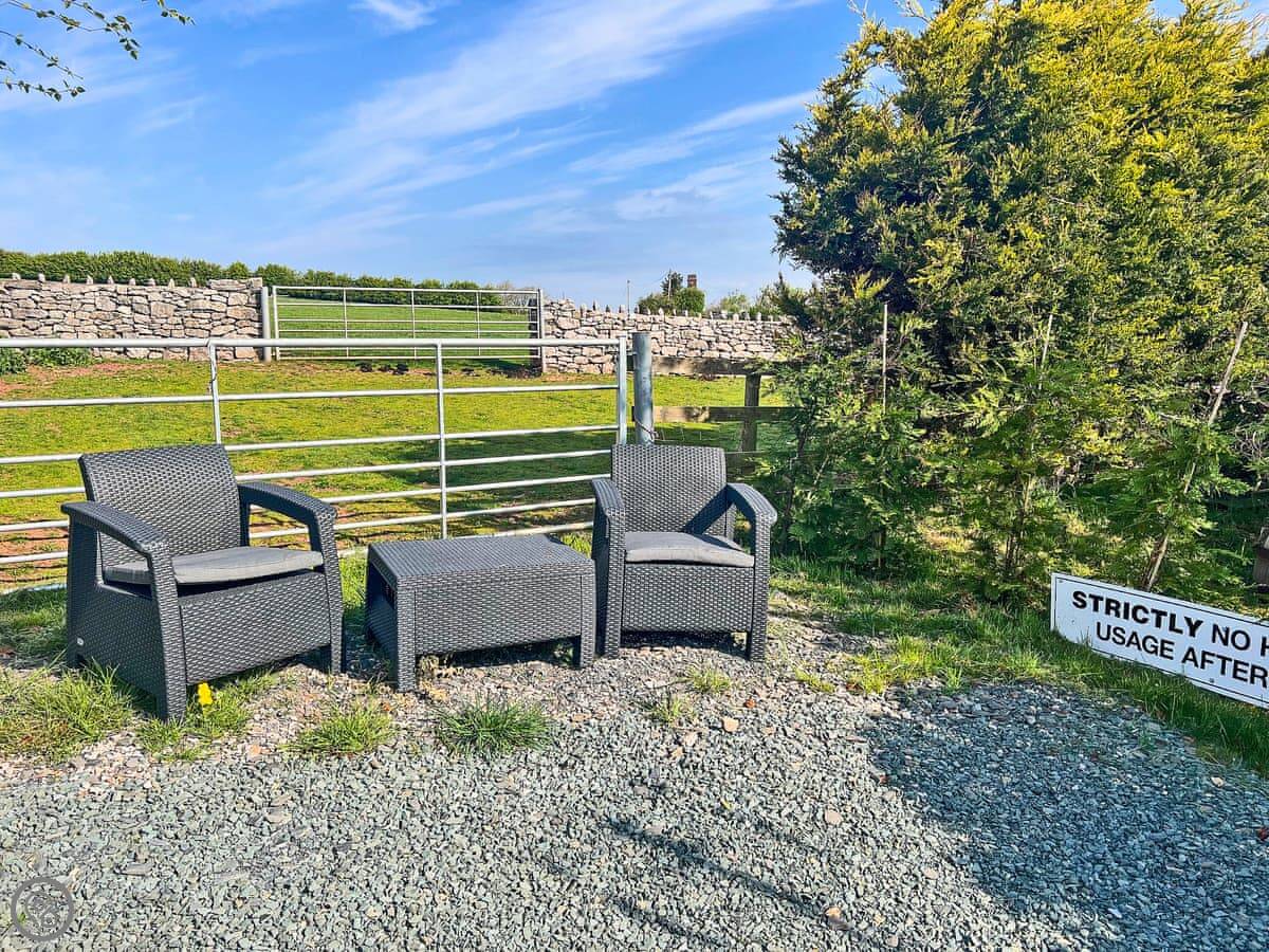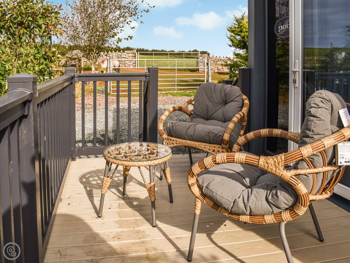 Outside, you have a private deck with a hot tub. You can use that anytime. There's a barbecue there too, and you can buy fuel for it on site. The pod sits in a field on a 12-acre site, so it's quiet. You can park right next to it.