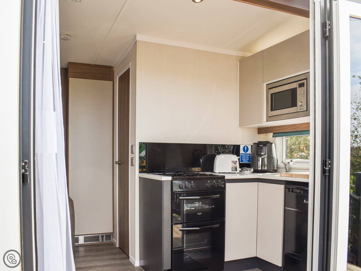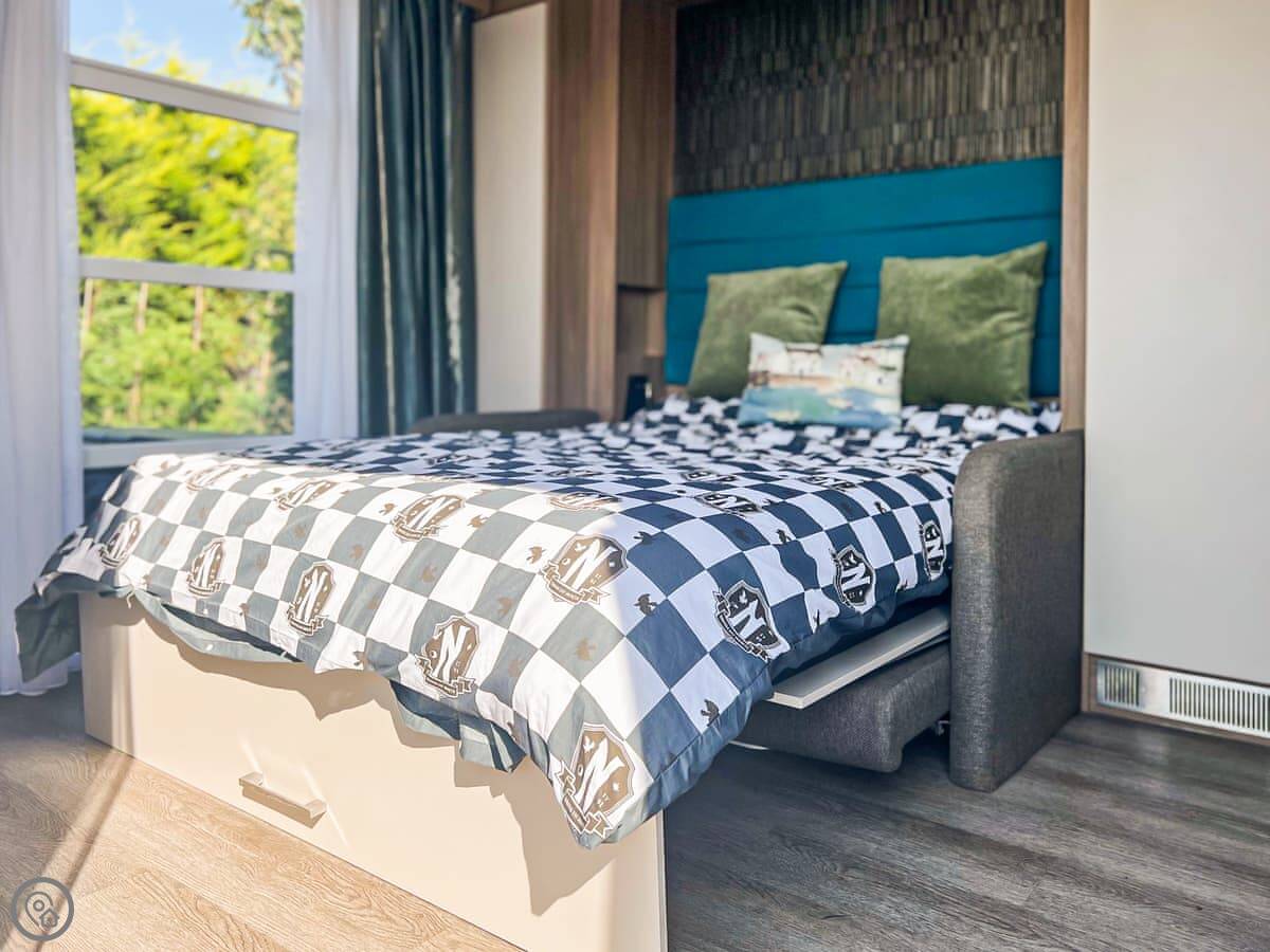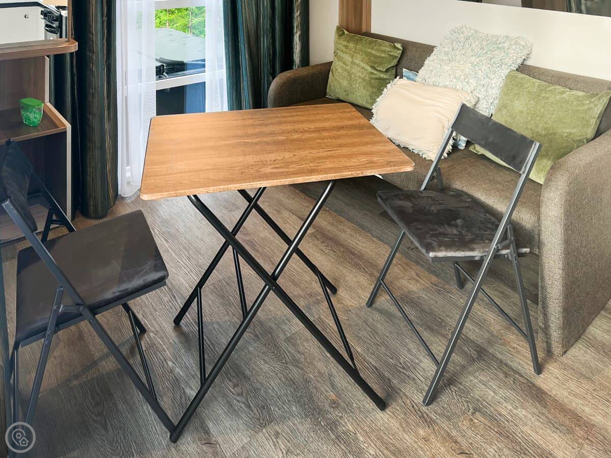 It's a 3 Star pod. That means it's clean and has what you need, but it's compact. The bed folds down from the wall in the living area. The shower is in an en-suite. There's a kitchenette with a fridge, a hob, and a microwave. We provide tea and coffee.