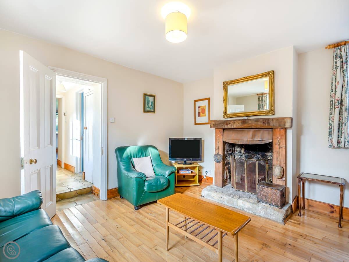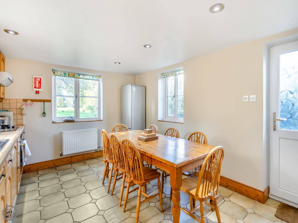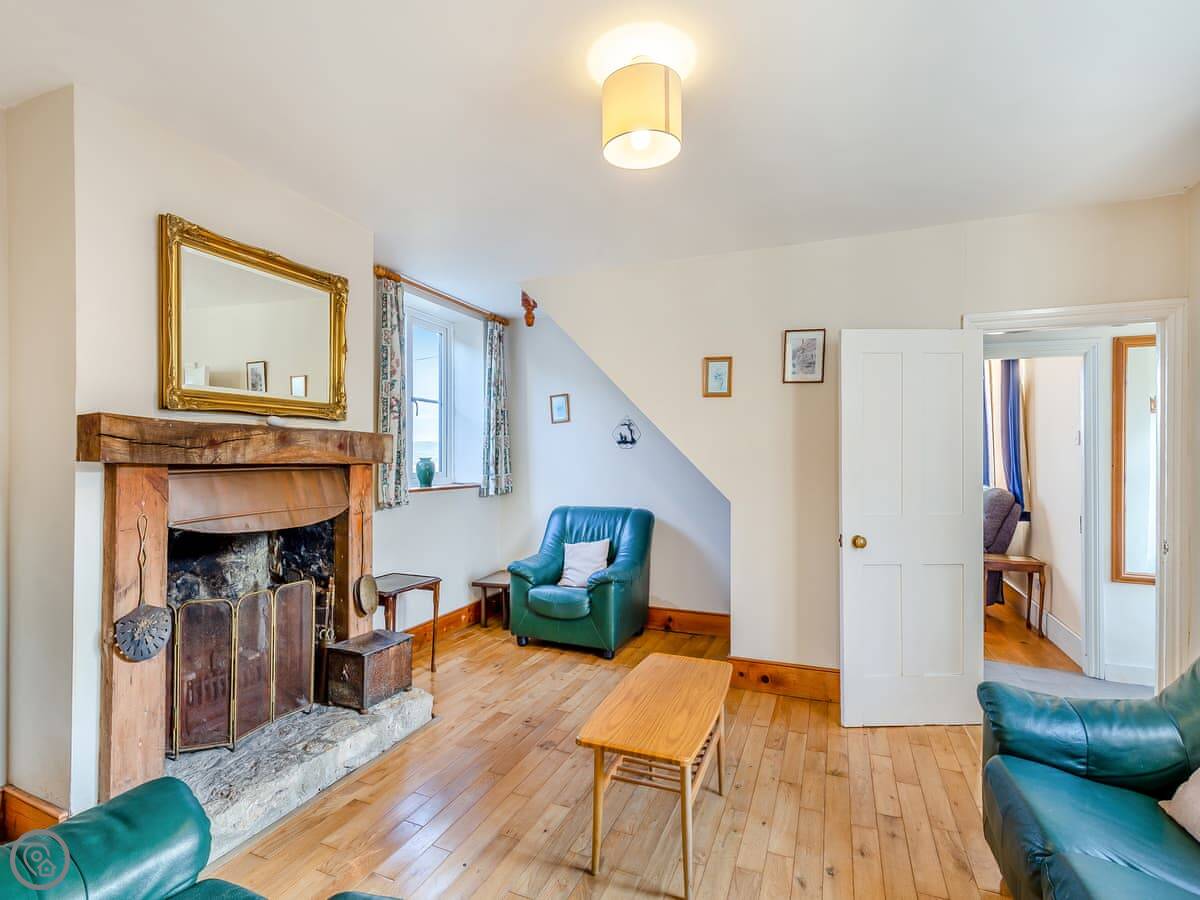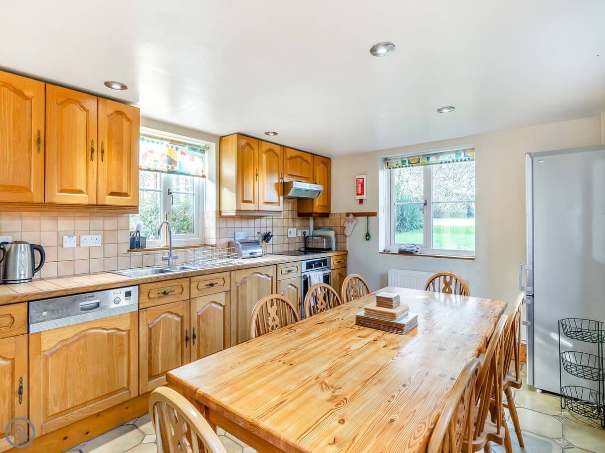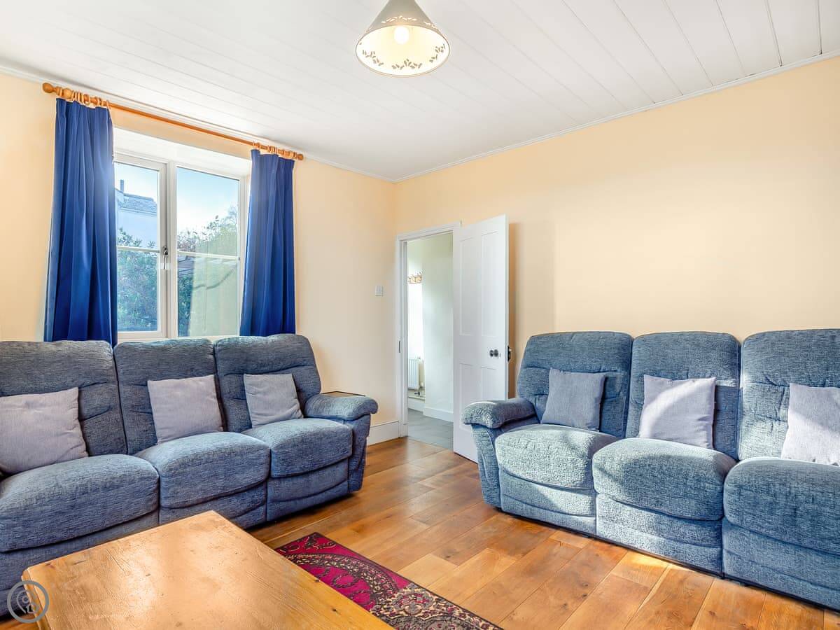 It sleeps seven in four bedrooms. There are two bathrooms, one downstairs and a shower room upstairs. It's got a 4 Star rating. The kitchen has what you'd need: oven, hob, dishwasher, washing machine, fridge-freezer. There are two living rooms downstairs, which can be useful.