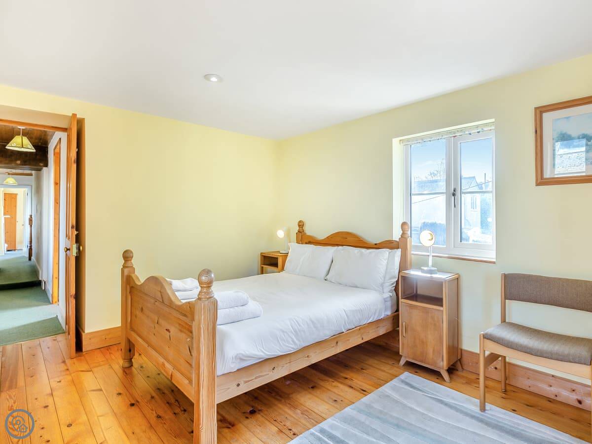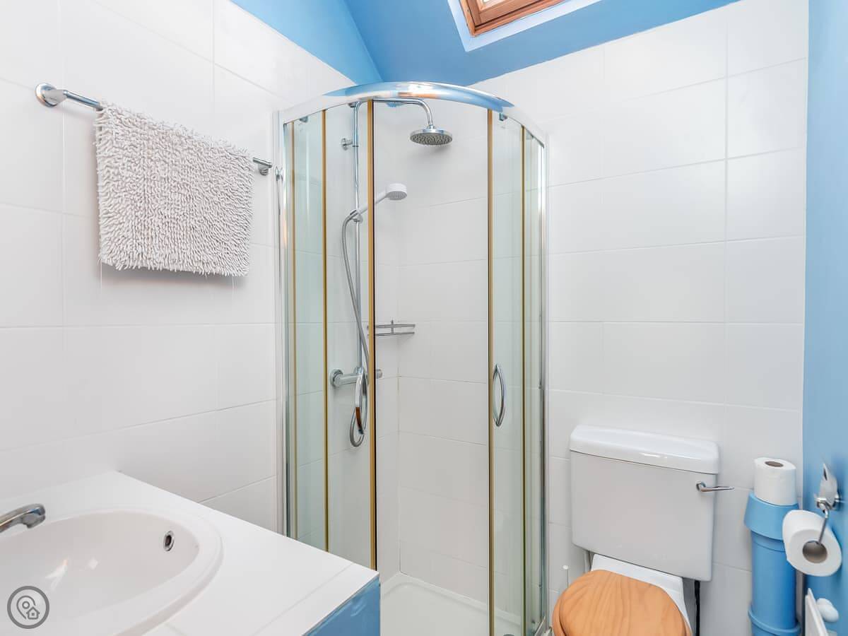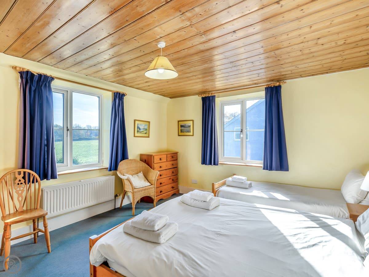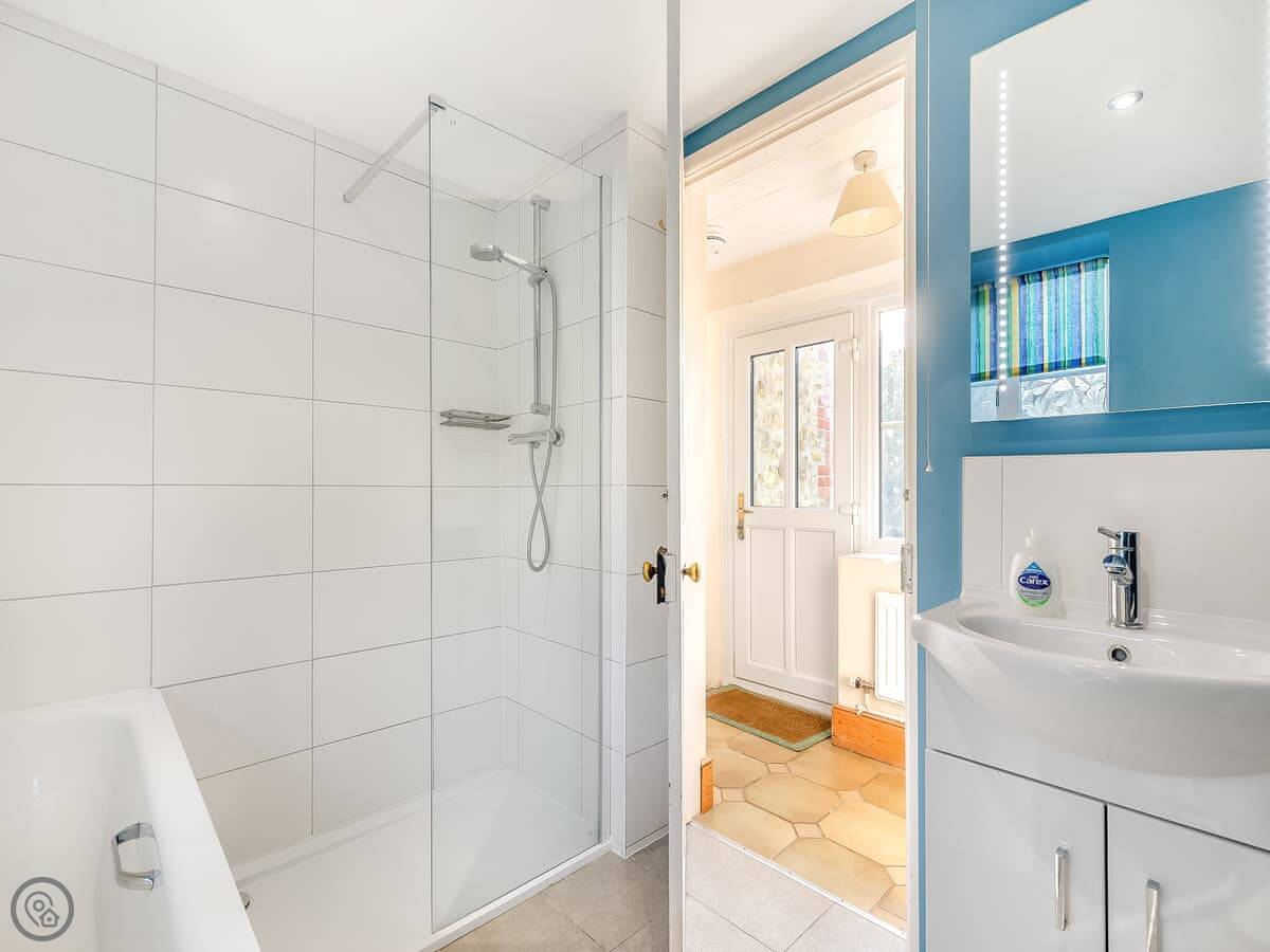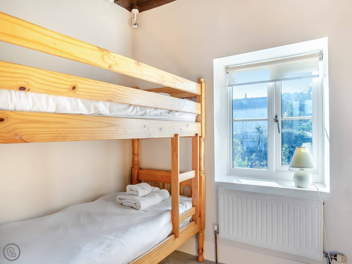 It sleeps seven in four bedrooms. There are two bathrooms, one downstairs and a shower room upstairs. It's got a 4 Star rating. The kitchen has what you'd need: oven, hob, dishwasher, washing machine, fridge-freezer. There are two living rooms downstairs, which can be useful.