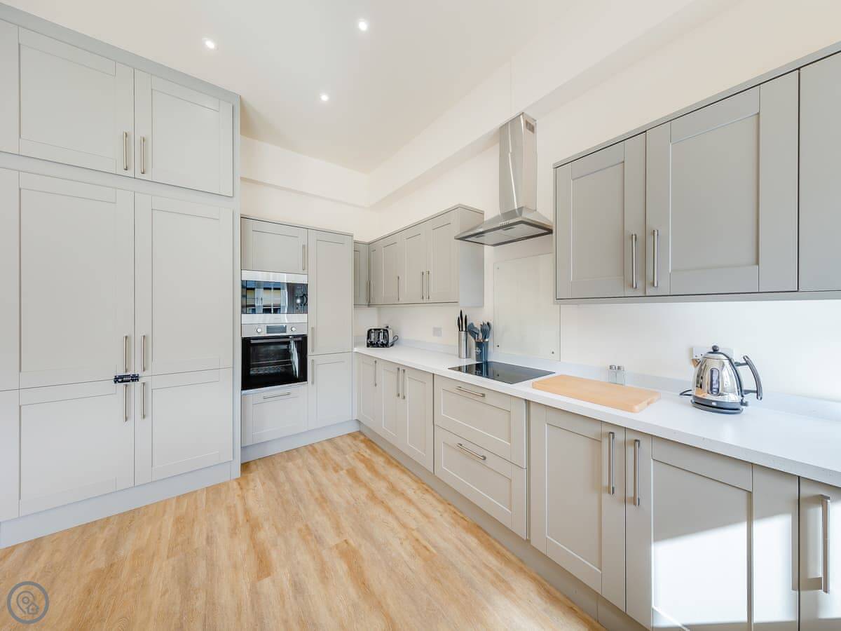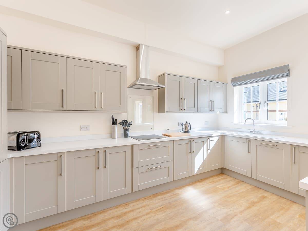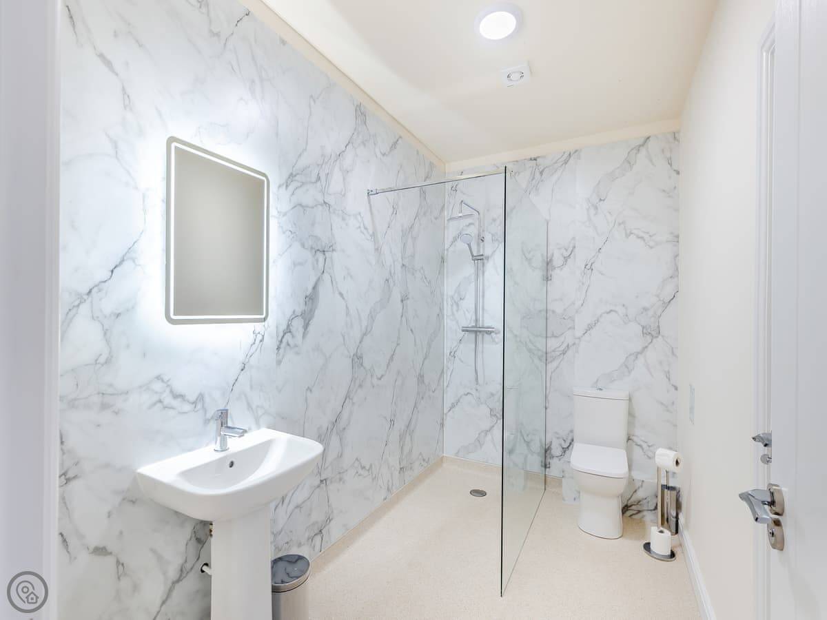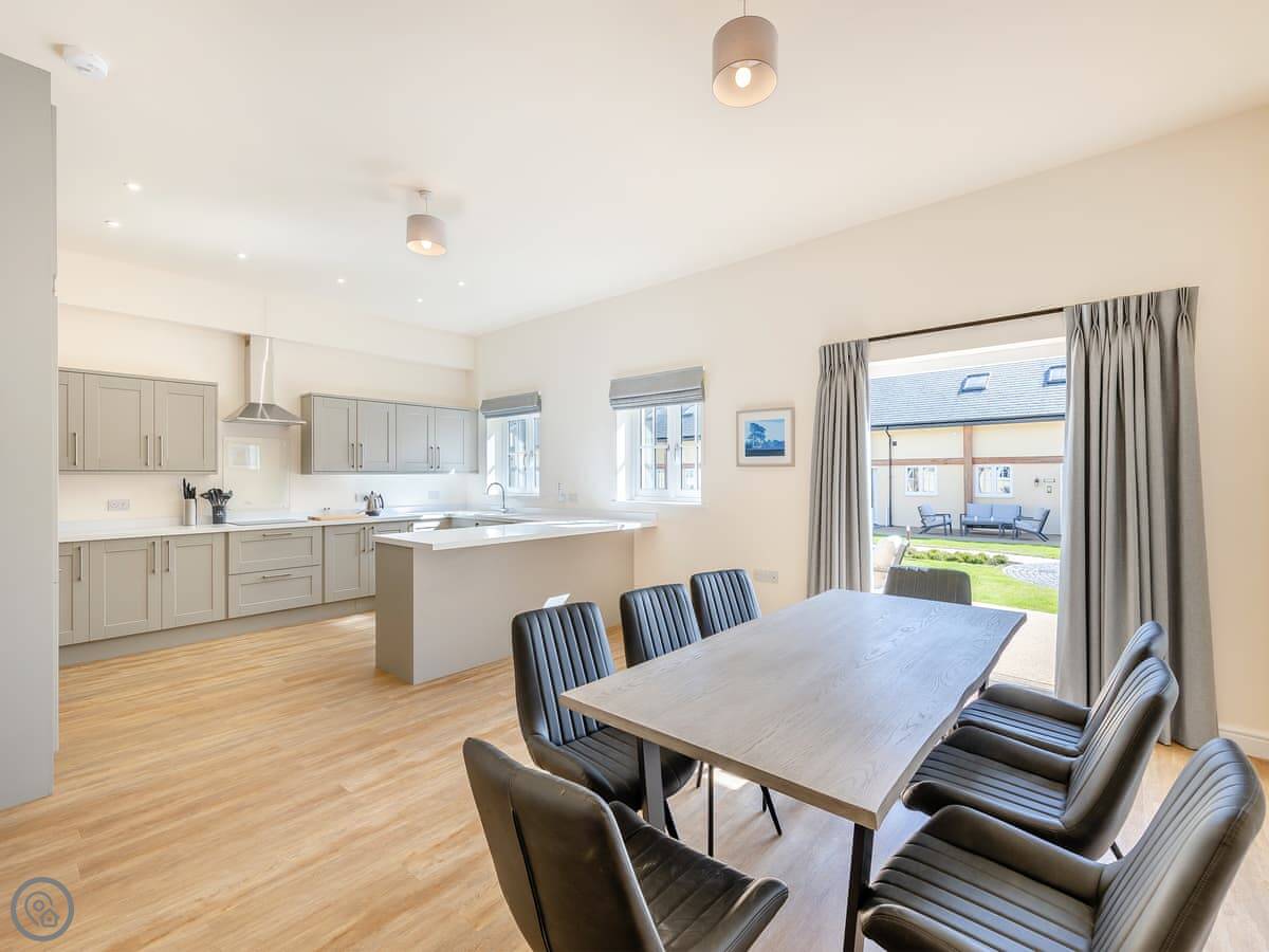 Downstairs is a kingsize bedroom with its own shower room, which is handy. The living area has a smart TV. The kitchen is open plan with bi-fold doors that open onto your own patio. There's a table and chairs out there.
