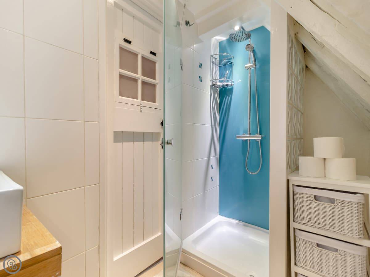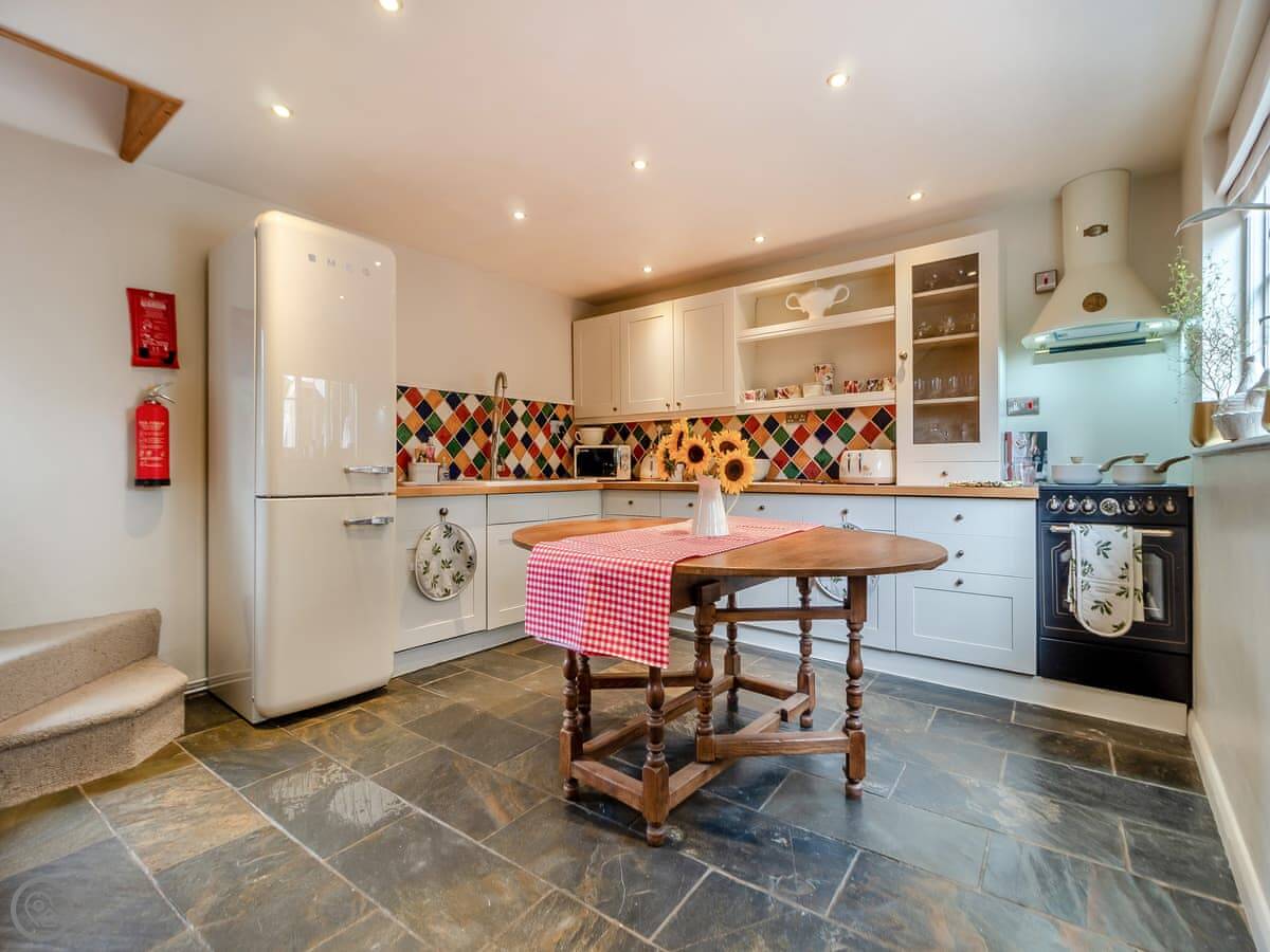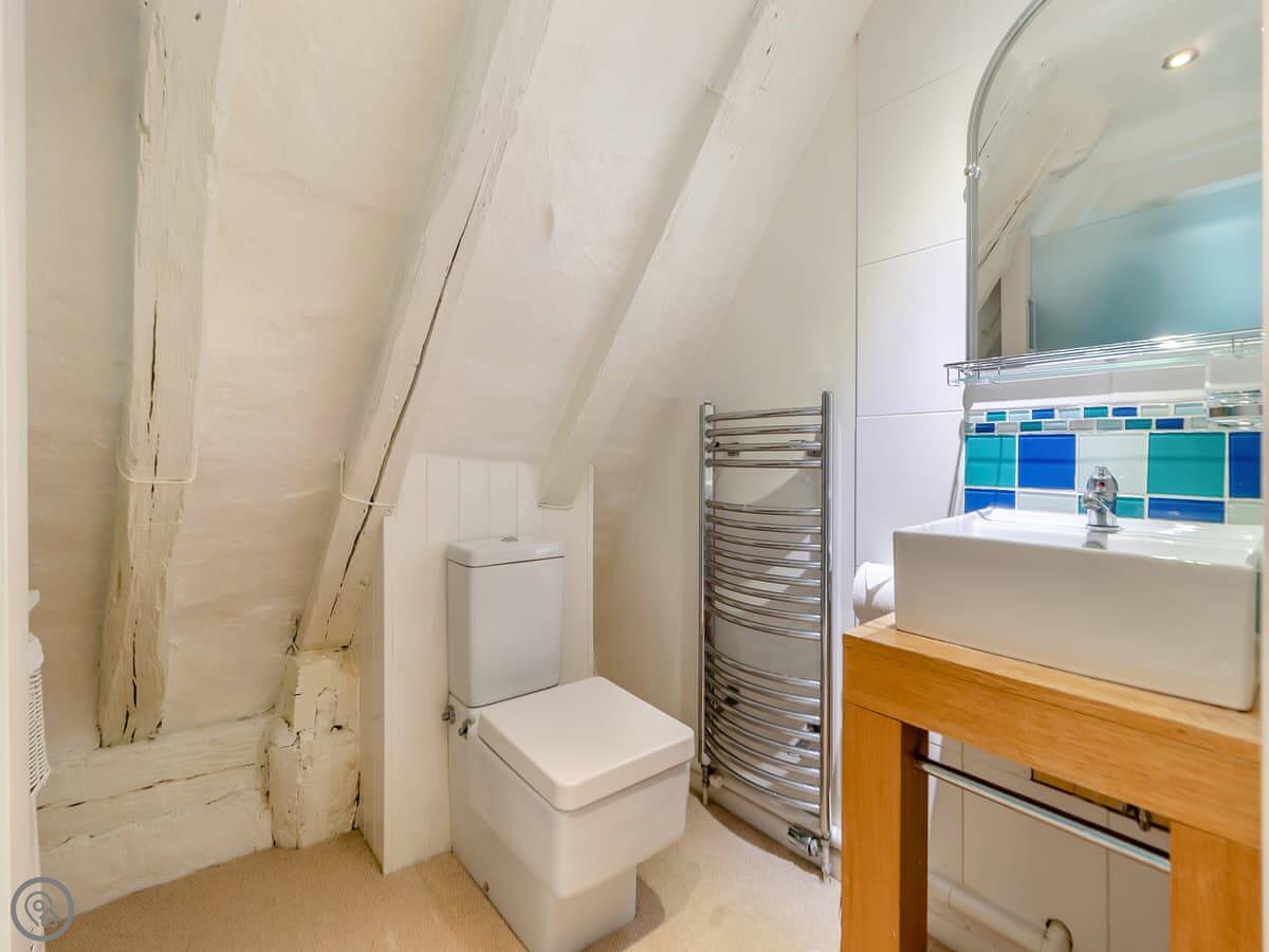 The house sleeps five. That’s three bedrooms and two bathrooms. One bathroom is an en-suite to the main bedroom. It's a 4 Star property, so it’s well-equipped and comfortable. The stairs are fairly steep, which is normal for an older house. It's got a wood-burning stove. There's a dishwasher and an Aga, plus a standard oven and hob if you’re not used to cooking on an Aga.
