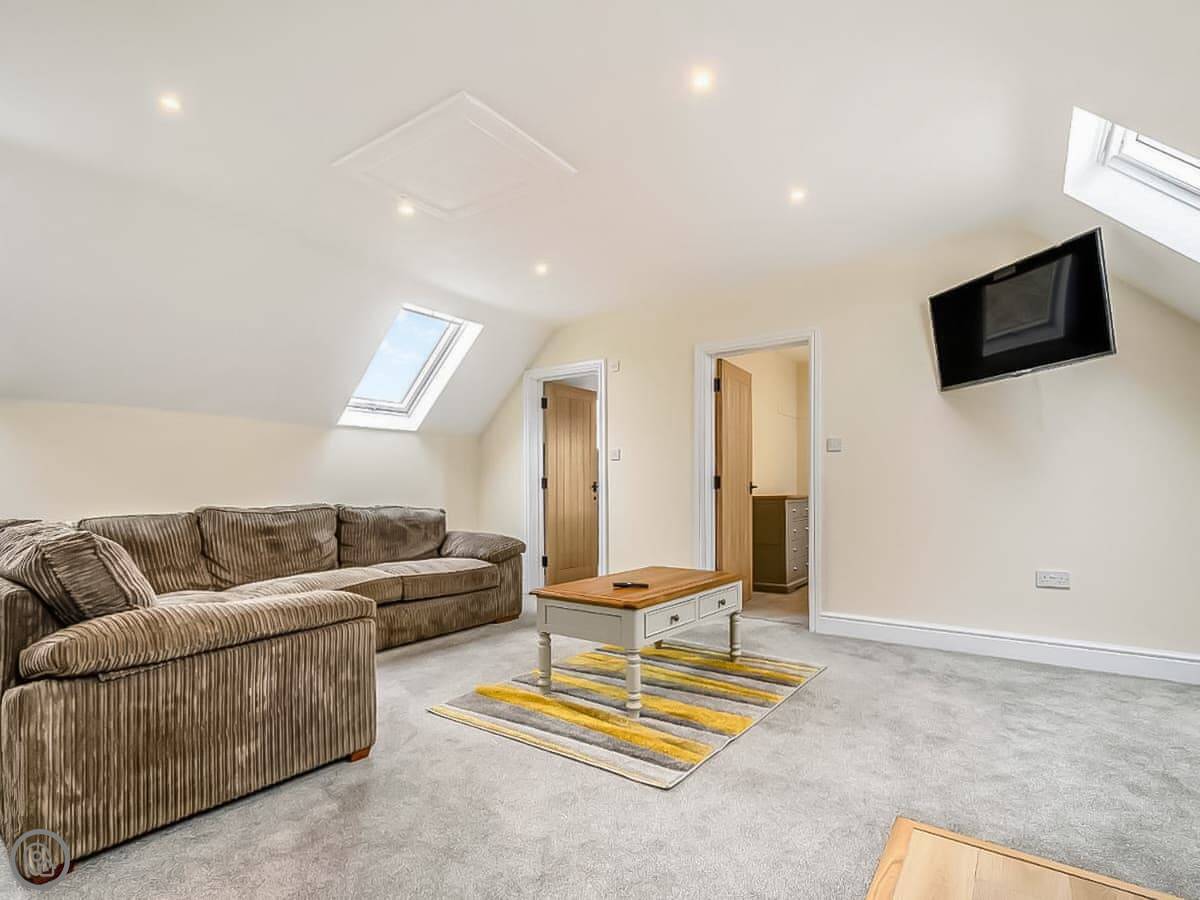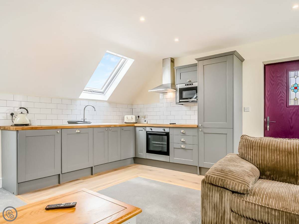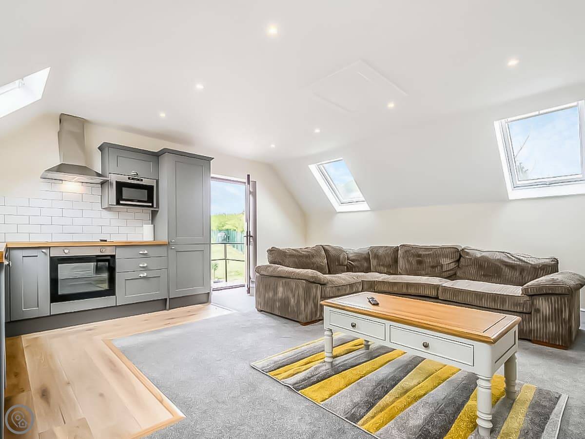 The place is open plan. There's a kitchen area with a dishwasher and a washing machine. The patio and garden are shared with the other apartments here. There's on-site parking and an electric vehicle charger.
