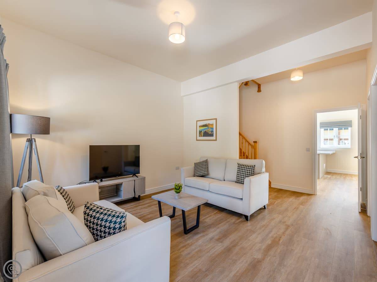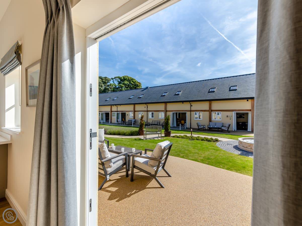 Downstairs has an open plan kitchen and living area with bifold doors leading to your own patio, a separate sitting room with a TV, and a kingsize bedroom with an ensuite shower. Upstairs there are two more kingsize bedrooms, one with an ensuite, and a twin room with a family bathroom.